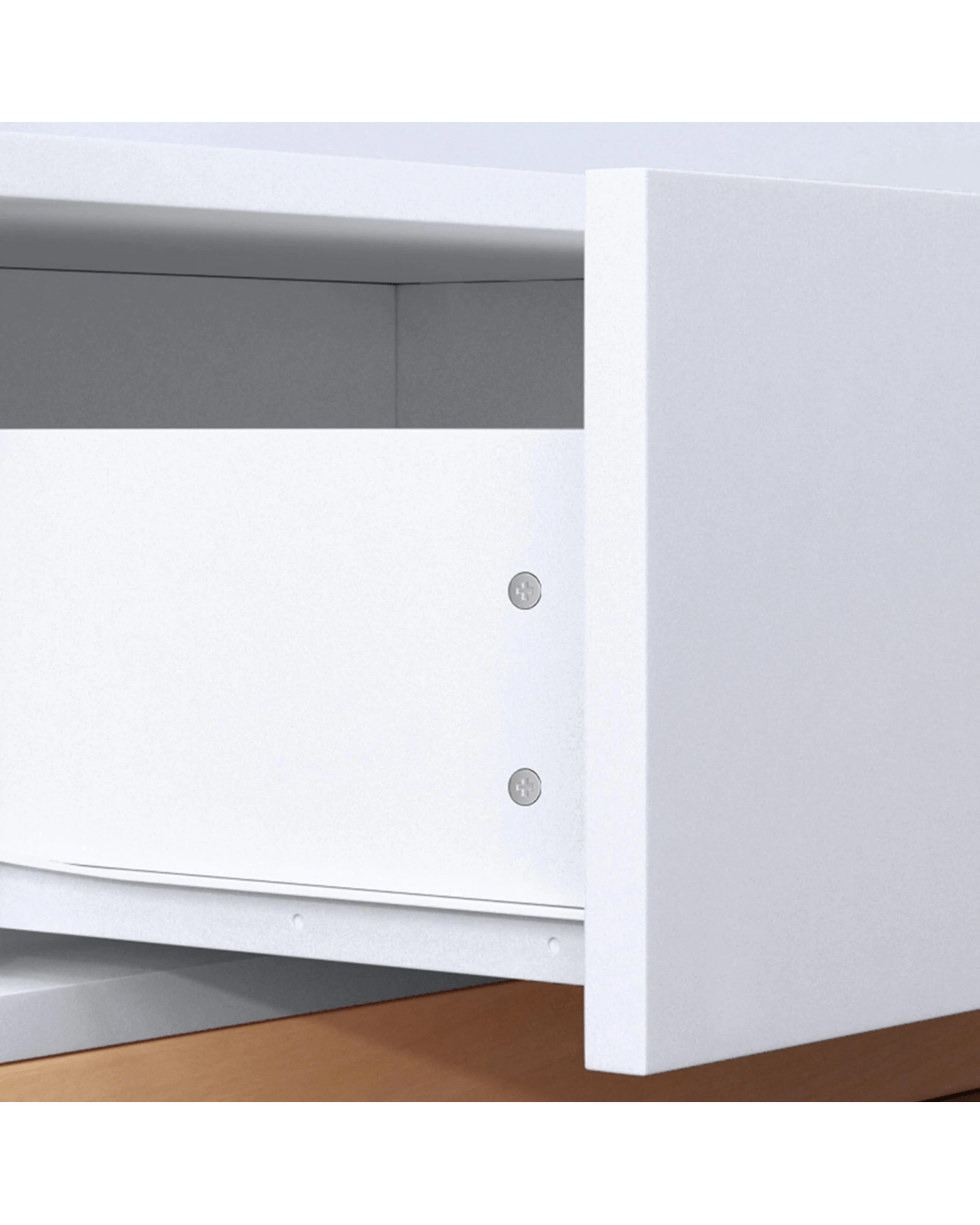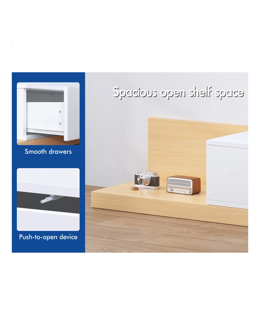 Reliable quality - Made of superior 15mm thick board, our entertainment unit is durable and resistant to scratches. Instead of flimsy paper finish, it is well made with smooth melamine finish which is easy to maintain and long lasting. Equipped with qualified sliding rails and push-to open device, the drawers quietly open and close so you can access your items with ease.