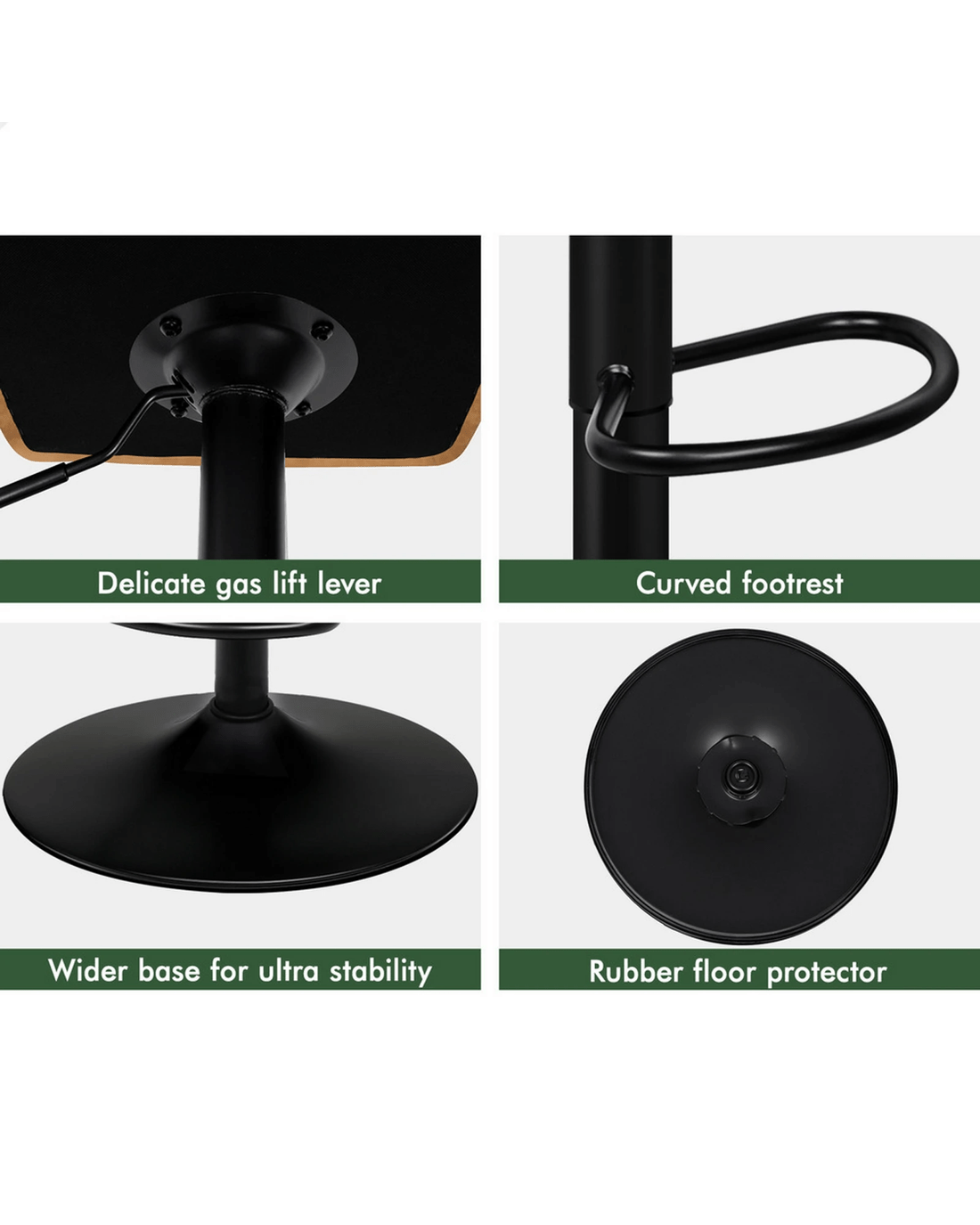 As always, we have no compromise on materials Use - ameter of the trumpet base is increased, resulting in larger supporting area, so the seat becomes more secure and stable with long-lasting durability. Better still, the black powder coated chrome base and footrest complement the stool's modern design. A rubber floor protector ring, embedded in the case, reduces noise and protects your floor by sliding smoothly when you need to move the stool.