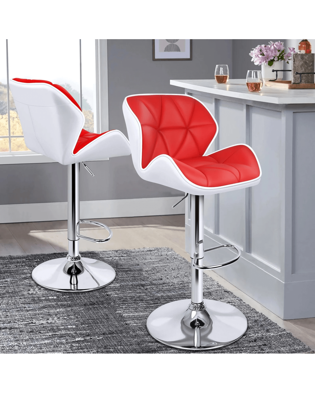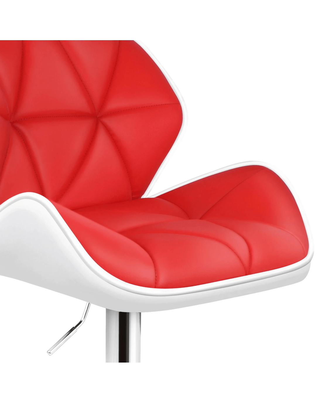 Upholstered in premium PU leather, the seat and backrest are richly padded with high-resilience foam. It presents a 360 degree swivel and adjustable seat height. The shiny chrome base and footrest complement the stool's modern design. A rubber floor protector ring reduces noise and protects your floor.