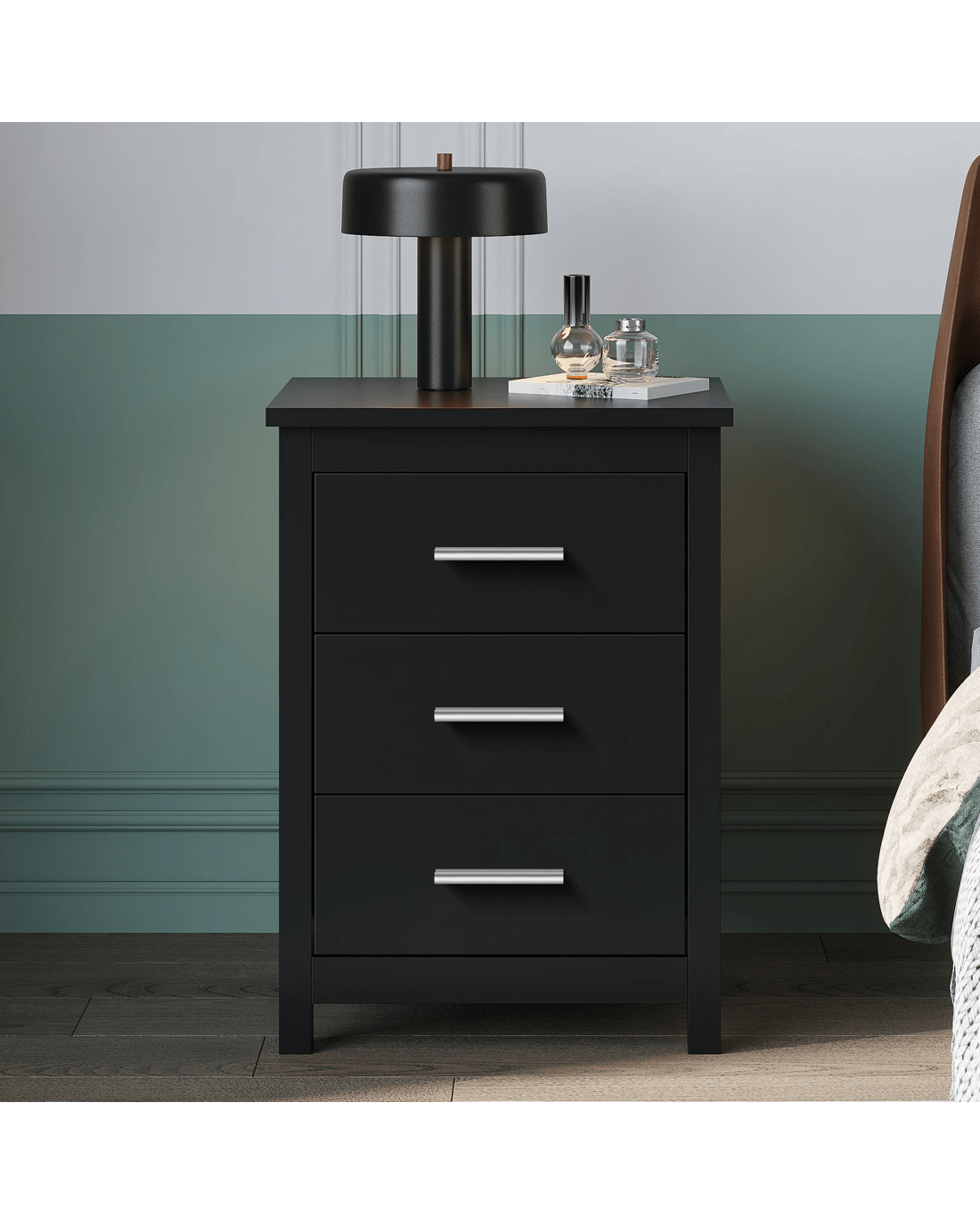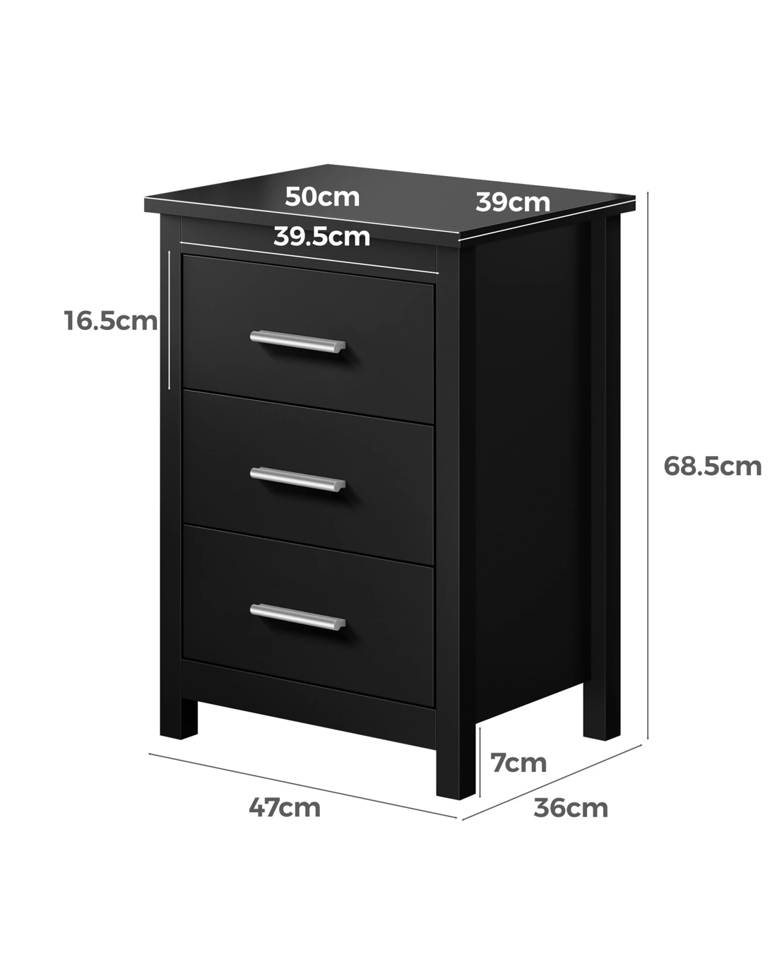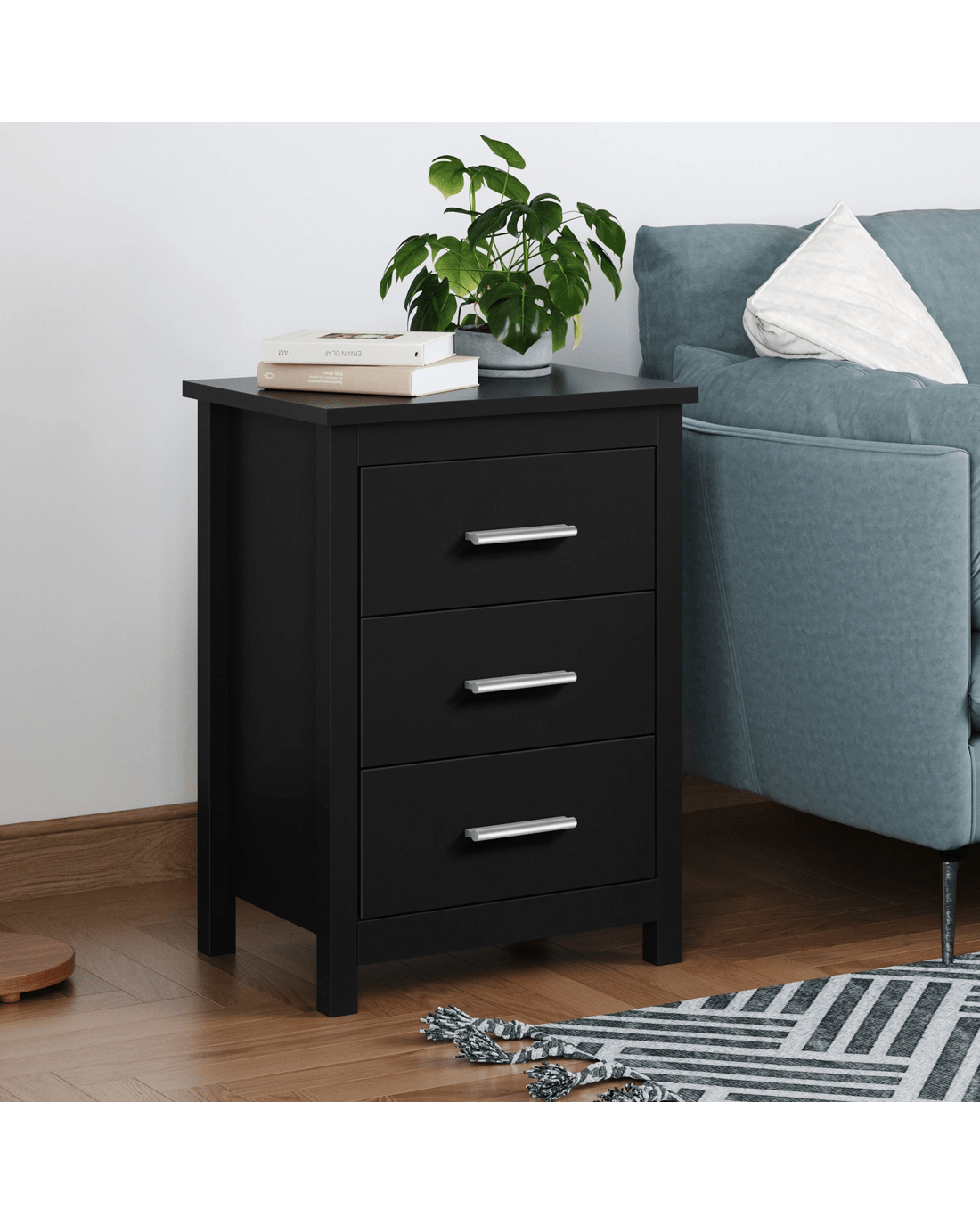 This bedside table can serve as a functional addition at the side of your bed. It provides a surface to place necessary items like a lamp, a laptop, a book, a glass of water, medicine or vitamin pills, or whatever else you may want to keep close by the bed. Not least, featuring 3 spacious drawers, it provides ample storage so that those items you store away in the drawers won't gather dust.
