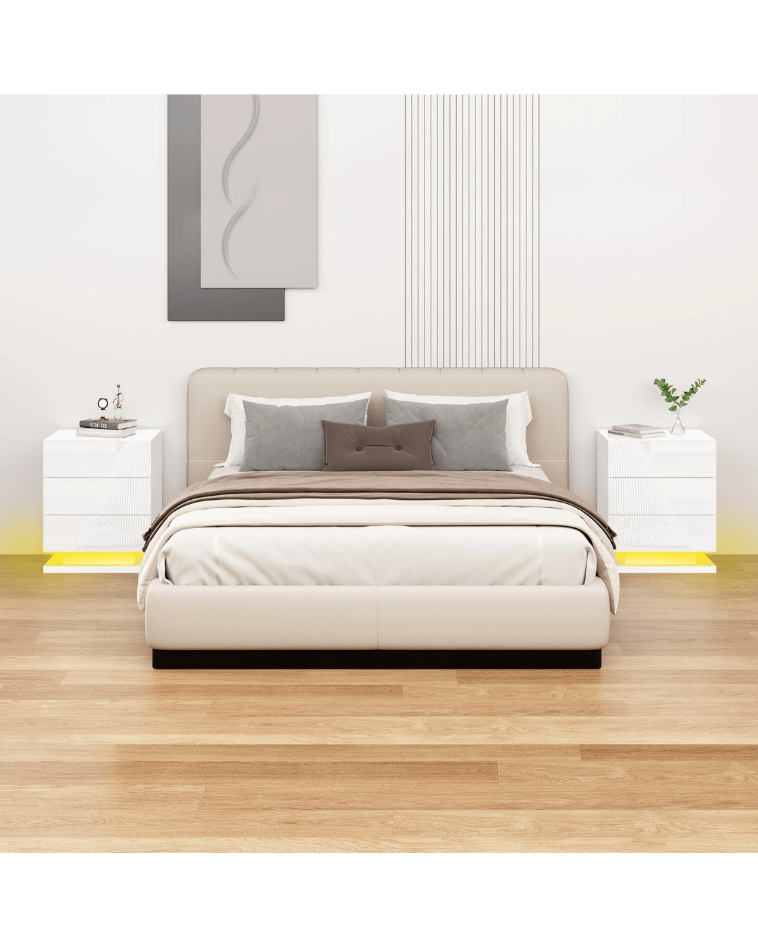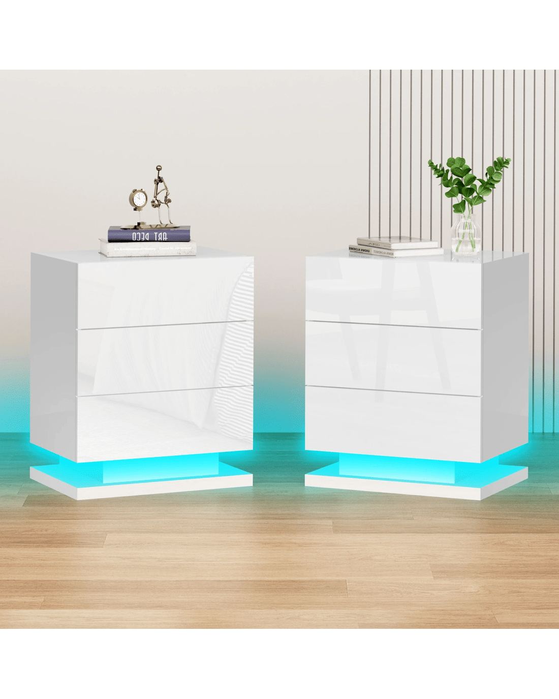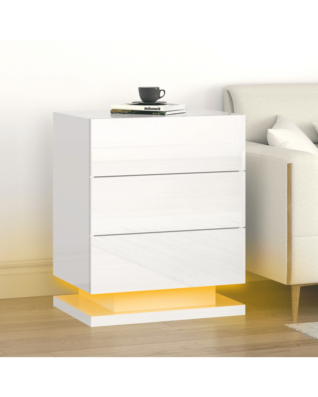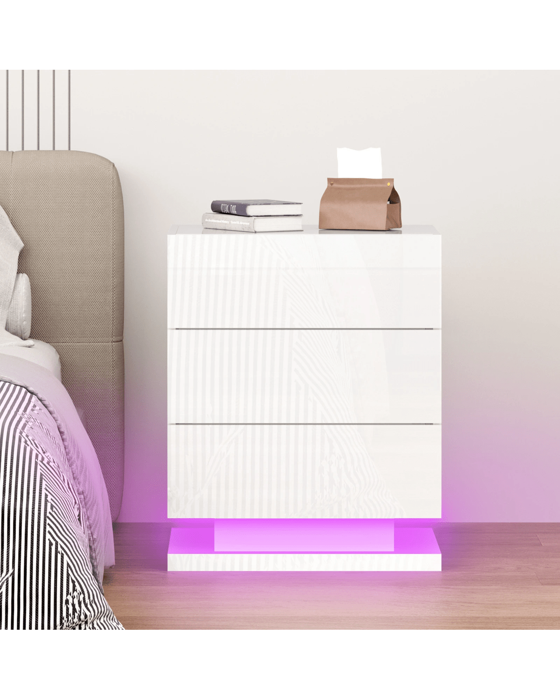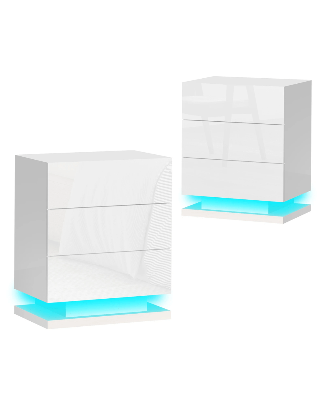 The ALFORDSON bedside table provides a surface to place necessary items like a lamp, a laptop, a book or whatever you may want to keep close by the bed. It features 3 deep drawers to provide ample storage so those items can be stored in the drawers. Practicalities aside, this bedside table is also a key decorative element in your room. Our bedside table has gorgeous high gloss on 4 sides (top, front, right and left). It helps to enhance the feeling of space with its light-reflecting properties. It comes with LED lighting and a remote control for turning light on/off or changing light colour. You will find this LED lighting especially practical in dark.