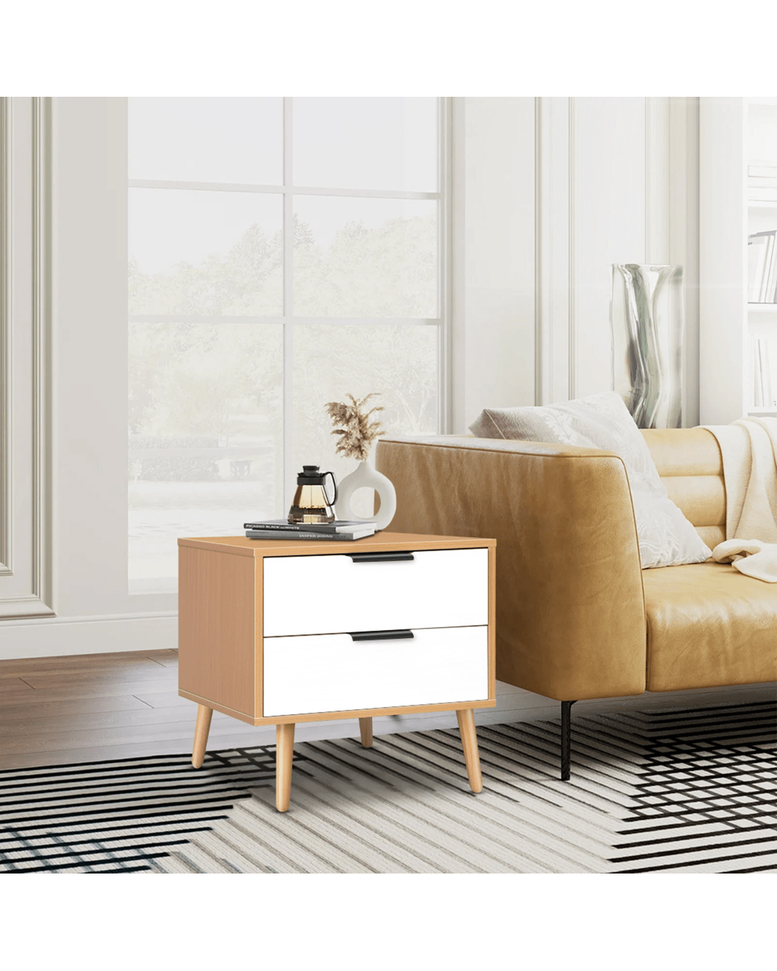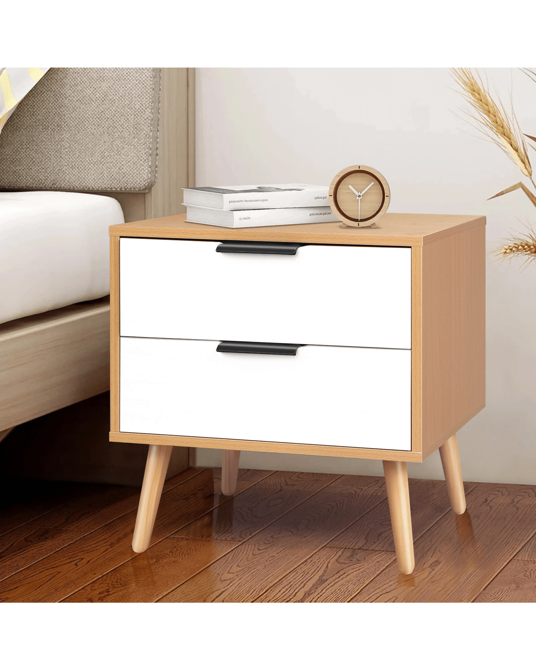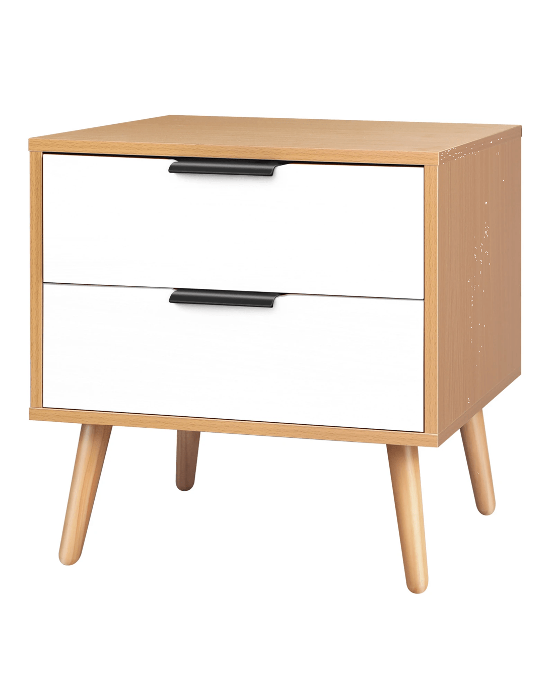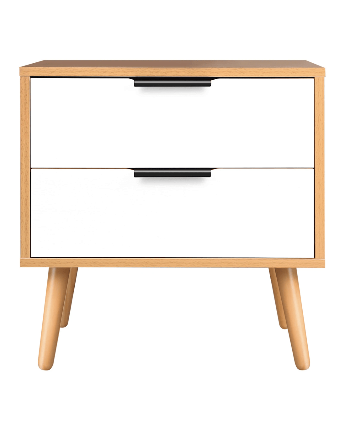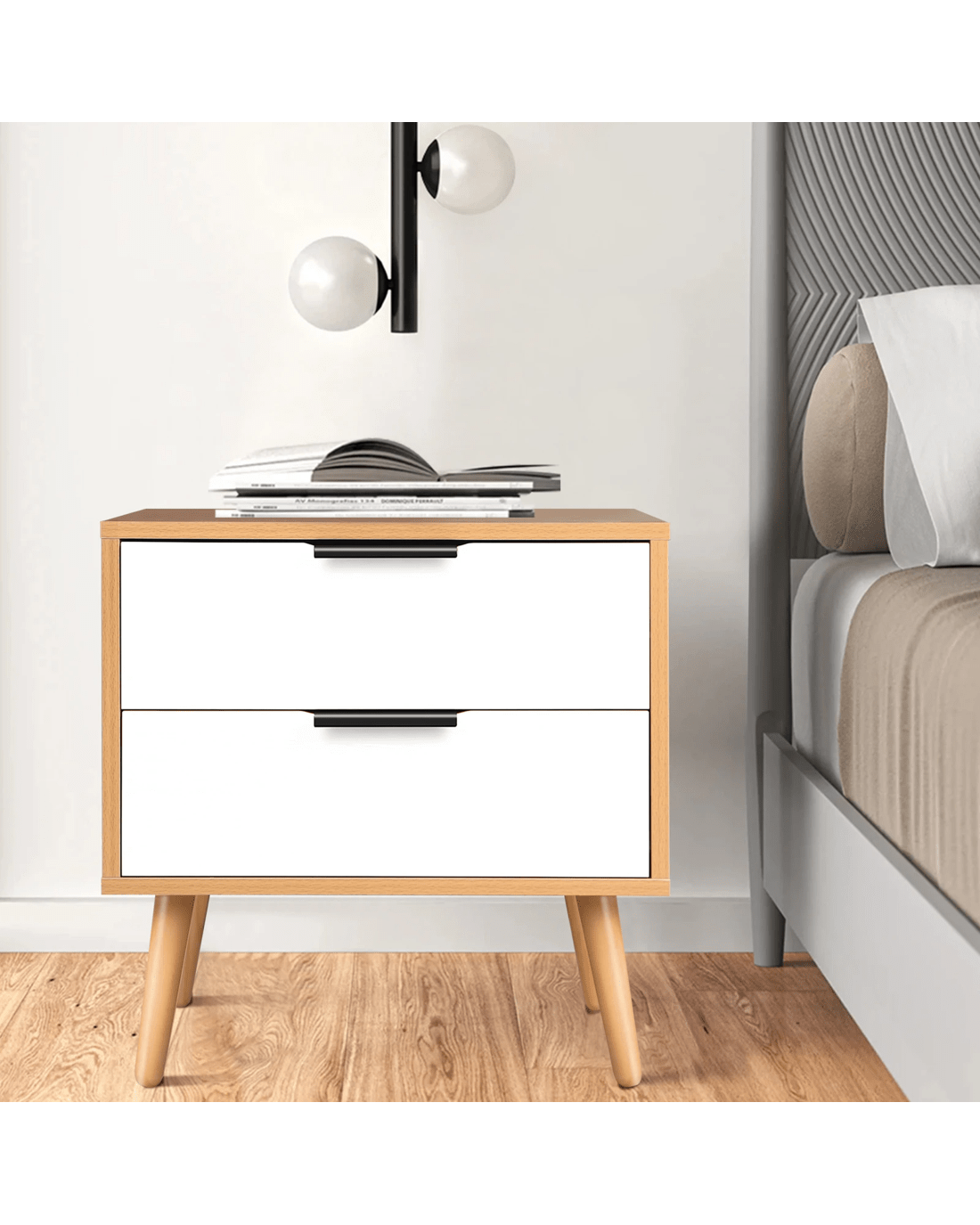 Inspired by extraordinary and authentic Scandinavian design, this bedside table can serve as a functional addition at the side of your bed. It provides a surface to place necessary items like a lamp, a laptop, a book, a glass of water, medicine or vitamin pills, or whatever else you may want to keep close by the bed. Not least, featuring 2 spacious drawers, it provides ample storage so that those items you store away in the drawers won't gather dust.
