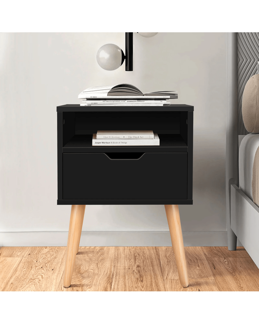 Inspired by extraordinary and authentic Scandinavian design, this bedside table can serve as a functional addition at the side of your bed. It provides a surface to place necessary items like a lamp, a laptop, a book, a glass of water, medicine or vitamin pills, or whatever else you may want to keep close by the bed. It also features a open shelf, which provides the perfect spot to slot your latest read, tablet or magazines. Not least, featuring a spacious drawer, it provides ample storage so that those items you store away in the drawers won't gather dust.