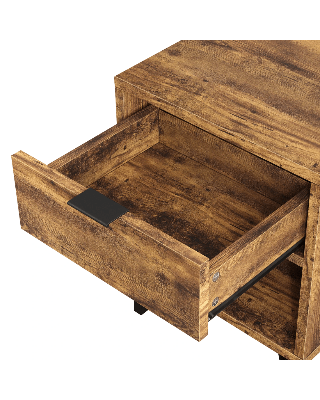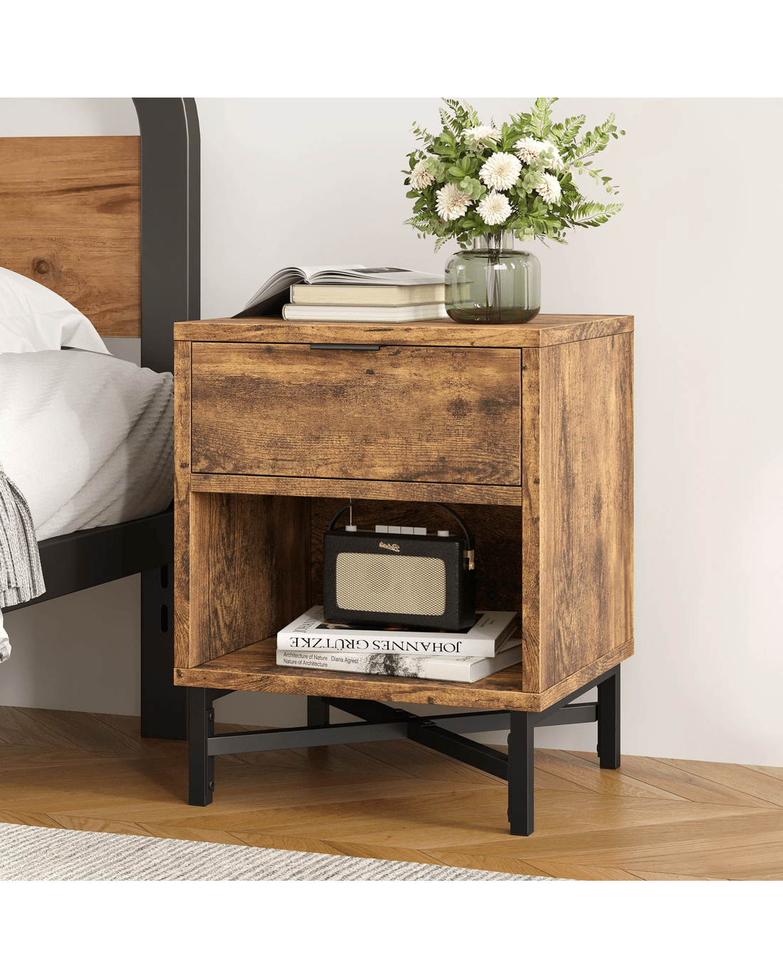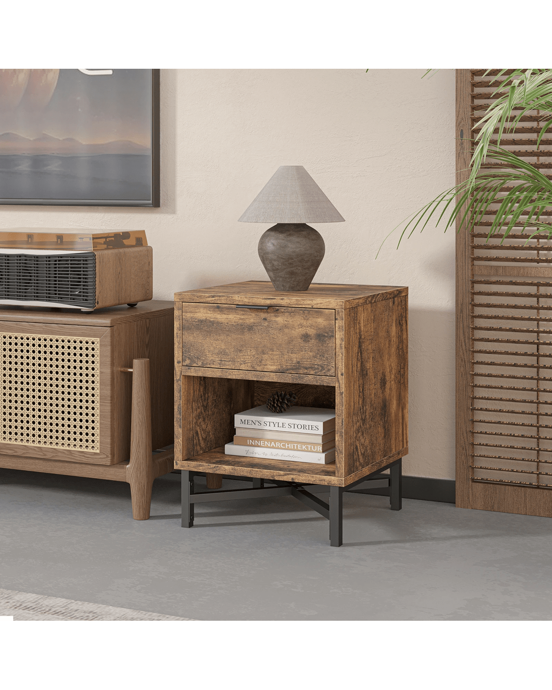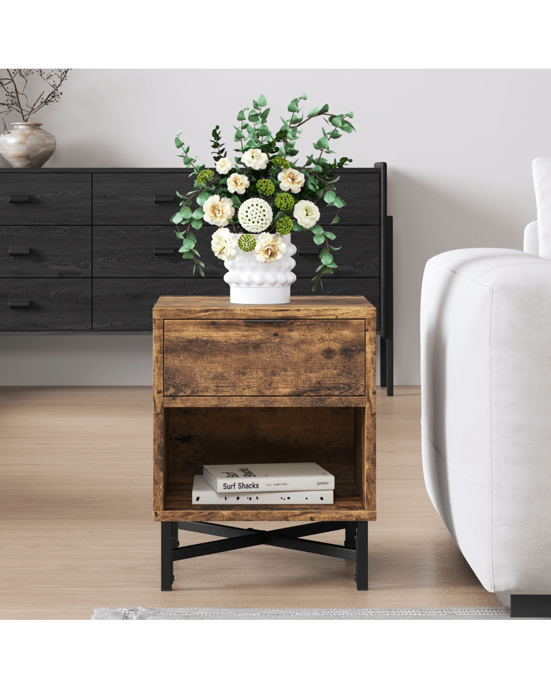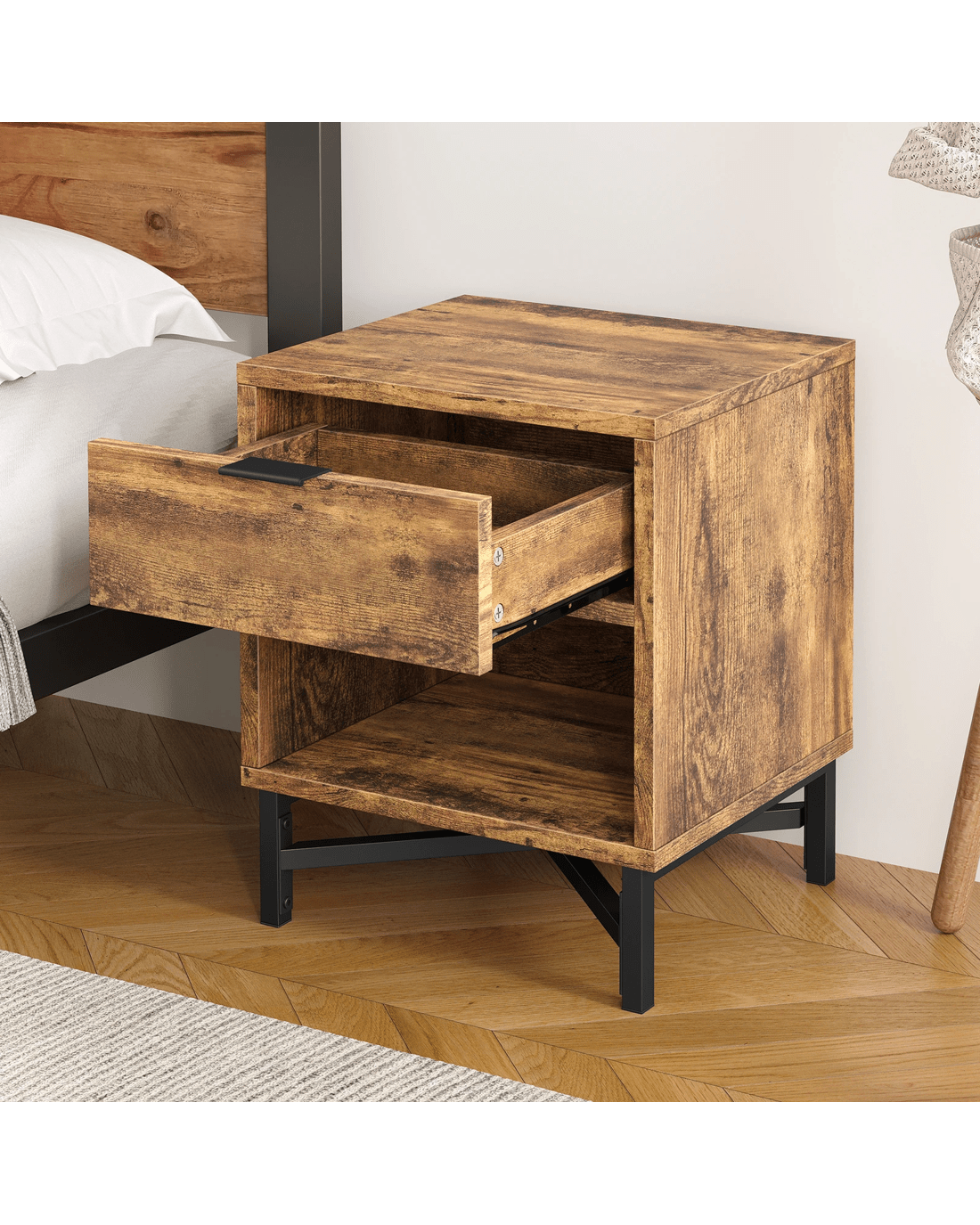 The bedside table can serve as a functional addition at the side of your bed. It provides a surface to place necessary items like a lamp, a laptop, a book, a glass of water, medicine or vitamin pills, or whatever else you may want to keep close by the bed. It also features a open shelf, which provides the perfect spot to slot your latest read, tablet or magazines. Not least, featuring a spacious drawer, it provides ample storage so that those items you store away in the drawers won't gather dust.