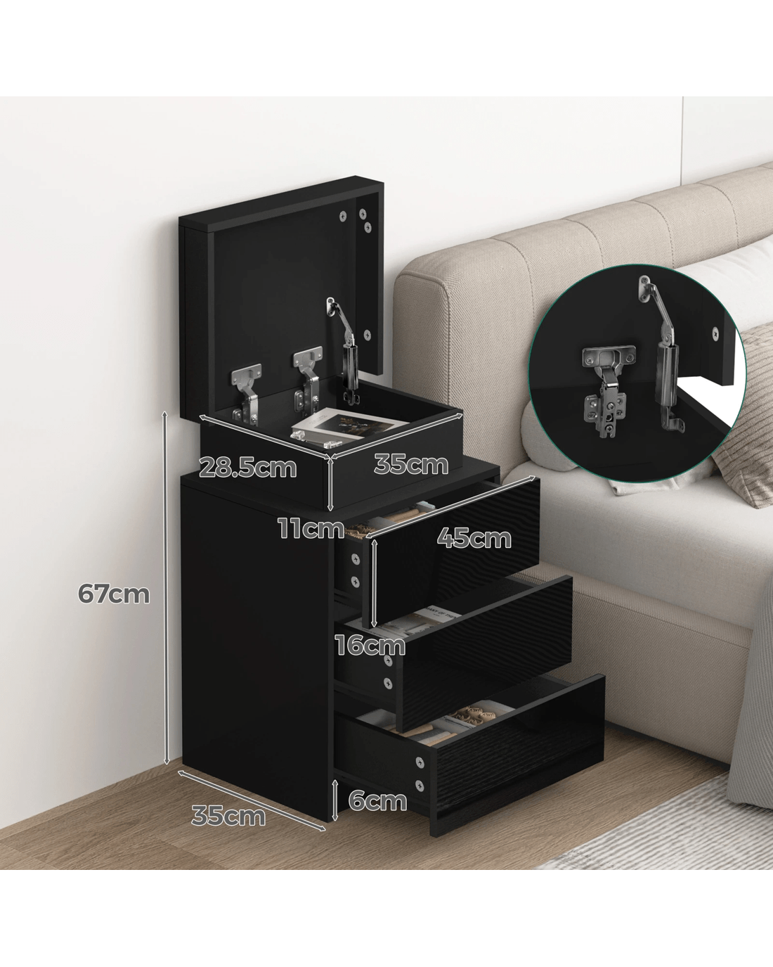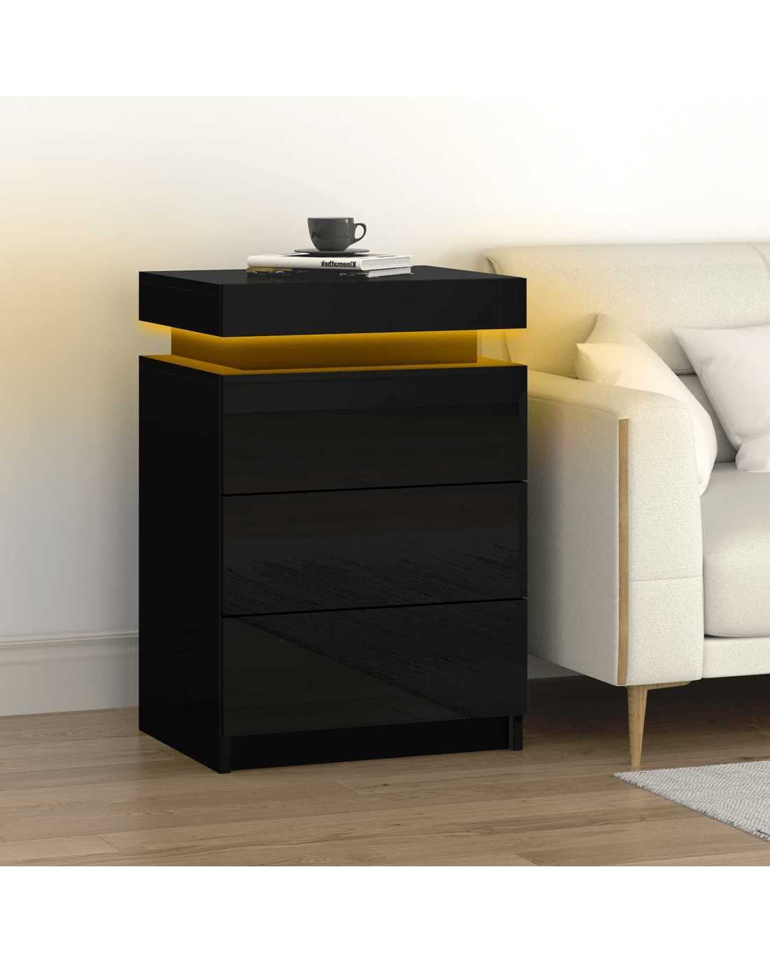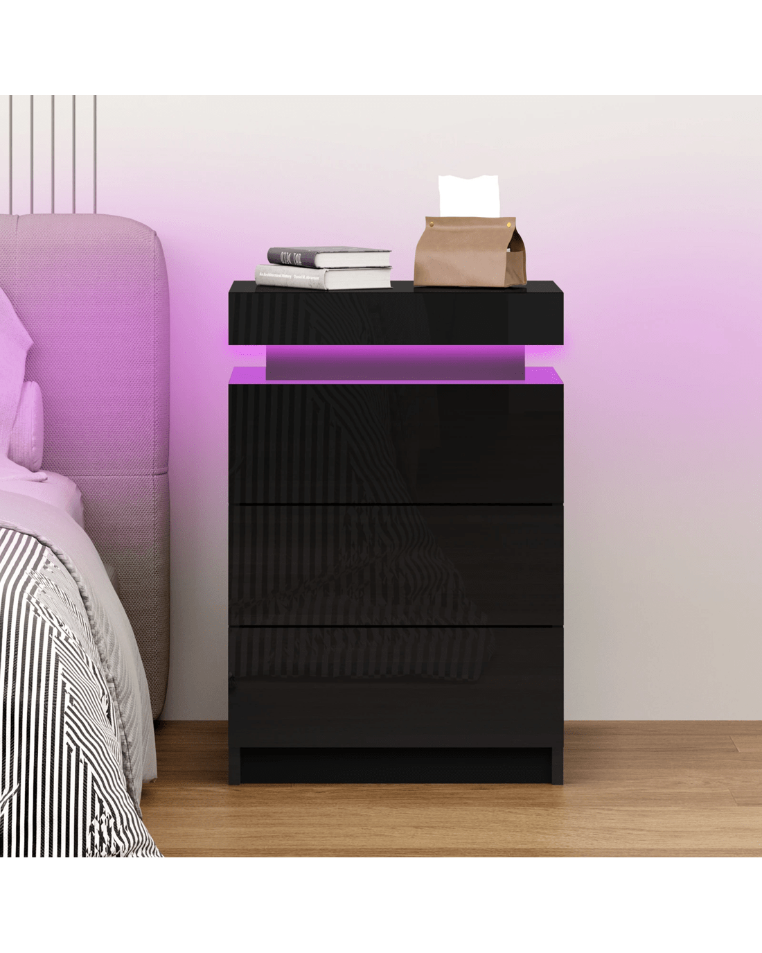 The ALFORDSON bedside table provides a surface to place necessary items like a lamp, a laptop, a book or whatever you may want to keep close by the bed. It features 3 deep drawers to provide ample storage so that those items can be stored away in the drawers. Practicalities aside, this bedside table is also a key decorative element in your room. Our bedside table has gorgeous high gloss on 4 sides (top, front, right and left sides). It helps to enhance the feeling of space with its light-reflecting properties. It comes with LED lighting and a remote control for turning light on/off or changing light colour. You will find this LED lighting especially practical in dark.