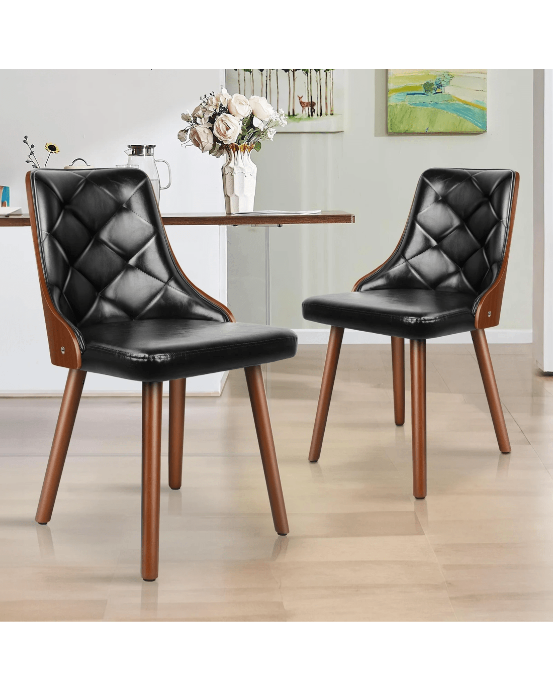 Designed with a blend of comfort and elegance, this accent chair invites you to dine in relaxation. Upholstered in premium glossy PU leather, the seat and backrest are padded with high-resilience foam. Combining its curved backrest, the kitchen chair offers a delightful seating experience.