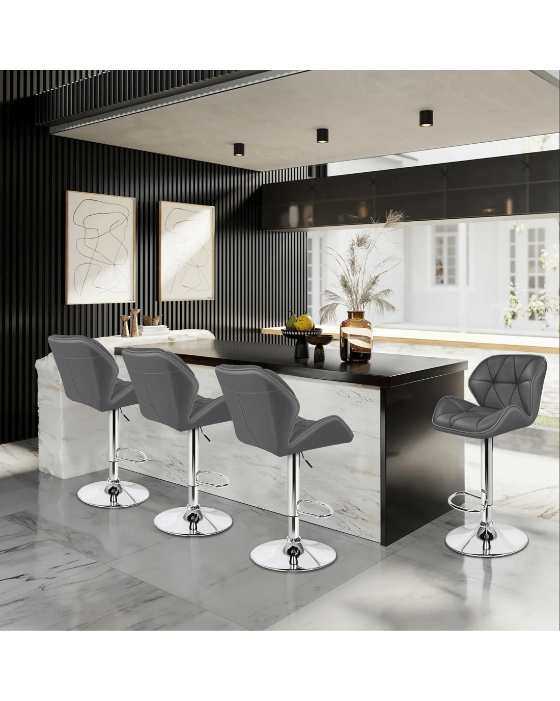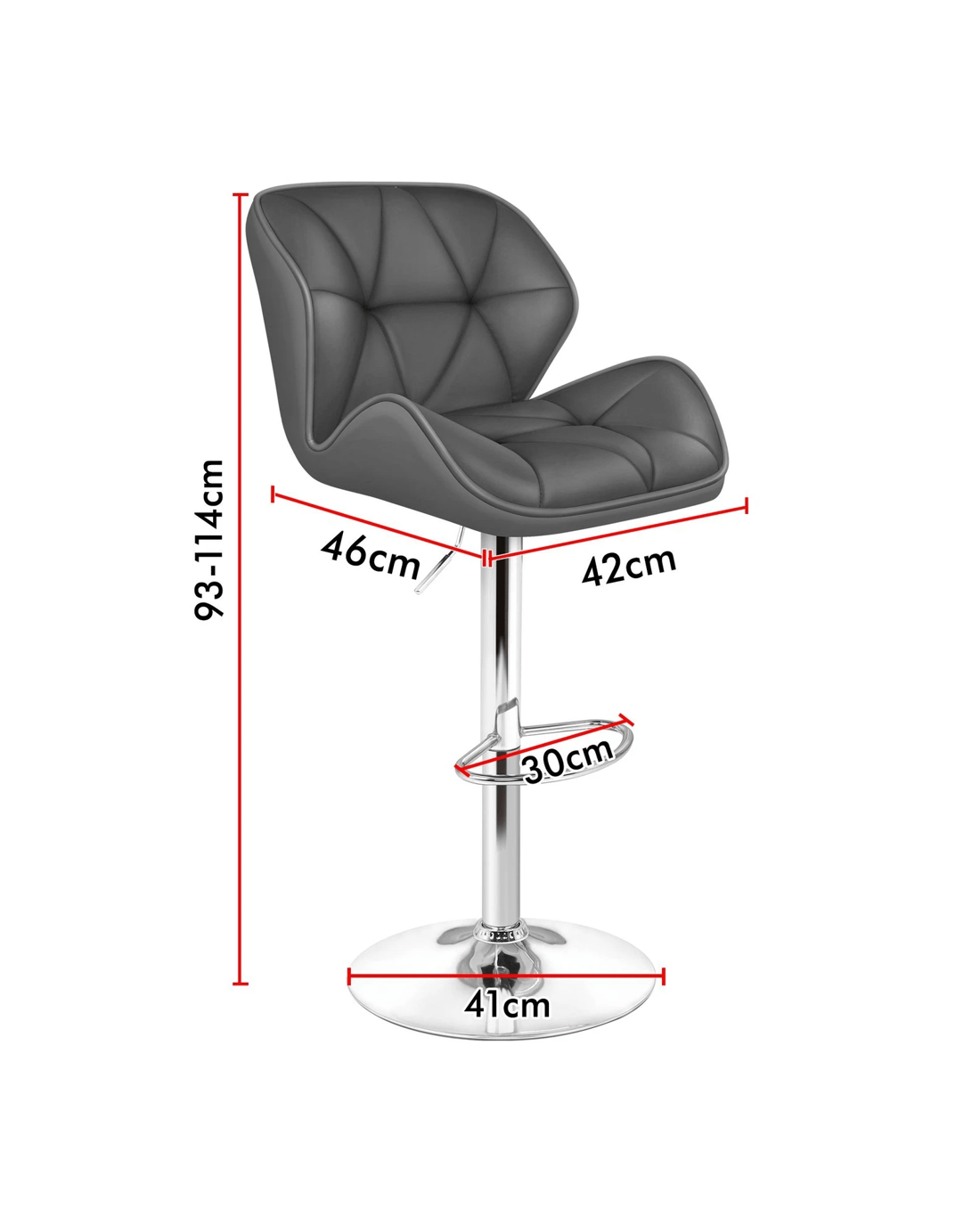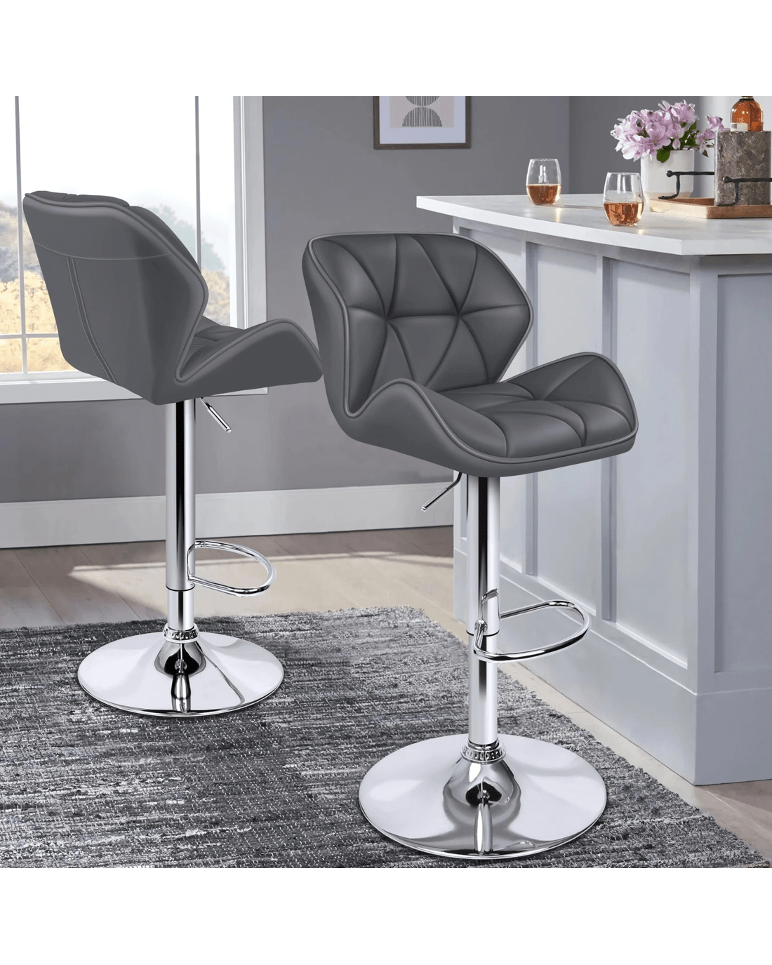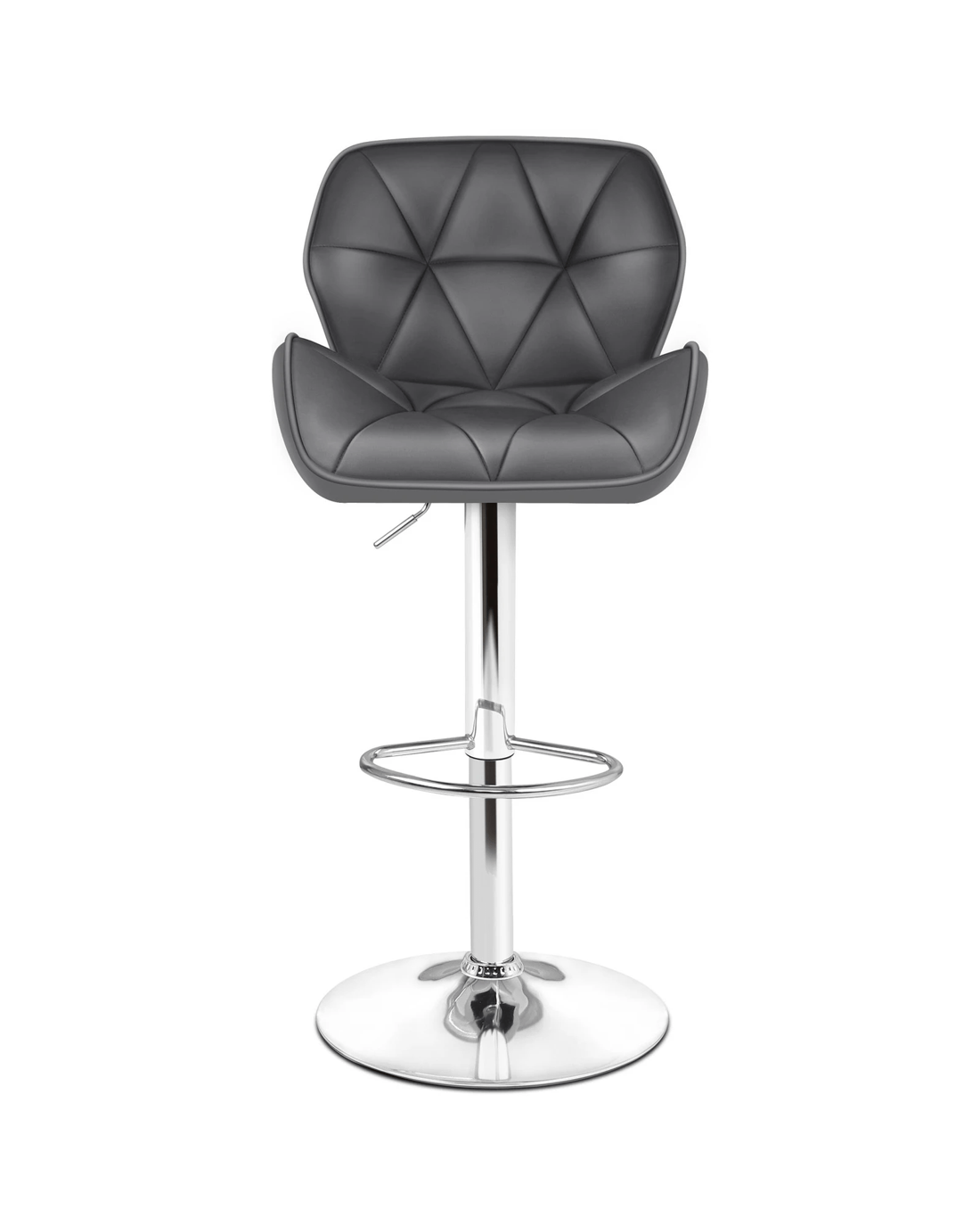 Upholstered in premium PU leather, the seat and backrest are richly padded with high-resilience foam. It presents a 360 degree swivel and adjustable seat height. The shiny chrome base and footrest complement the stool's modern design. A rubber floor protector ring reduces noise and protects your floor.