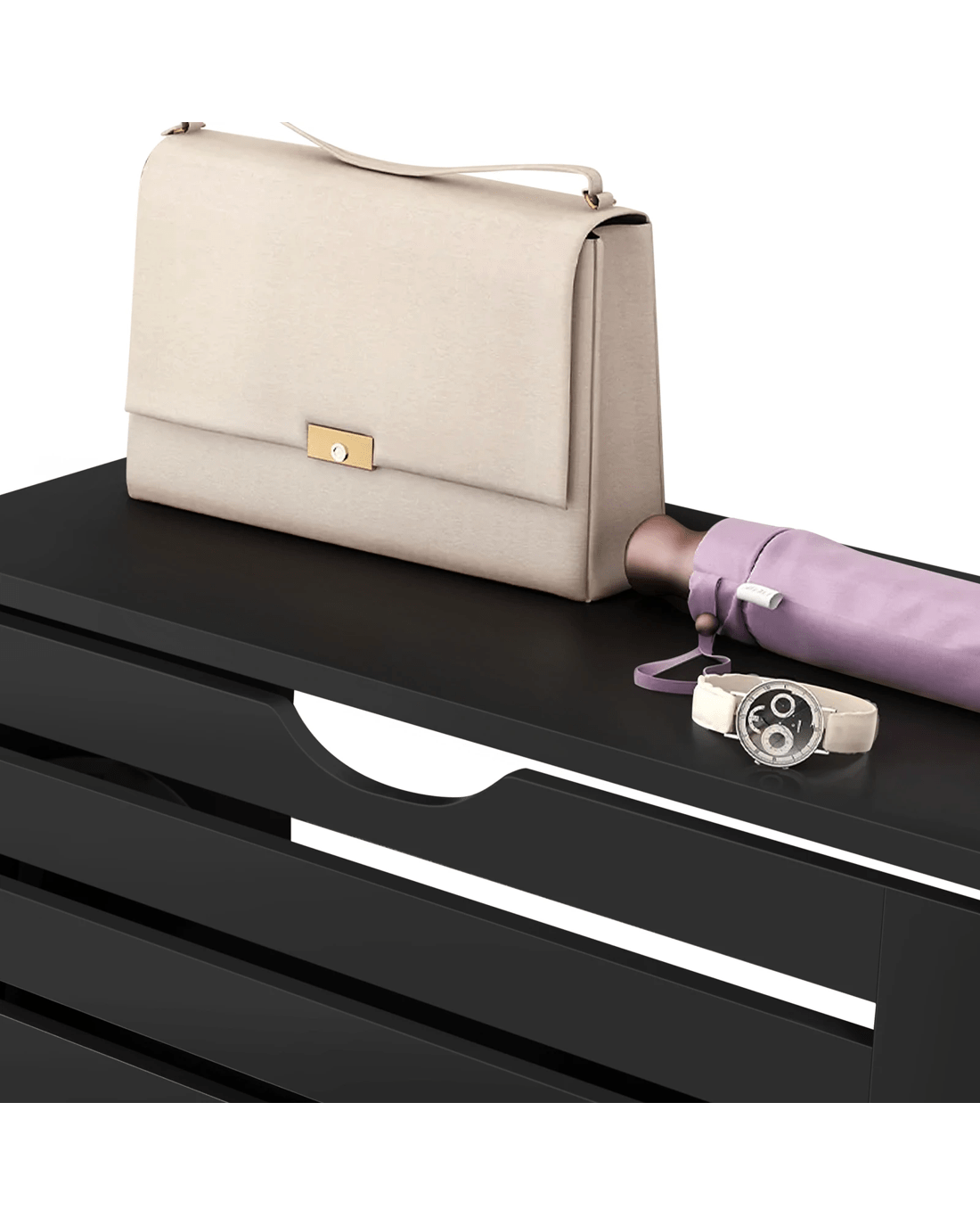 * 6 flip-down drawers with 3-tier shelves