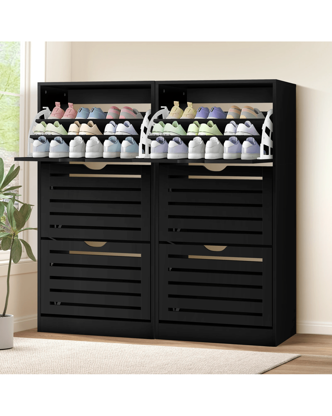 Not only will it add a touch of elegance to your home, but the shoe cabinet bench also effortlessly declutters your space. By storing up to 90 pairs of children's shoes or 40-54 pairs of ladies' or men's shoes, it feaures 3-tier shelves for each flip-down drawer, which are adjustable according to the size of your shoes: flat shoes, high heels, sneakers or slippers. Slits within the doors enable air circulation and prevent mould growth on your shoes.