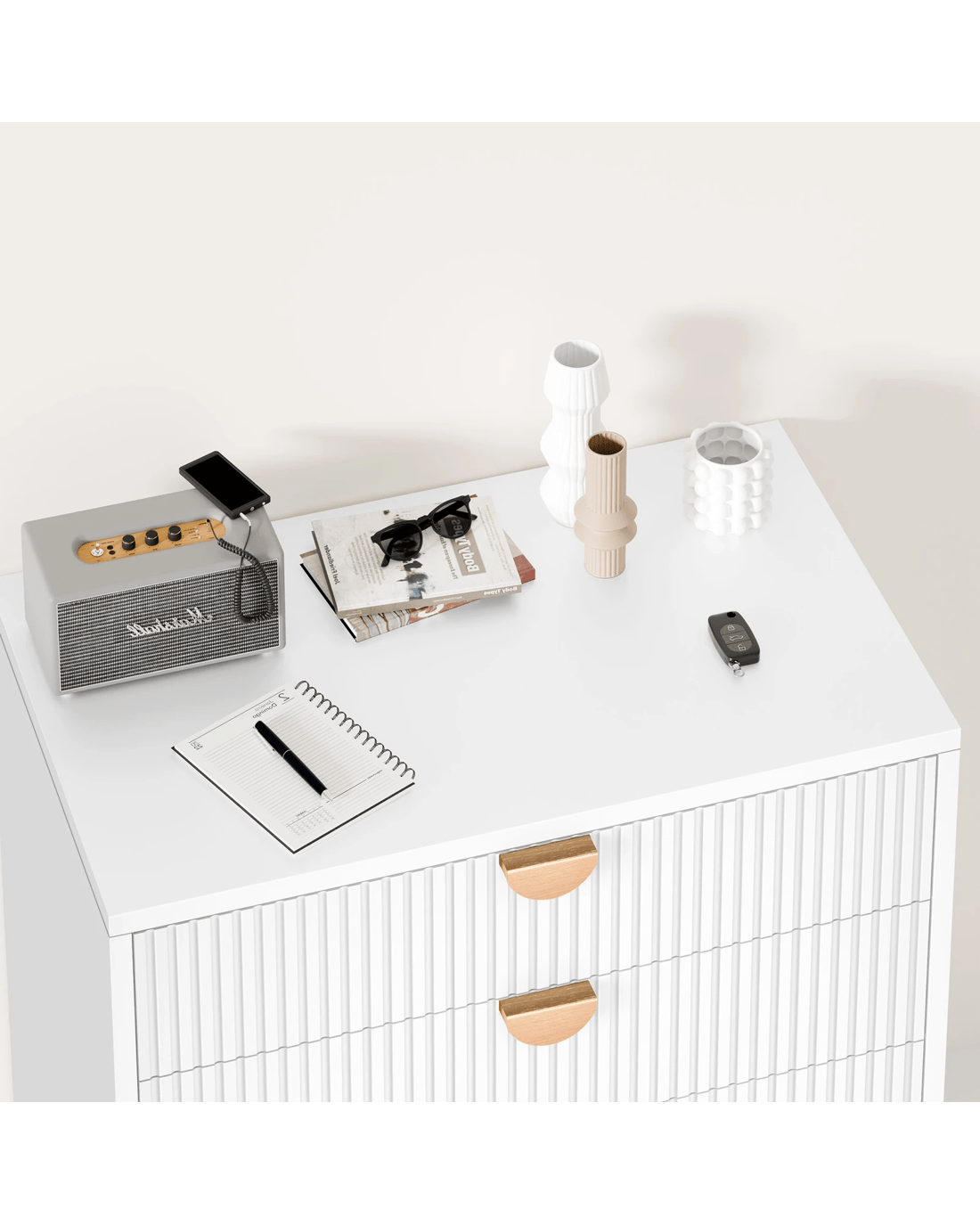 Crafted with luxury elegance, this chest of drawers blends unique fluted design and clean lines, making it a seamless fit for any space regardless of the style of your home. More than just a chest of drawers, it doubles as a chic bedroom tallboy or a functional hallway dresser, adding a touch of sophistication wherever it goes.