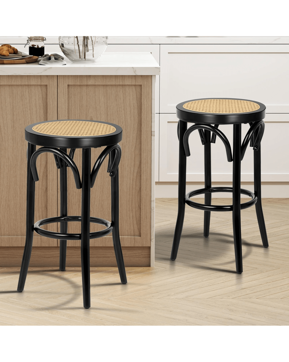 Backless barstool often gives a cleaner and sleeker look. They are also perfect if you are looking to save space and prefer to keep stools hidden beneath your counter. Prop up your feet on the footrest as you enjoy brunch or a late-night snack. As always, we have no compromise on materials Use - th an extra layer of mesh, the rattan seat is designed to be long-lasting durability. It also features adjustable leveler on each leg to provide stability on uneven surfaces.