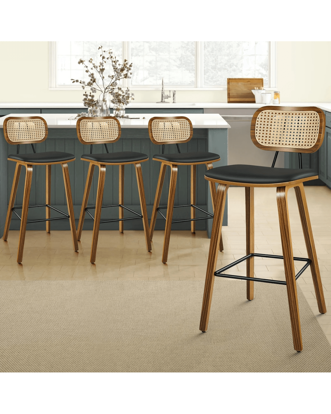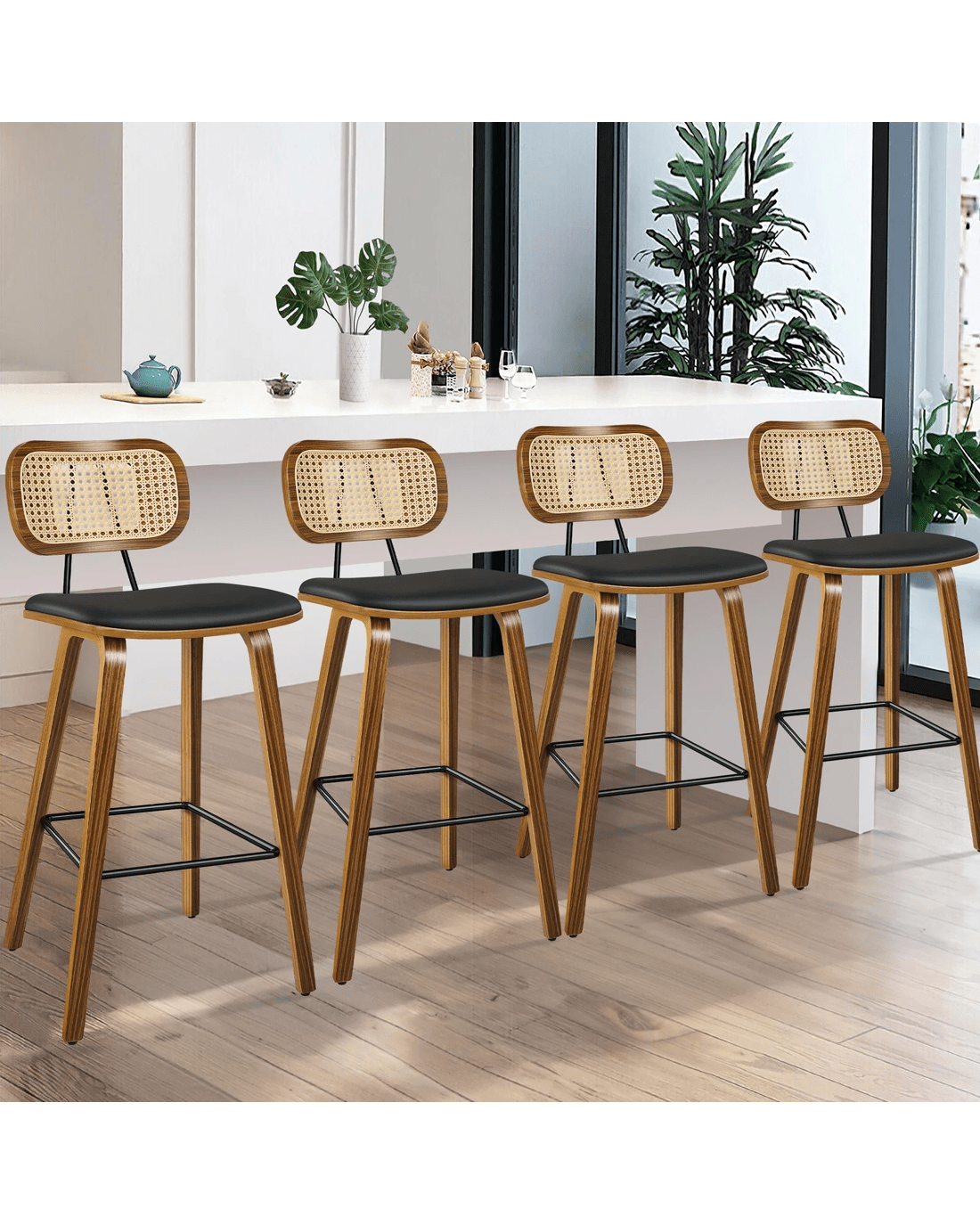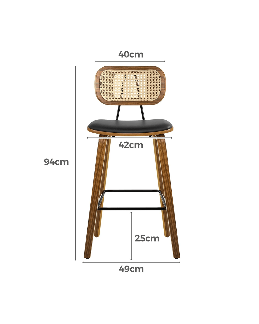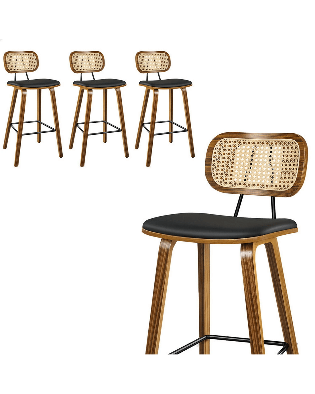 Alfordson 4x Bar Stools Kitchen Vintage Leather Seat Rattan Chair Wooden - Black
