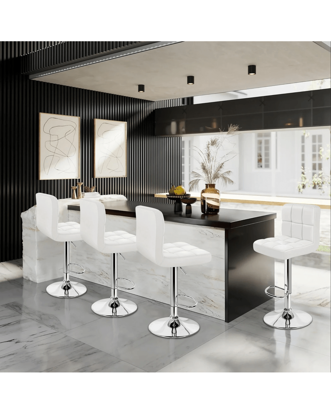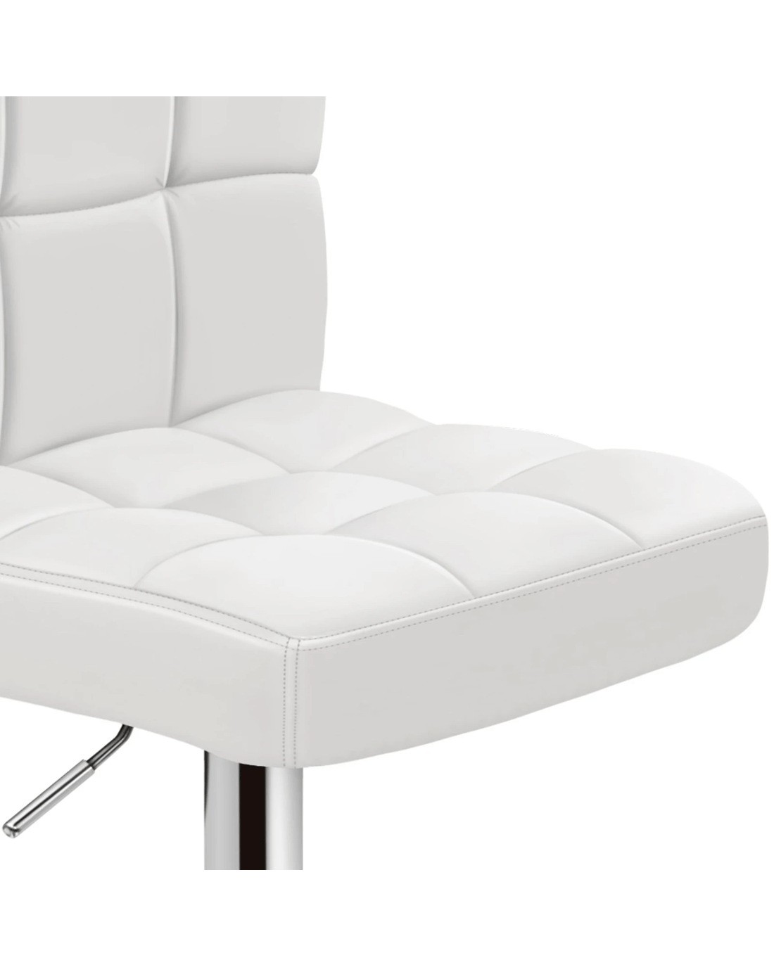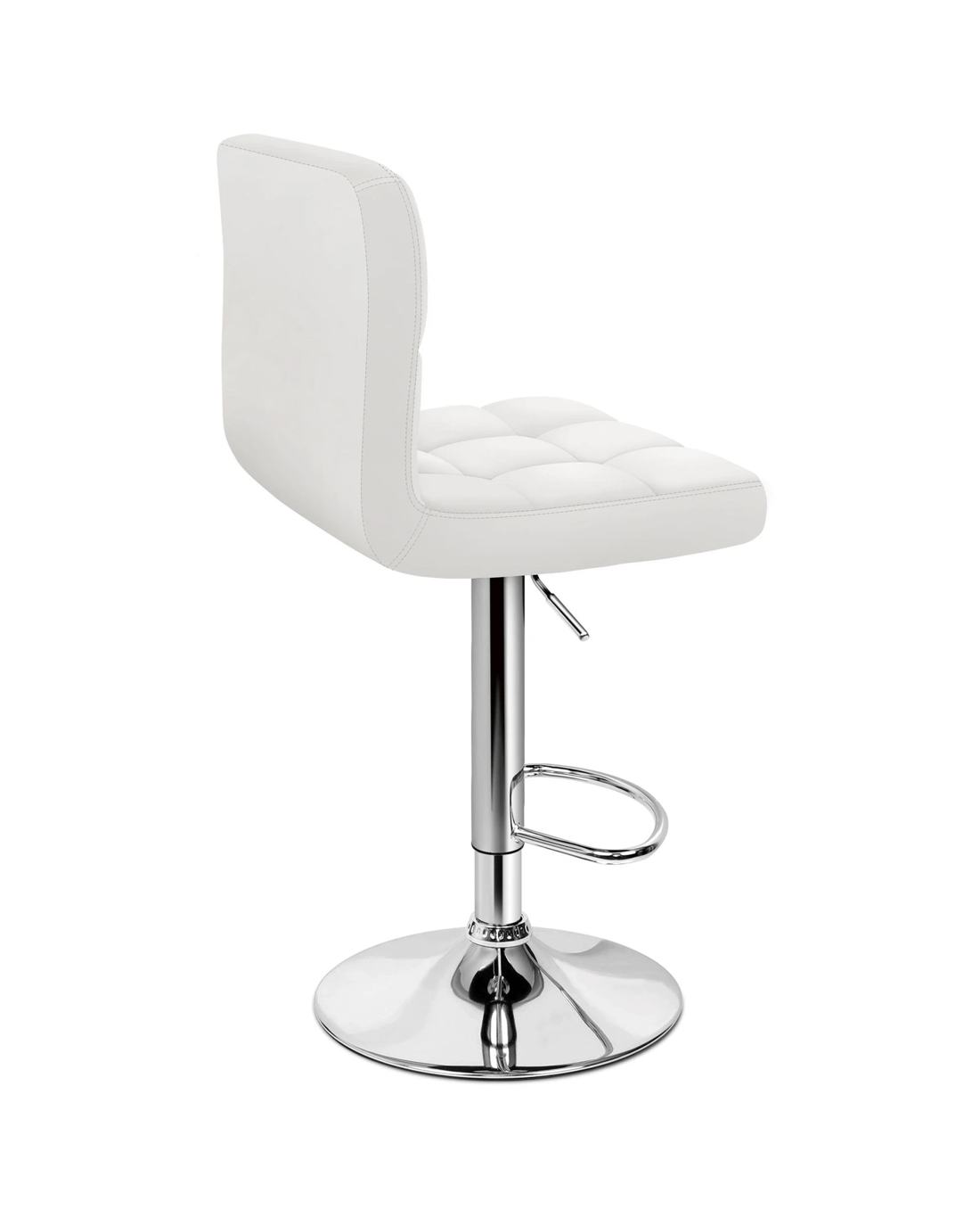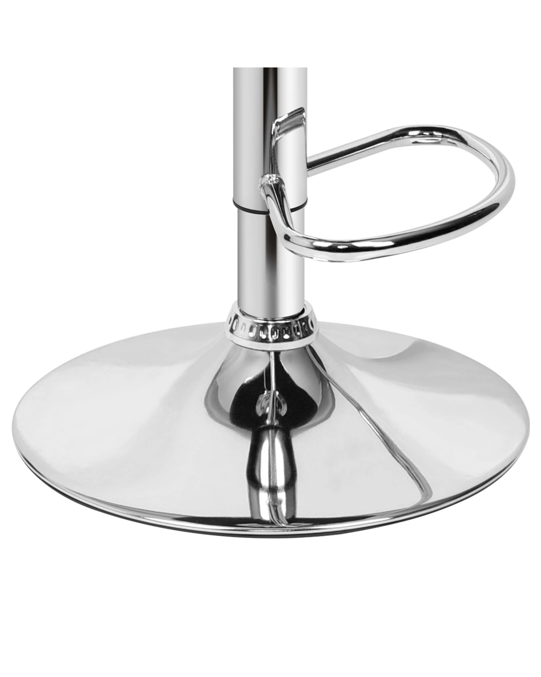 Upholstered in premium PU leather, the seat and backrest are richly padded with high-resilience foam. It presents a 360 degree swivel and adjustable seat height. The shiny chrome base and footrest complement the stool's modern design. A rubber floor protector ring reduces noise and protects your floor.
