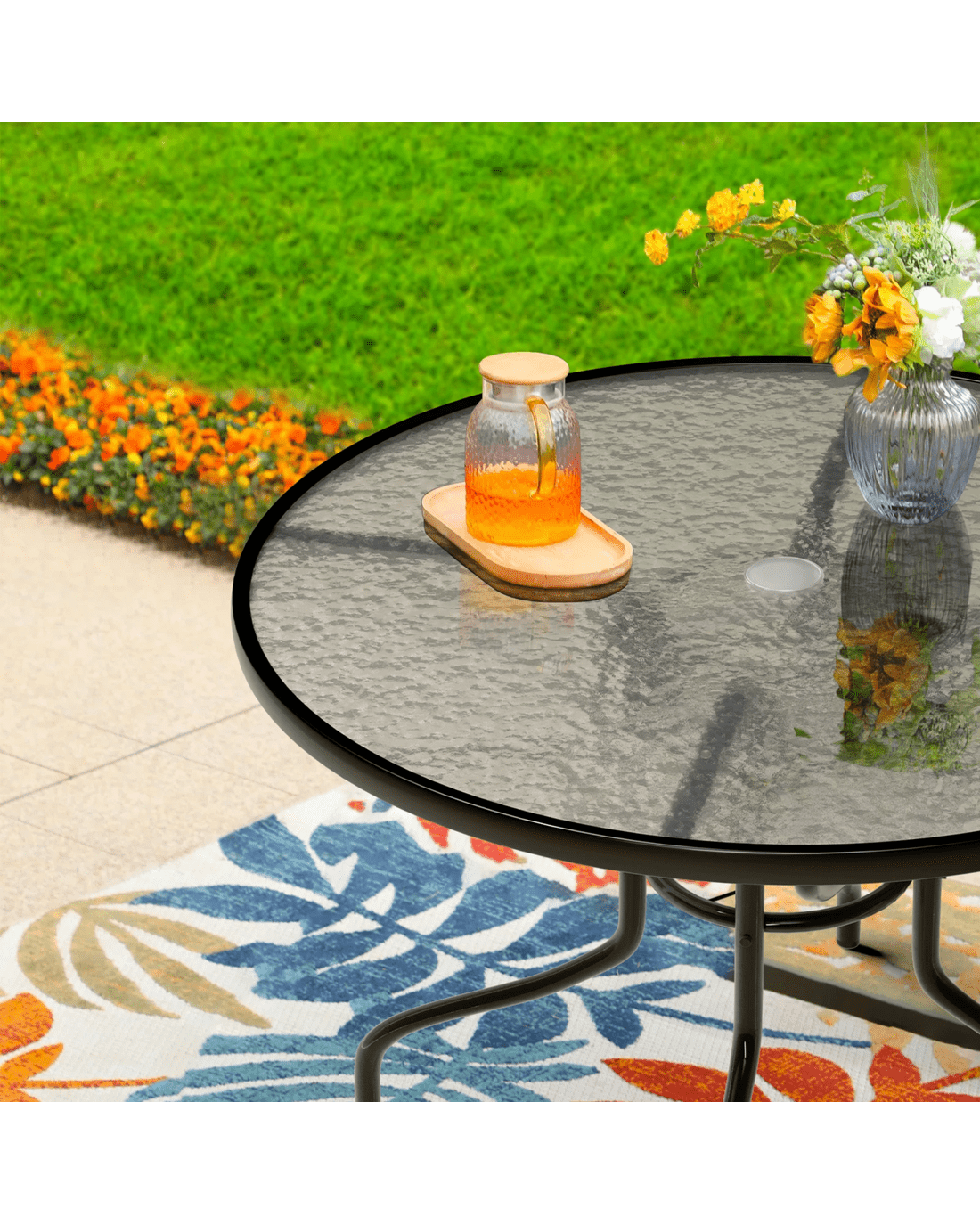 Spacious dining table - Our dining table in the set features unique outlook. With a built-in parasol hole with cover, it's convenient to install a parasol for a shade when the sun is shining brightly during outdoor time. And cover it up for a flat and smooth table when not necessary. Features with tempered glass table top, it is durable and Safe -