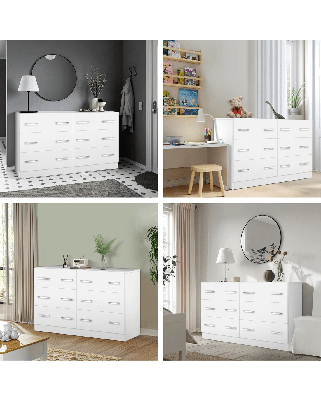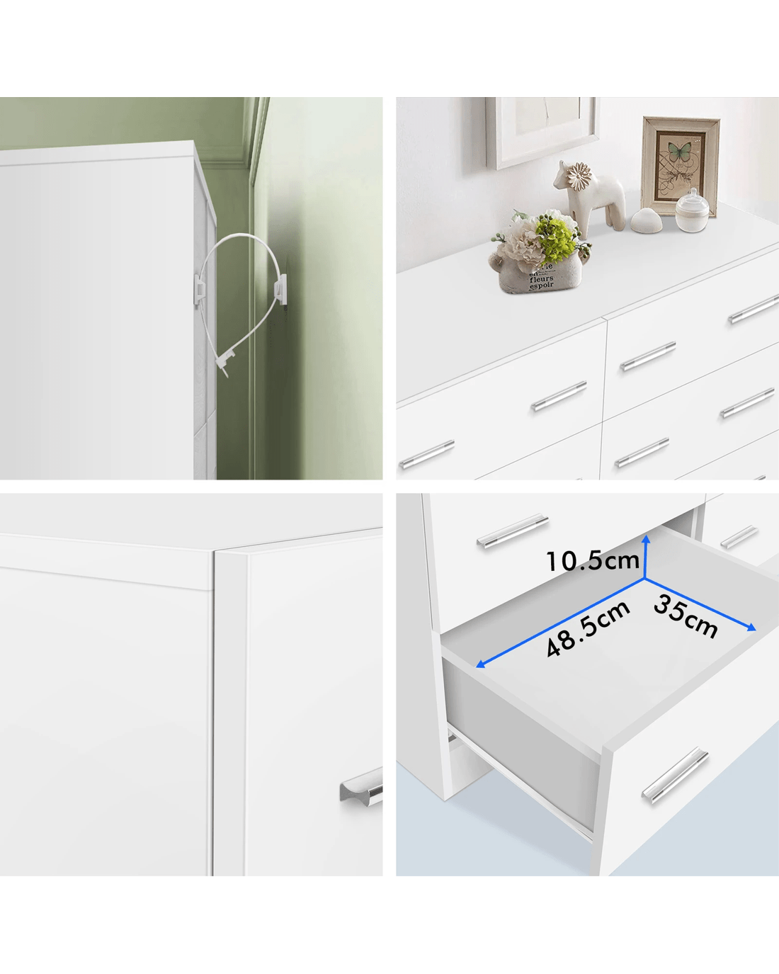 Made of superior E1 grade and 15mm thick particle board, this dresser is designed to be highly secure. To add extra stability, an upgraded anti-tip kit is equipped for the linkage between the cabinet and the wall. Unlike some other sellers, we have no compromise on materials Use - stead of flimsy paper finish, our dresser is well made with melamine finish. It is not only easy to maintain, but also long lasting.