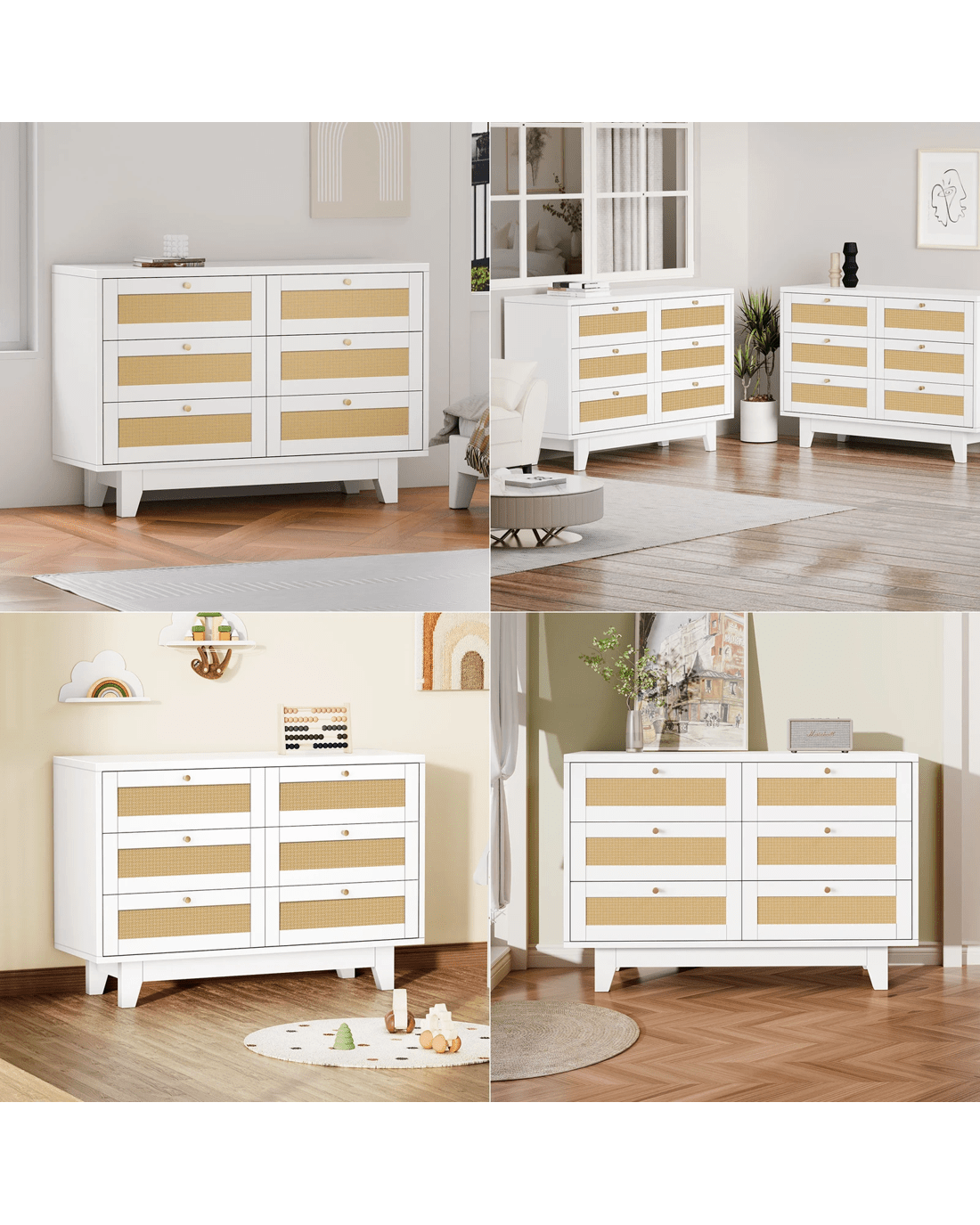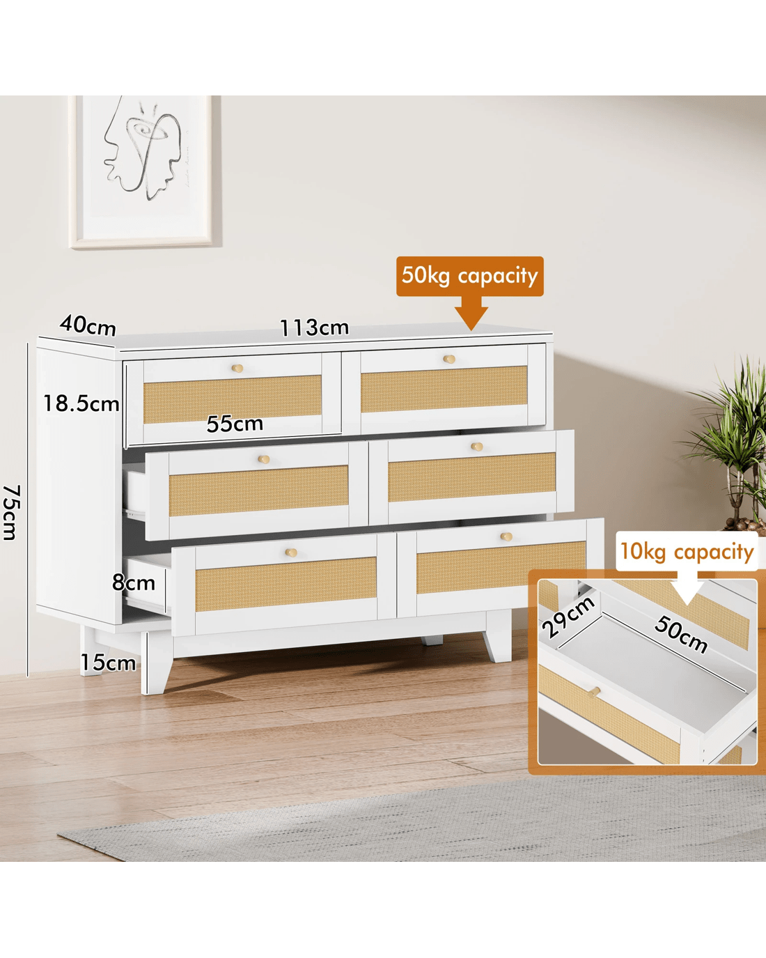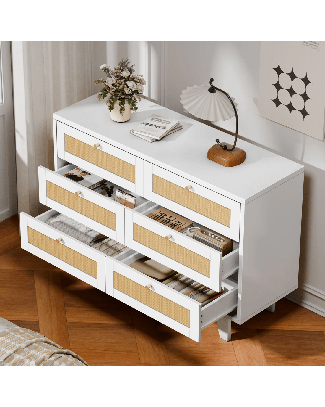 Alfordson 6 Chest of Drawers Rattan Storage Cabinet Dresser Tallboy - White