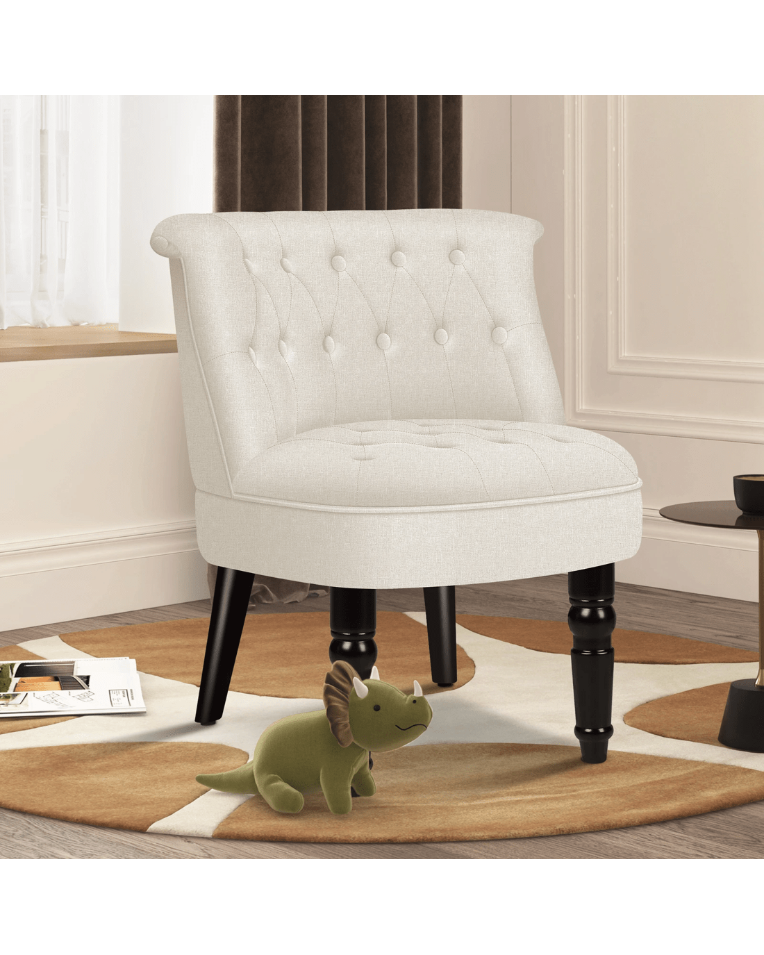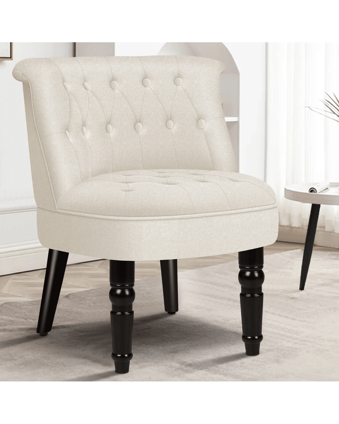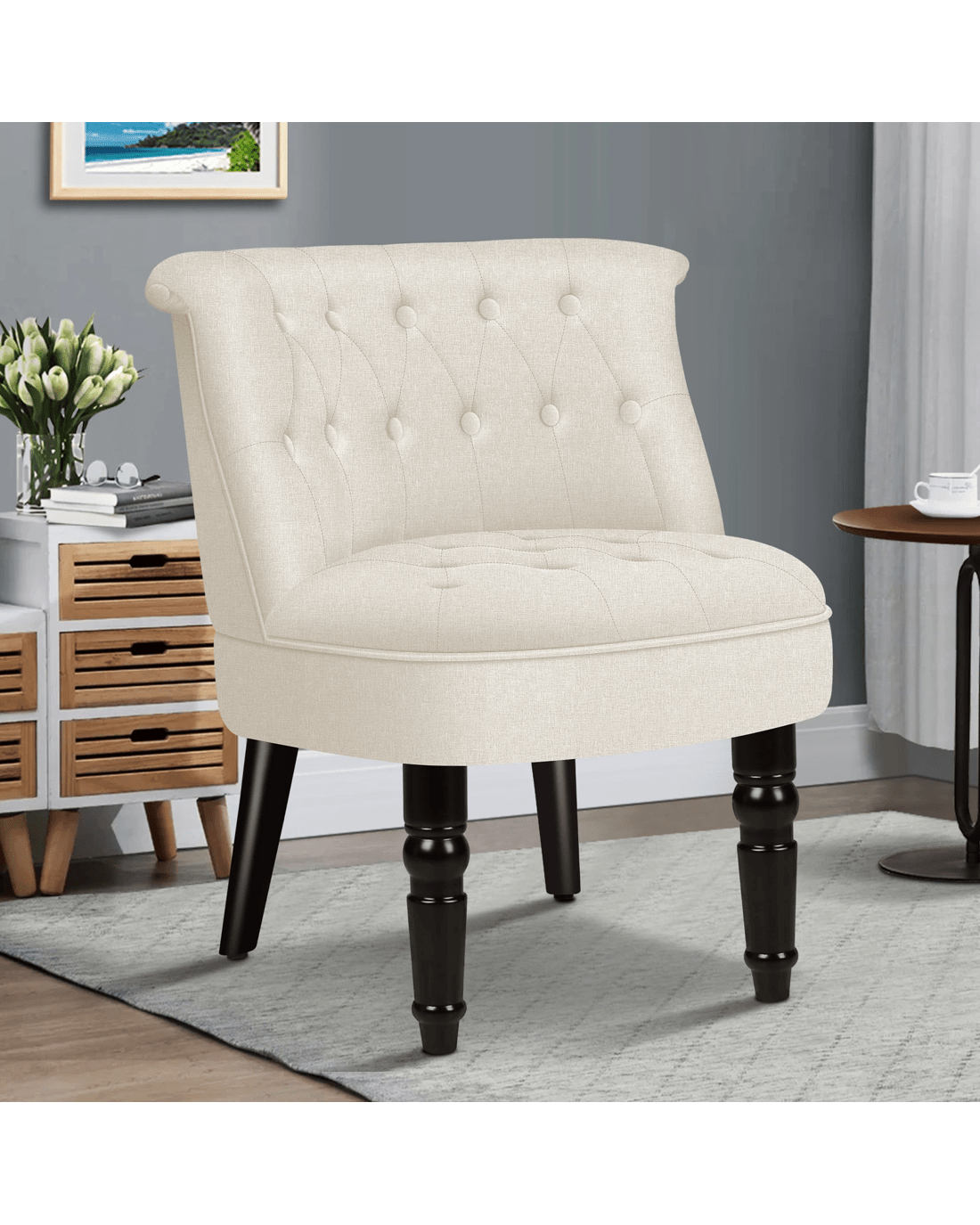 Combined with retro-inspired wood legs and linen fabric, this upholstered chair adds elegance and sophistication to the d??cor while enhancing the atmosphere of the room.