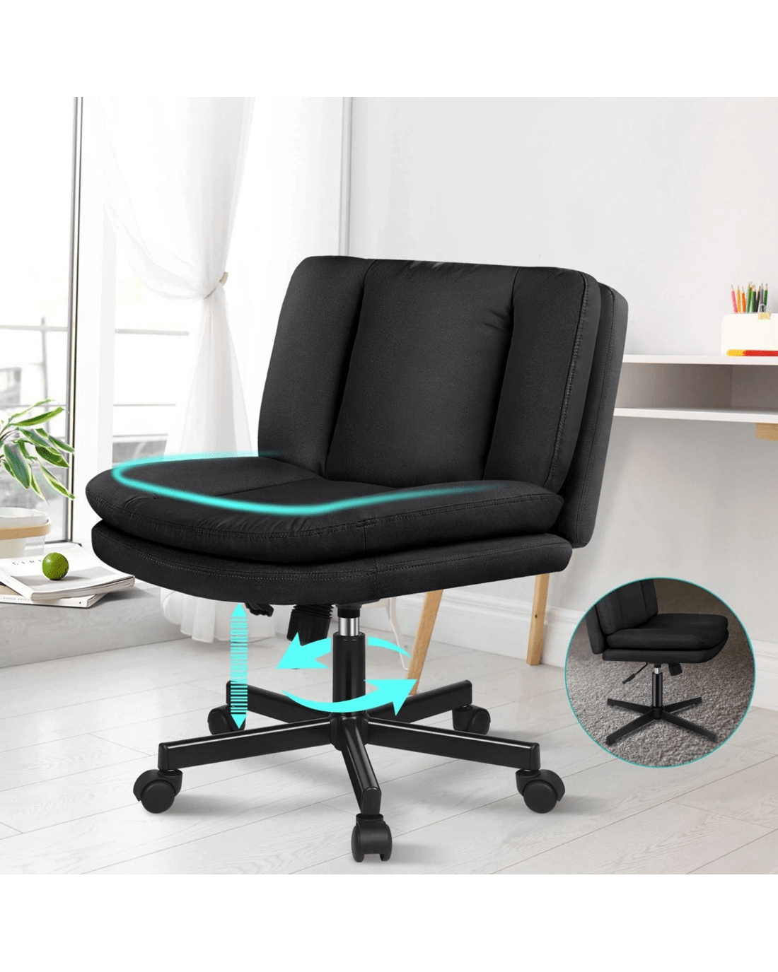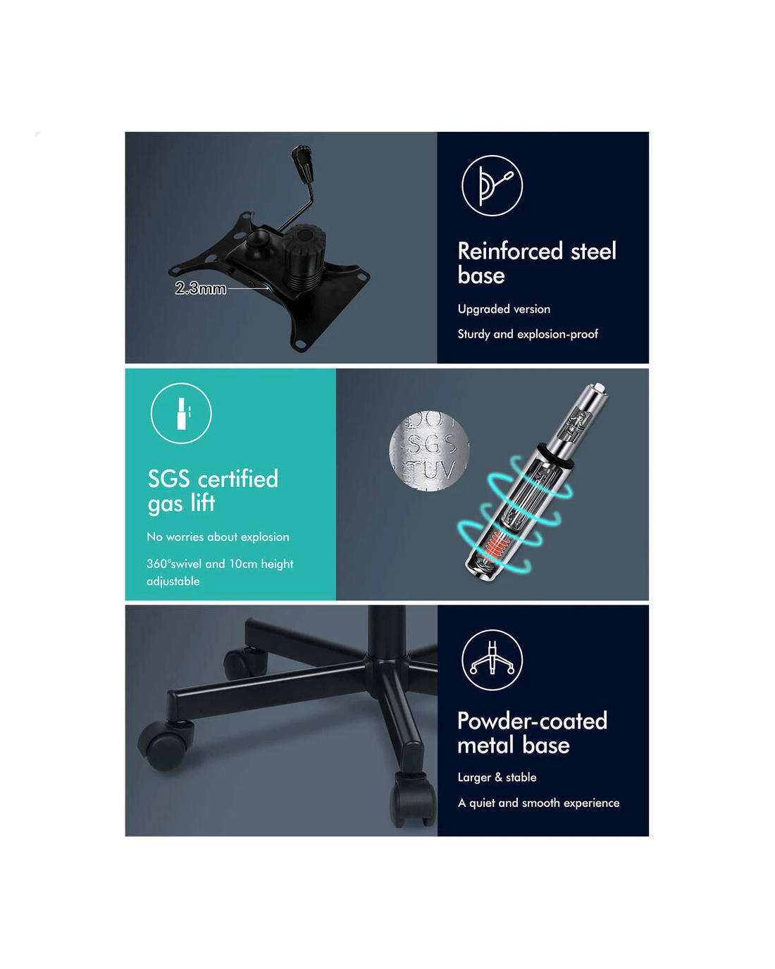 * Stylish black powder coated chrome base with 360 degree smooth & silent wheels