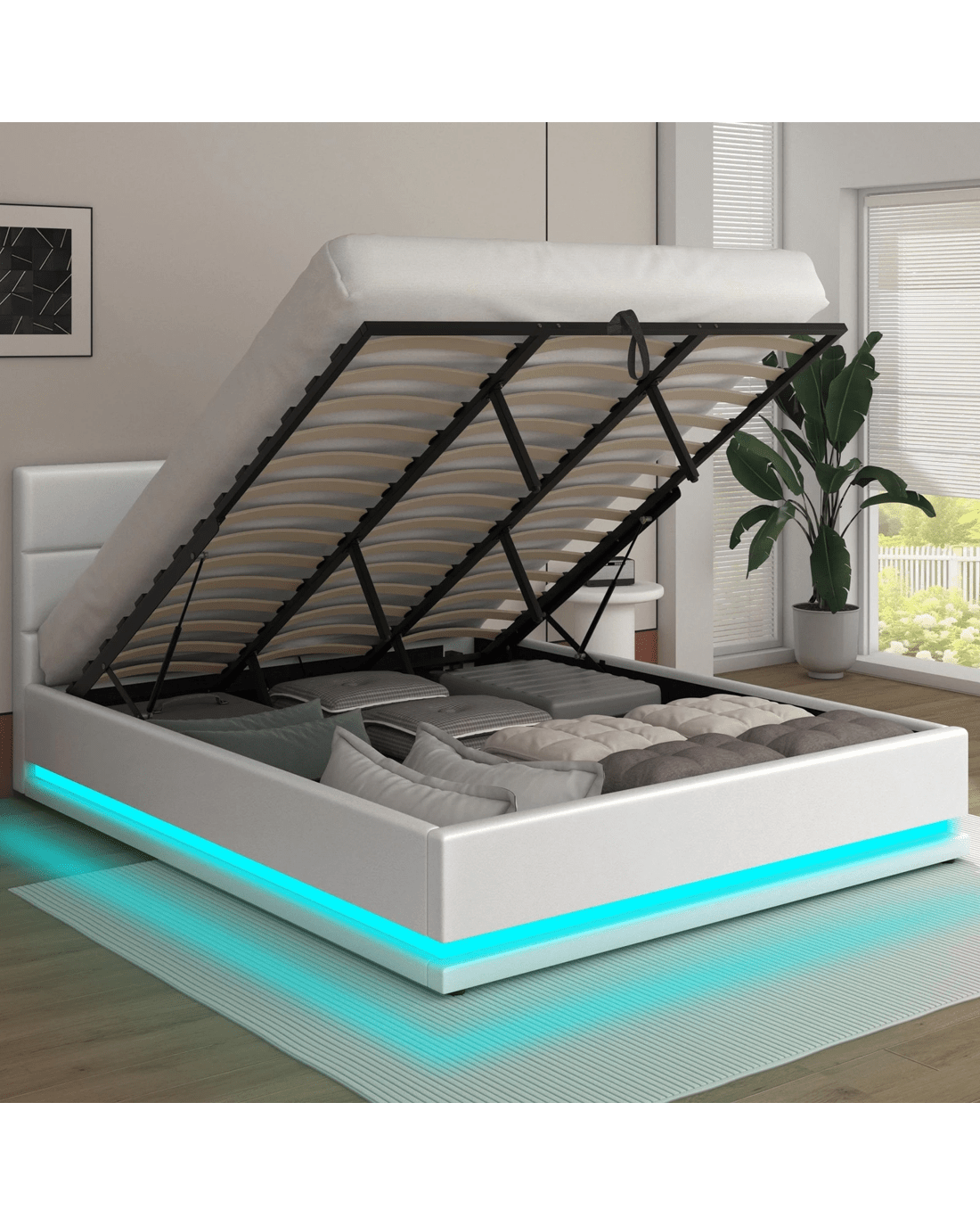 Alfordson Bed Frame King Size Platform RGB LED Gas Lift Base Storage - White