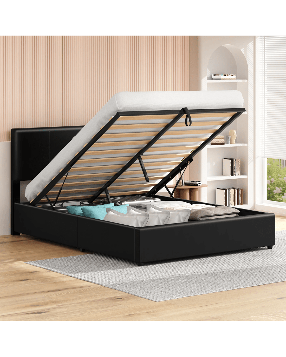 Quality counts - Constructed of durable wood slats and reinforced with exclusive X-support frame, this bed frame provides you with full sense of security. The heavy-duty gas lift mechanism allows you to effortlessly raise the mattress platform, providing easy access to the storage compartment. What's more, with adhesive Velcro strips, you can just lay the slats down, without inserting slats one by one at both end caps. Enjoy hassle-free installation!