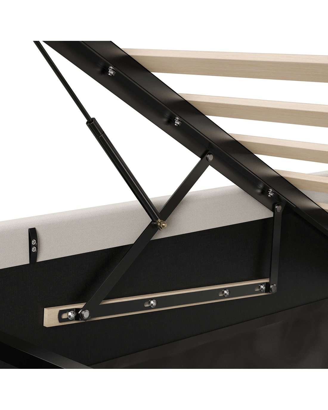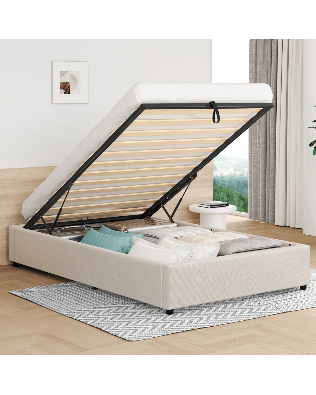 Space optimization - Elevate your bedroom with a bed frame that masterfully combines generous storage and elegant design. Perfect for compact apartments or anyone seeking to maximize space, our gas-lift bed offers a sleek, sturdy solution for a clutter-free retreat. Its effortless hydraulic mechanism reveals ample built-in storage, helping you organize efficiently while maintaining a clean, serene aesthetic.