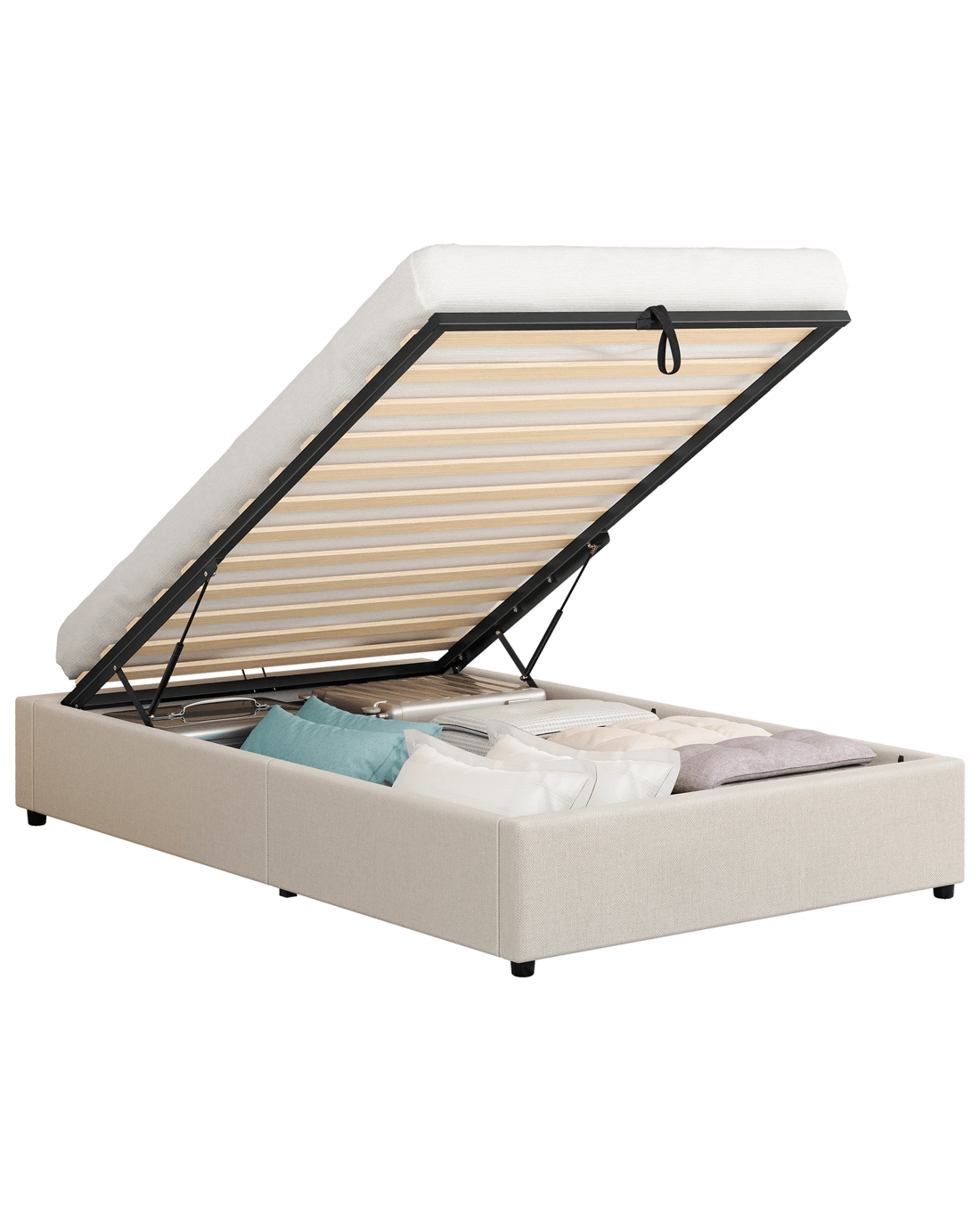 Quality counts - Constructed of durable wood slats and reinforced with exclusive X-support frame, this bed frame provides you with full sense of security. The heavy-duty gas lift mechanism allows you to effortlessly raise the mattress platform, providing easy access to the storage compartment. What's more, with adhesive Velcro strips, you can just lay the slats down, without inserting slats one by one at both end caps. Enjoy hassle-free installation!