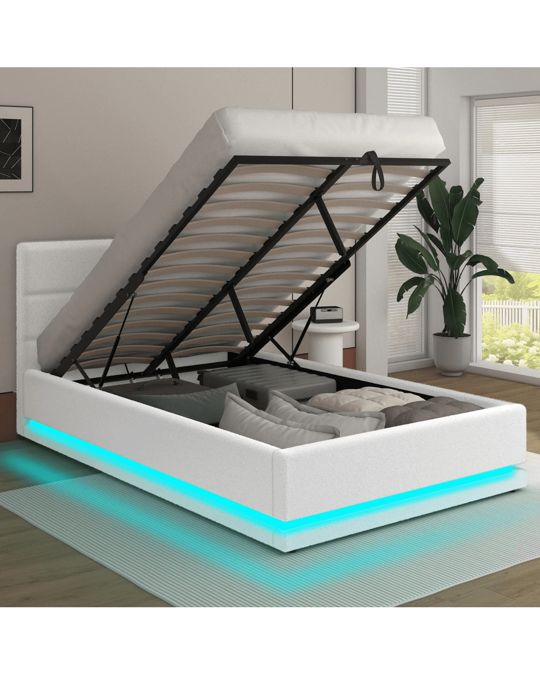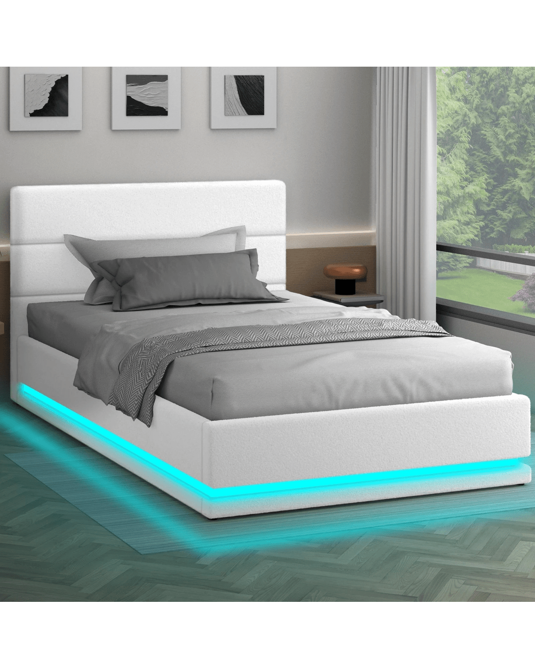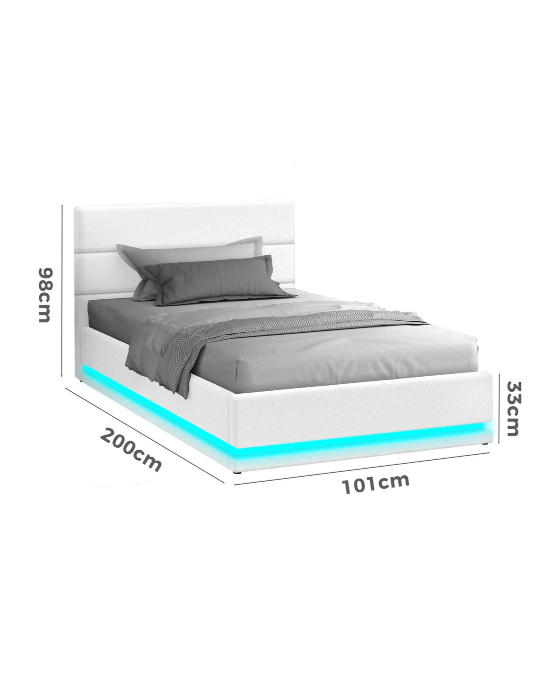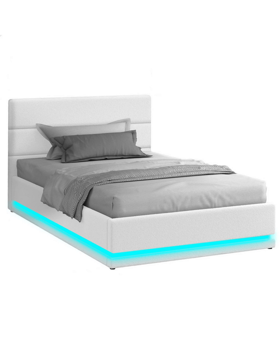 Sold by Aussie Union GroupAlfordson Bed Frame Single Size Platform RGB LED Gas Lift Base Storage Boucle - White