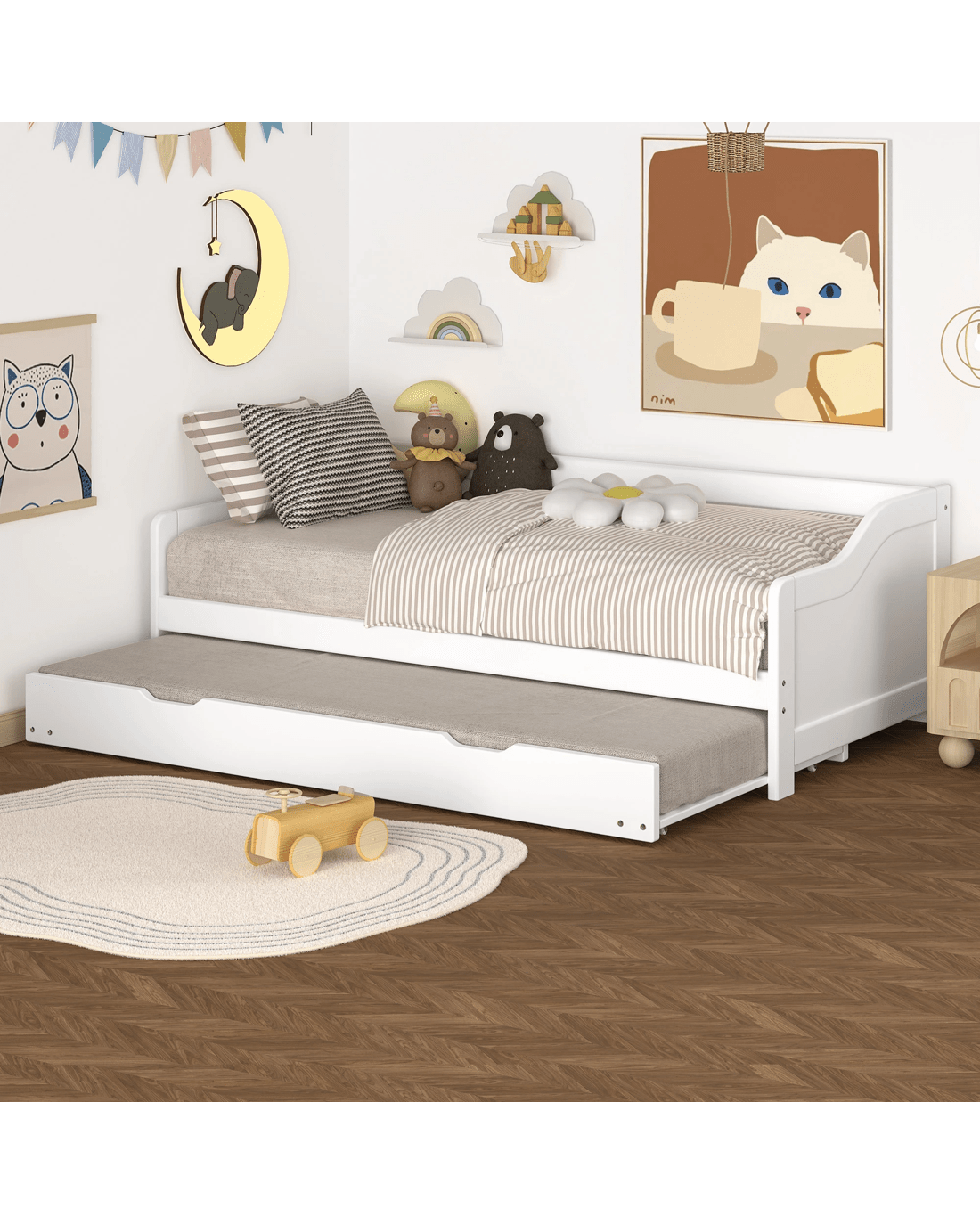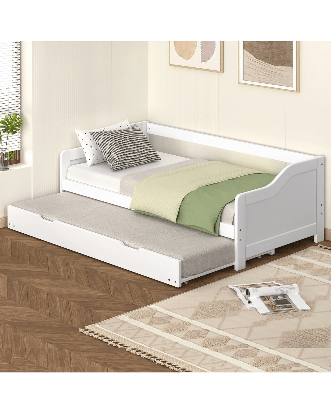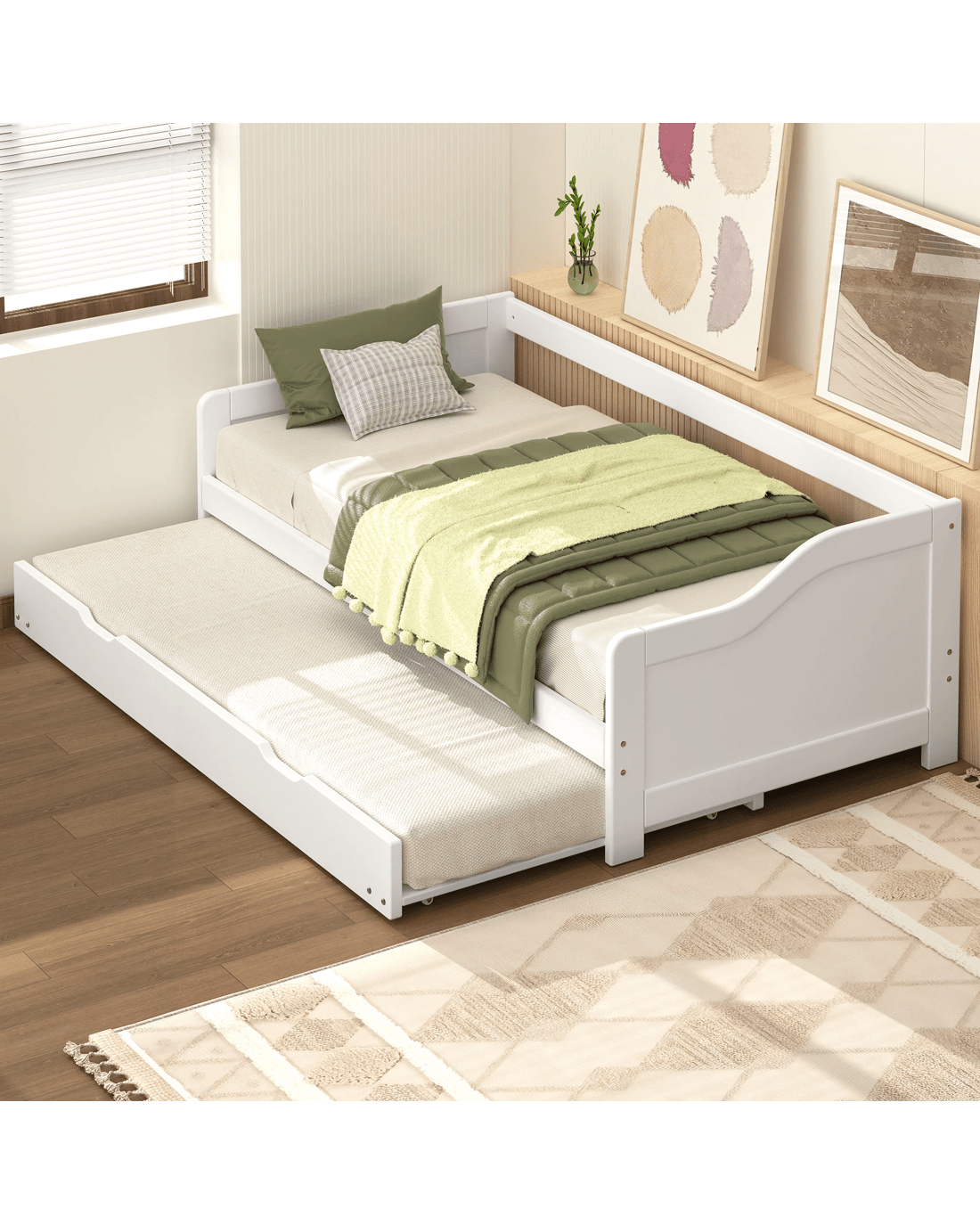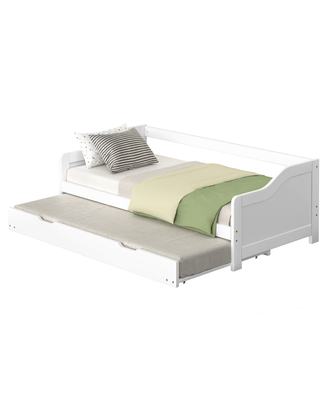 Roll-out mechanism - The trundle portion of the bed is equipped with casters that allow it to slide out easily from under the main frame. This design ensures smooth operation, allowing the trundle to be pulled out and pushed back in with minimal effort.