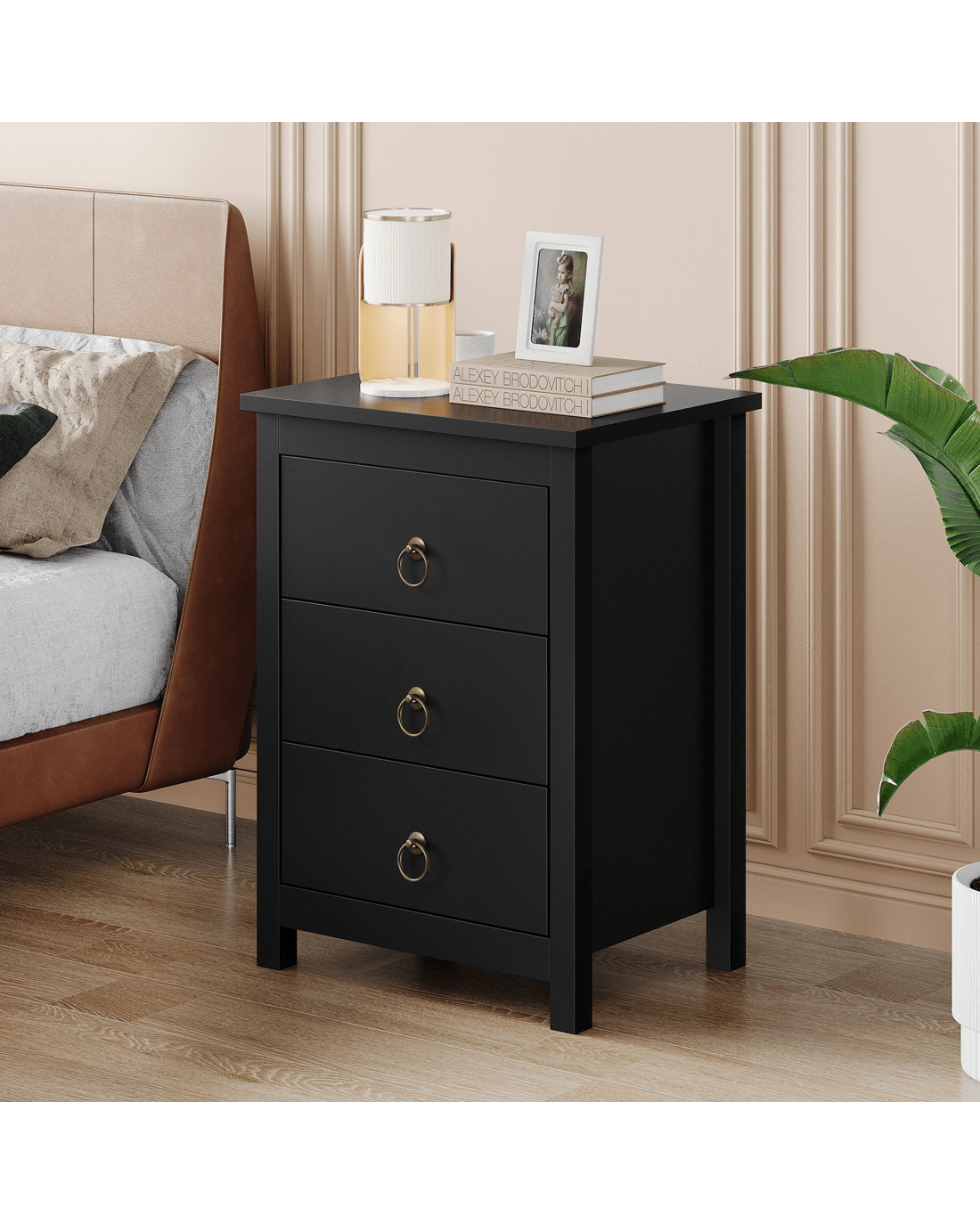 This bedside table can serve as a functional addition at the side of your bed. It provides a surface to place necessary items like a lamp, a laptop, a book, a glass of water, medicine or vitamin pills, or whatever else you may want to keep close by the bed. Not least, featuring 3 spacious drawers, it provides ample storage so that'se items you store away in the drawers won't gather dust.