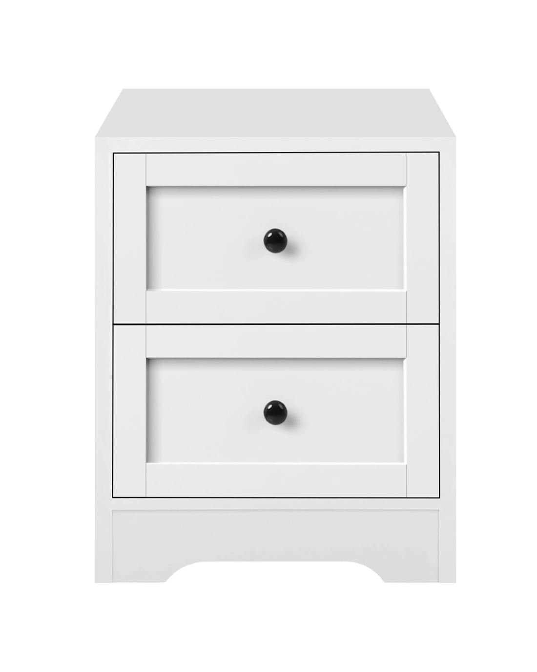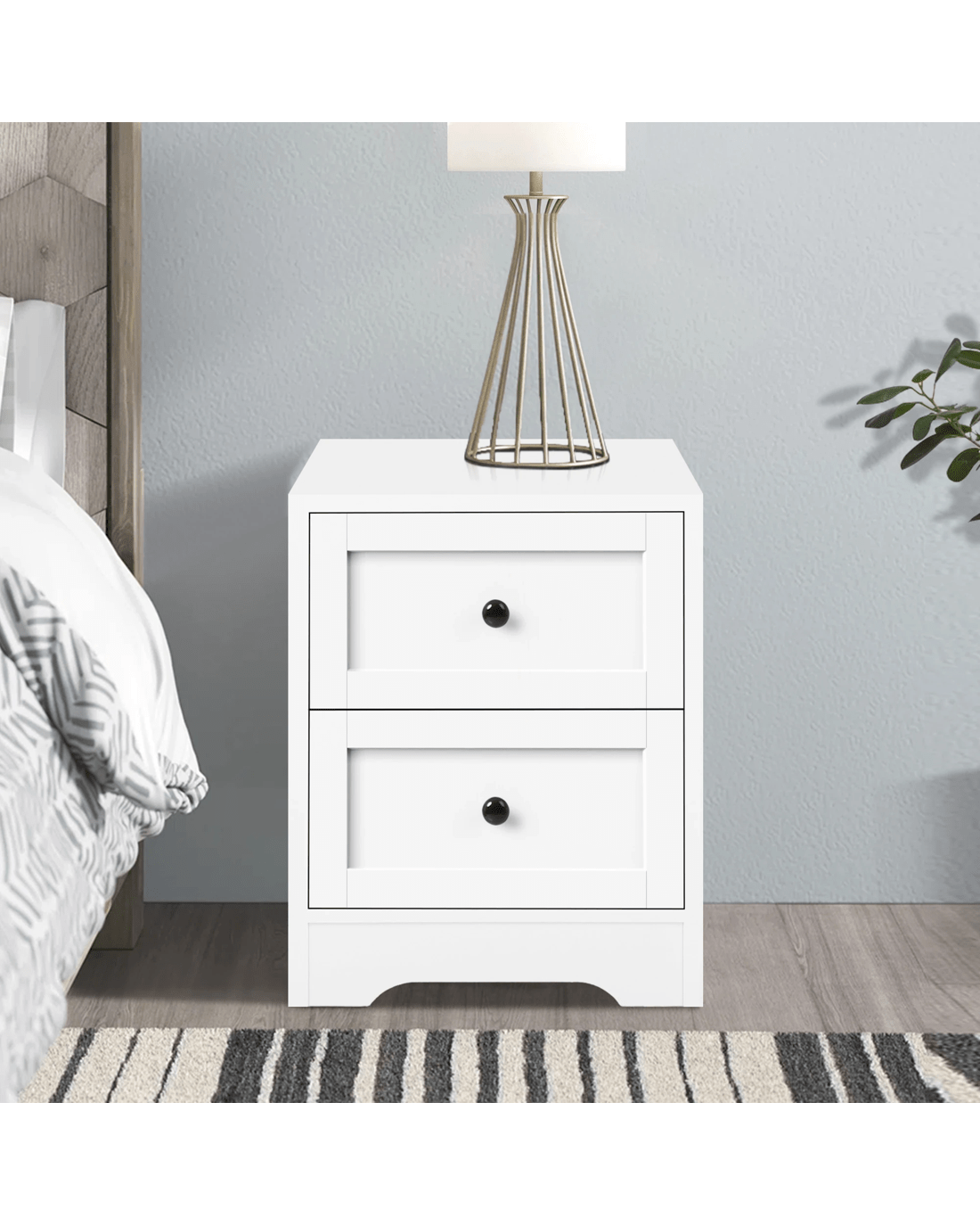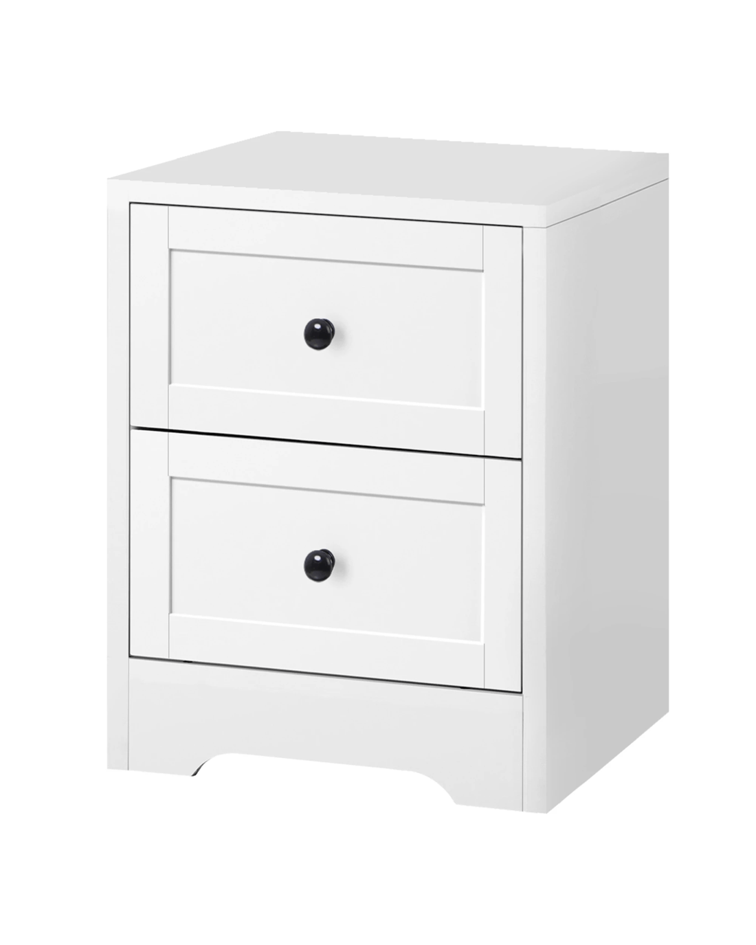 This bedside table can serve as a functional addition at the side of your bed. It provides a surface to place necessary items like a lamp, a laptop, a book, a glass of water, medicine or vitamin pills, or whatever else you may want to keep close by the bed. Not least, featuring 2 spacious drawers, it provides ample storage so that'se items you store away in the drawers won't gather dust.