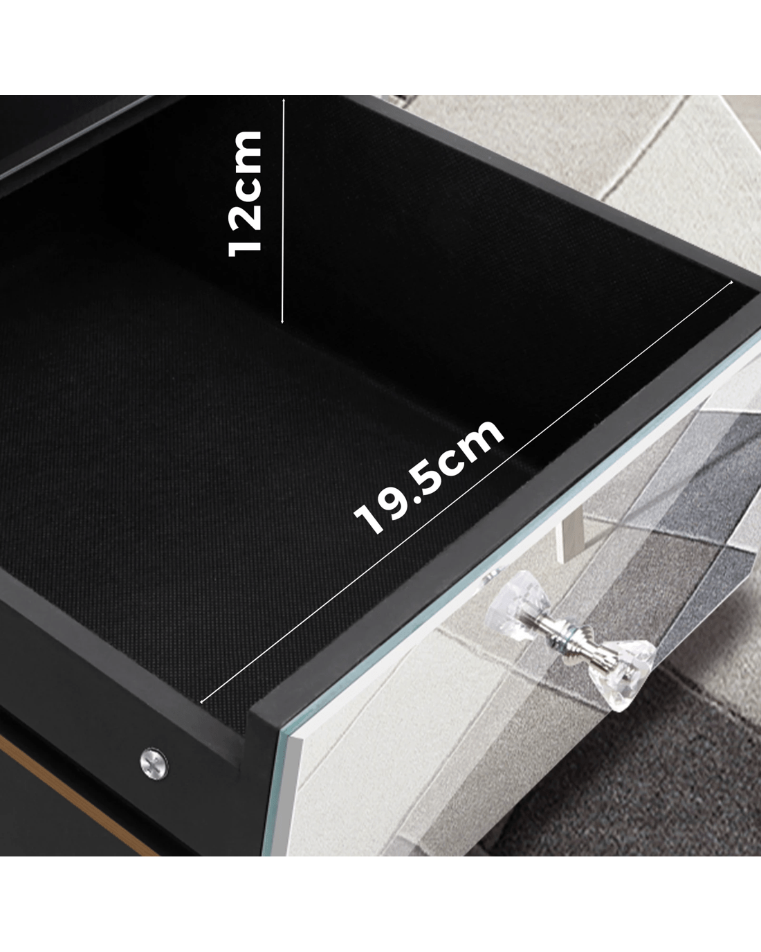 Finely crafted with smooth and bevelled mirrored glass, as well as superior E1 grade MDF board, this bedside table is designed to be highly durable. It is also easy to maintain and clean. A protective packaging is apllied to the bedside table surface to prevent scratches and damaged during shipping.