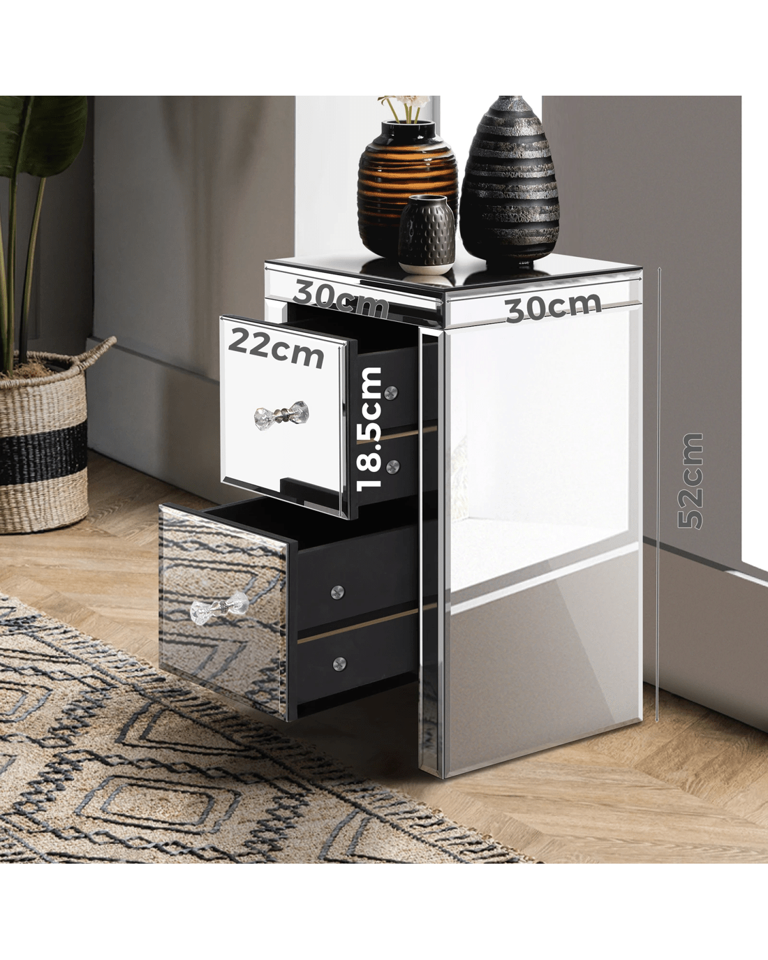 Finely crafted with smooth and bevelled mirrored glass, as well as superior E1 grade MDF board, this bedside table is designed to be highly durable. It is also easy to maintain and clean. A protective packaging is applied to the bedside table surface to prevent scratches and damage during shipping.