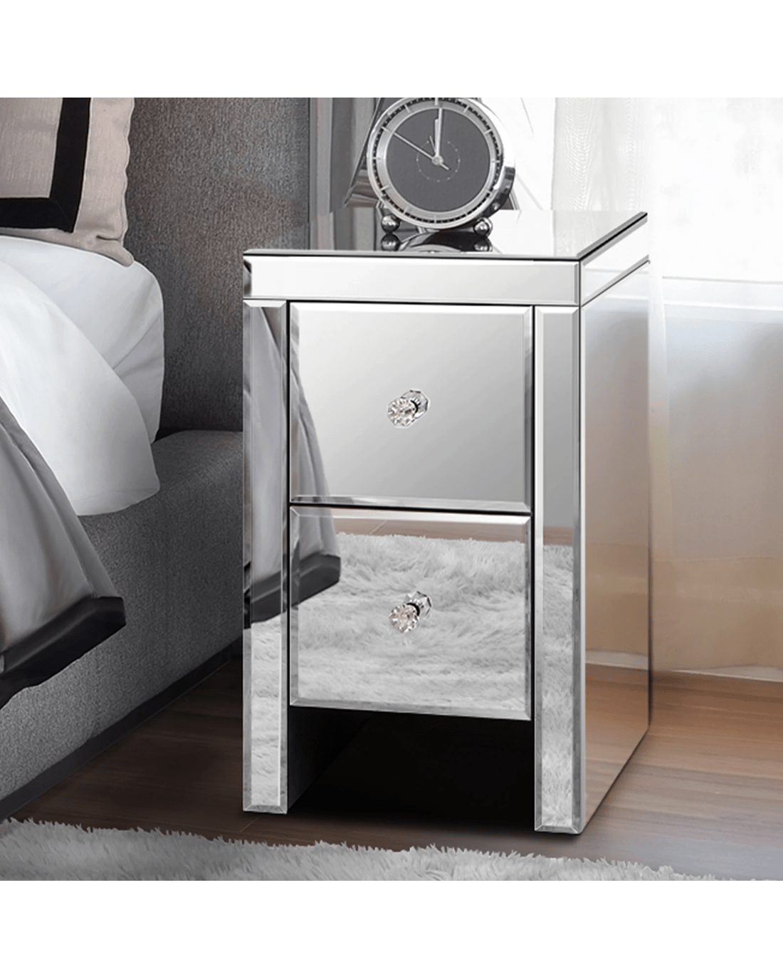 As you may or may not know, most people prefer to have two bedside tables in the bedroom because they help achieve symmetry in the design and increases storage space. Moreover, these unique mirrored tables can be Use - fancy cabinets or luxury side tables. Its clean-cut design will fit perfectly in multiple interior styles, in the meantime, increase the brightness of a room. Being functional yet stylish, you will definitely love our mirrored bedside table.
