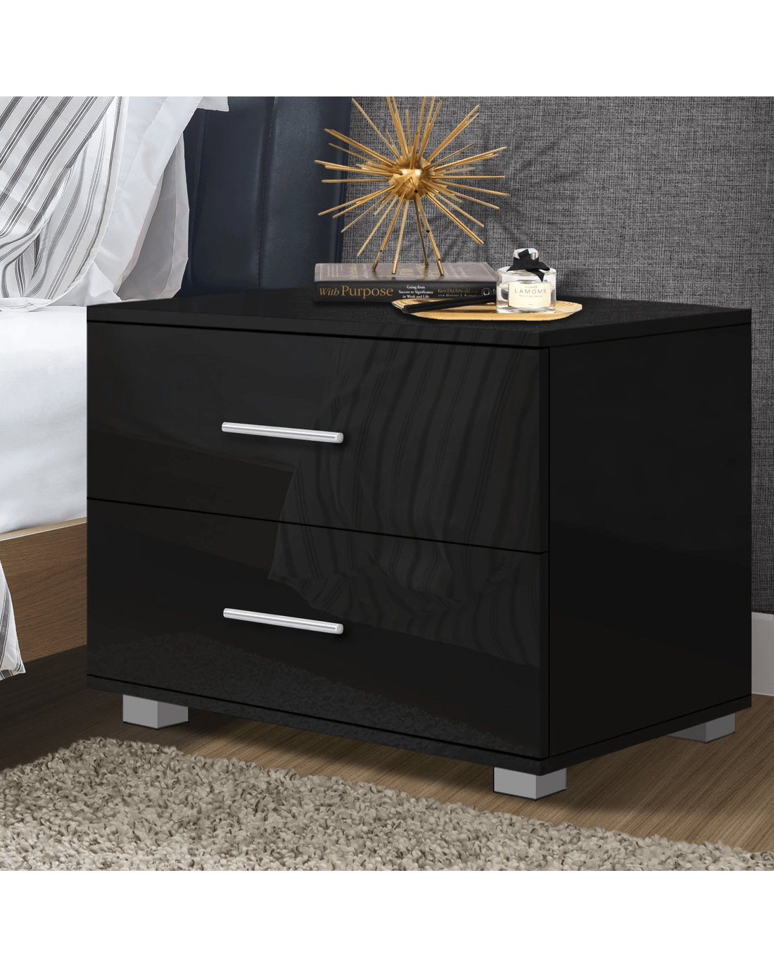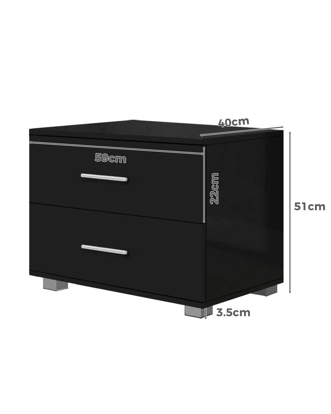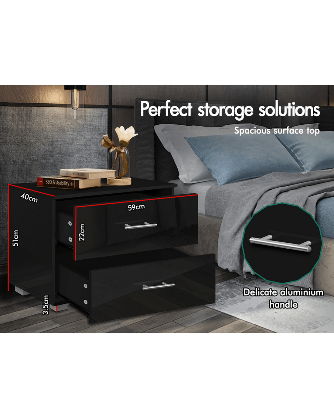 This ALFORDSON bedside table can serve as a functional addition at the side of your bed. It provides a surface to place necessary items like a lamp, a laptop, a book, a glass of water, medicine or vitamin pills, or whatever else you may want to keep close by the bed. Not least, featuring 2 spacious drawers, it provides ample storage so that'se items you store away in the drawers won't gather dust. Our bedside table has gorgeous high gloss on 4 sides (top, front, right and left sides). It is not only easy to maintain and clean, but also helps to enhance the feeling of space with its light-reflecting properties.