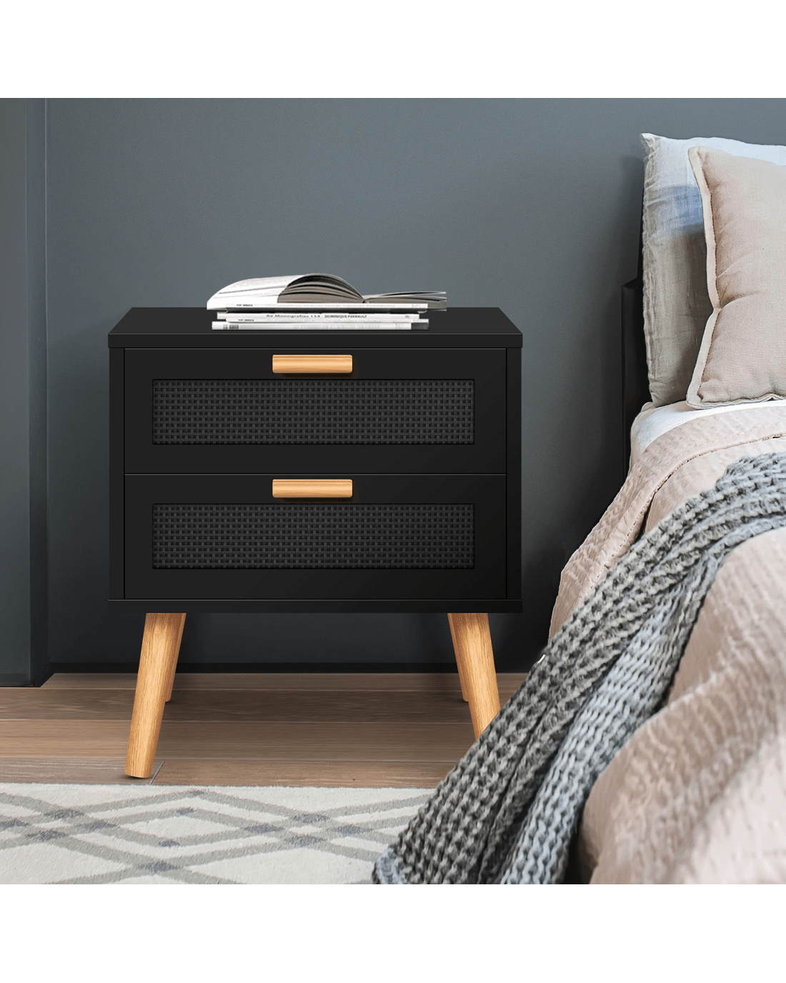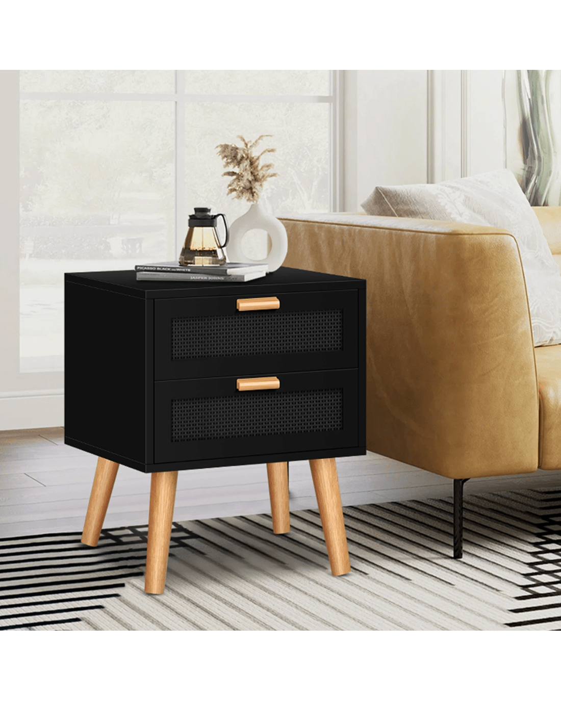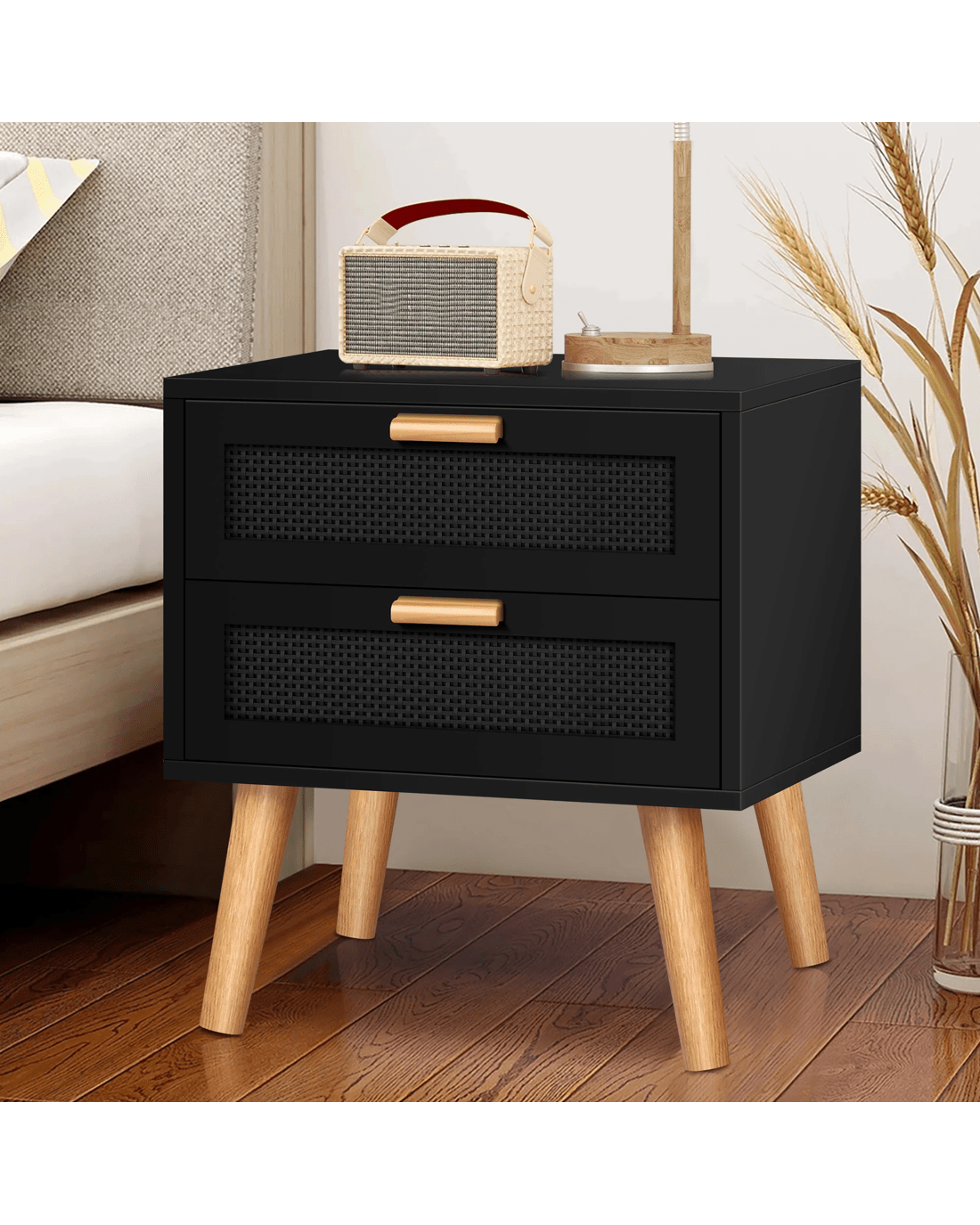 Sold by Aussie Union GroupAlfordson Bedside Table Nightstand Side Storage Cabinet Boho Rattan - Black