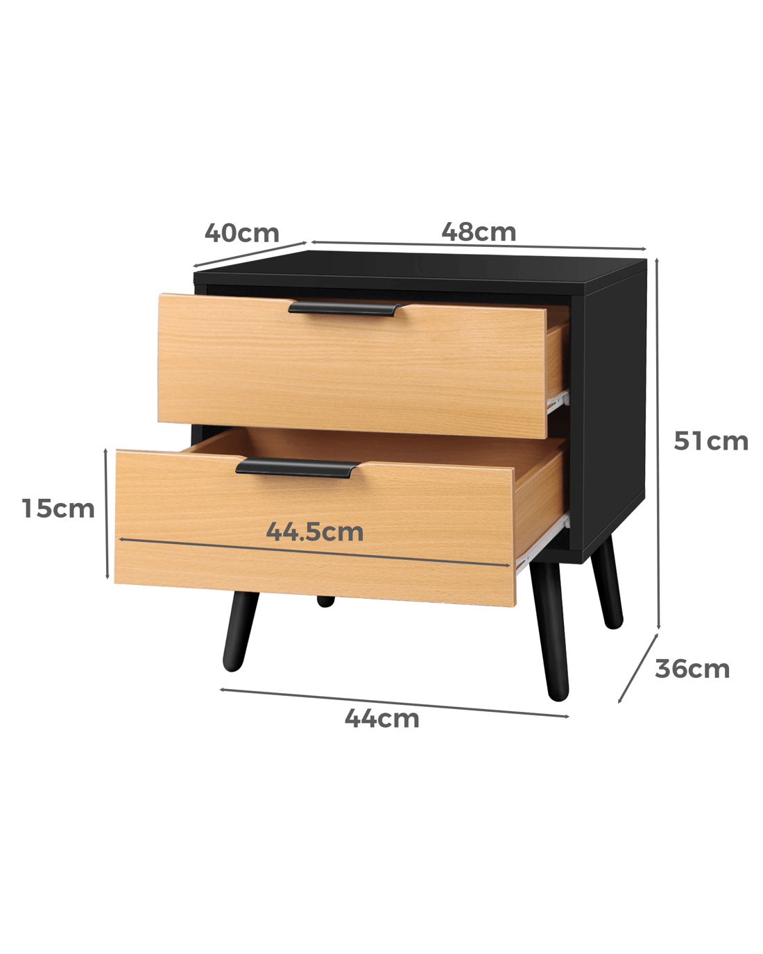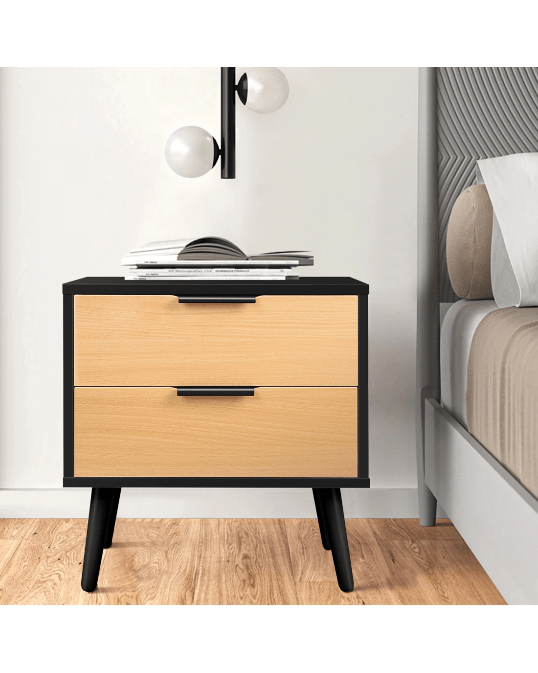 Inspired by extraordinary and authentic Scandinavian design, this bedside table can serve as a functional addition at the side of your bed. It provides a surface to place necessary items like a lamp, a laptop, a book, a glass of water, medicine or vitamin pills, or whatever else you may want to keep close by the bed. Not least, featuring 2 spacious drawers, it provides ample storage so that'se items you store away in the drawers won't gather dust.