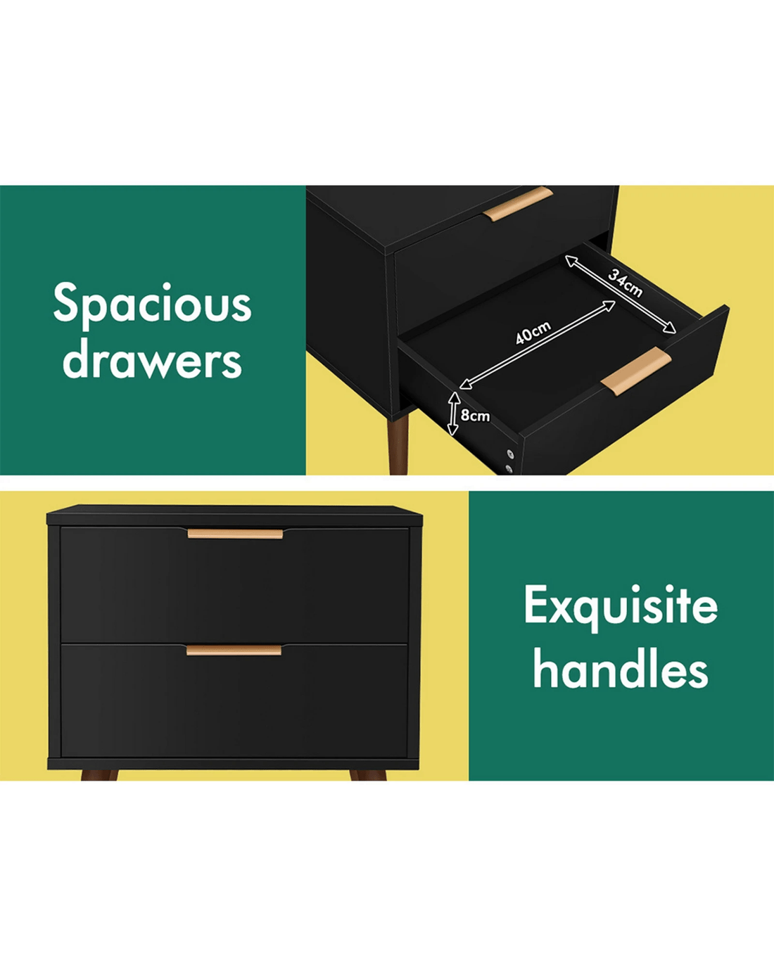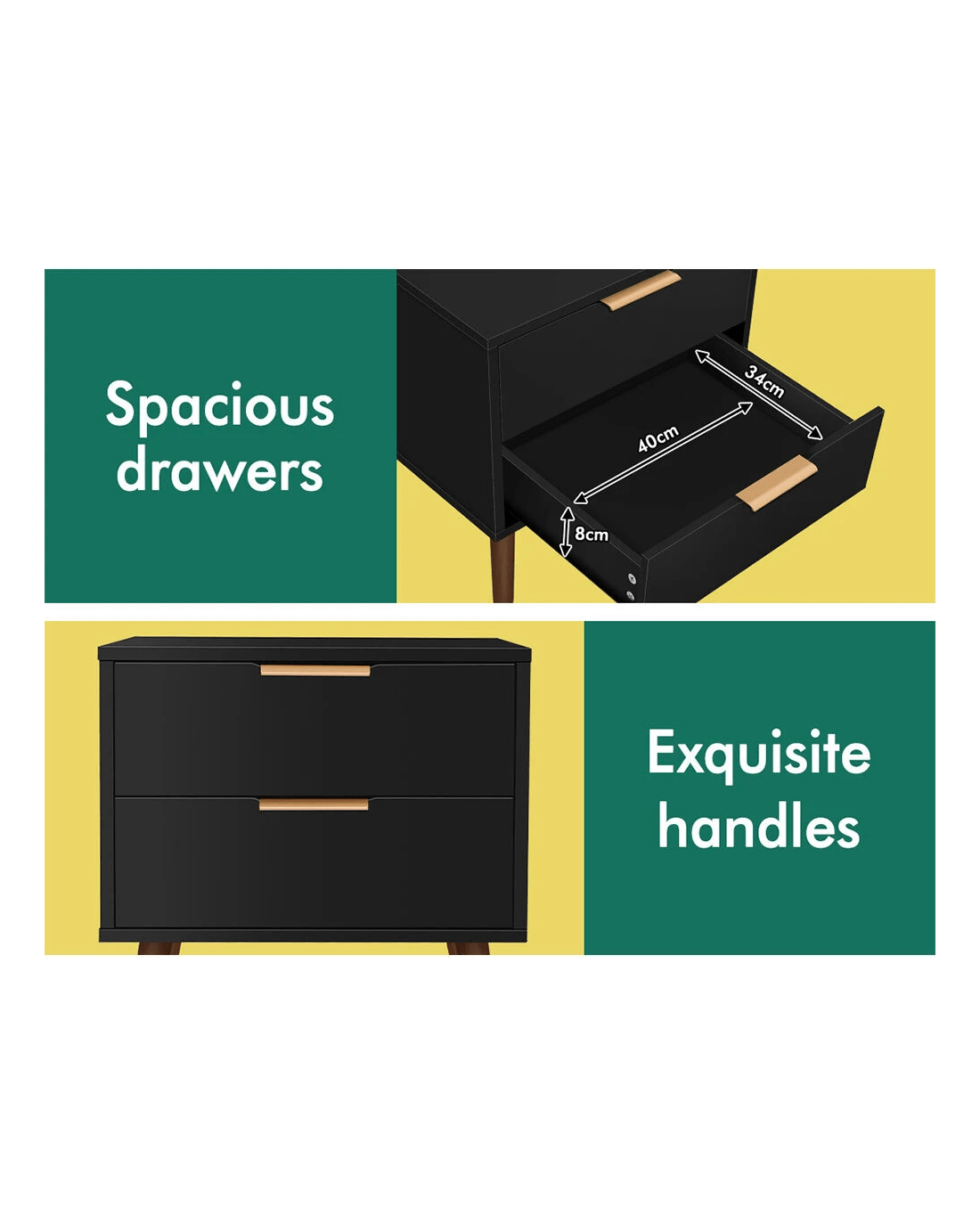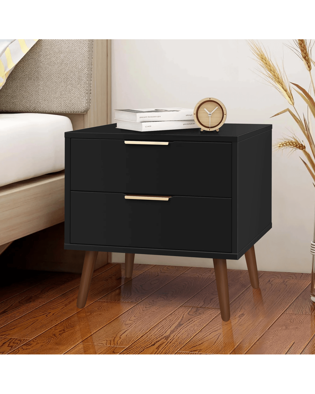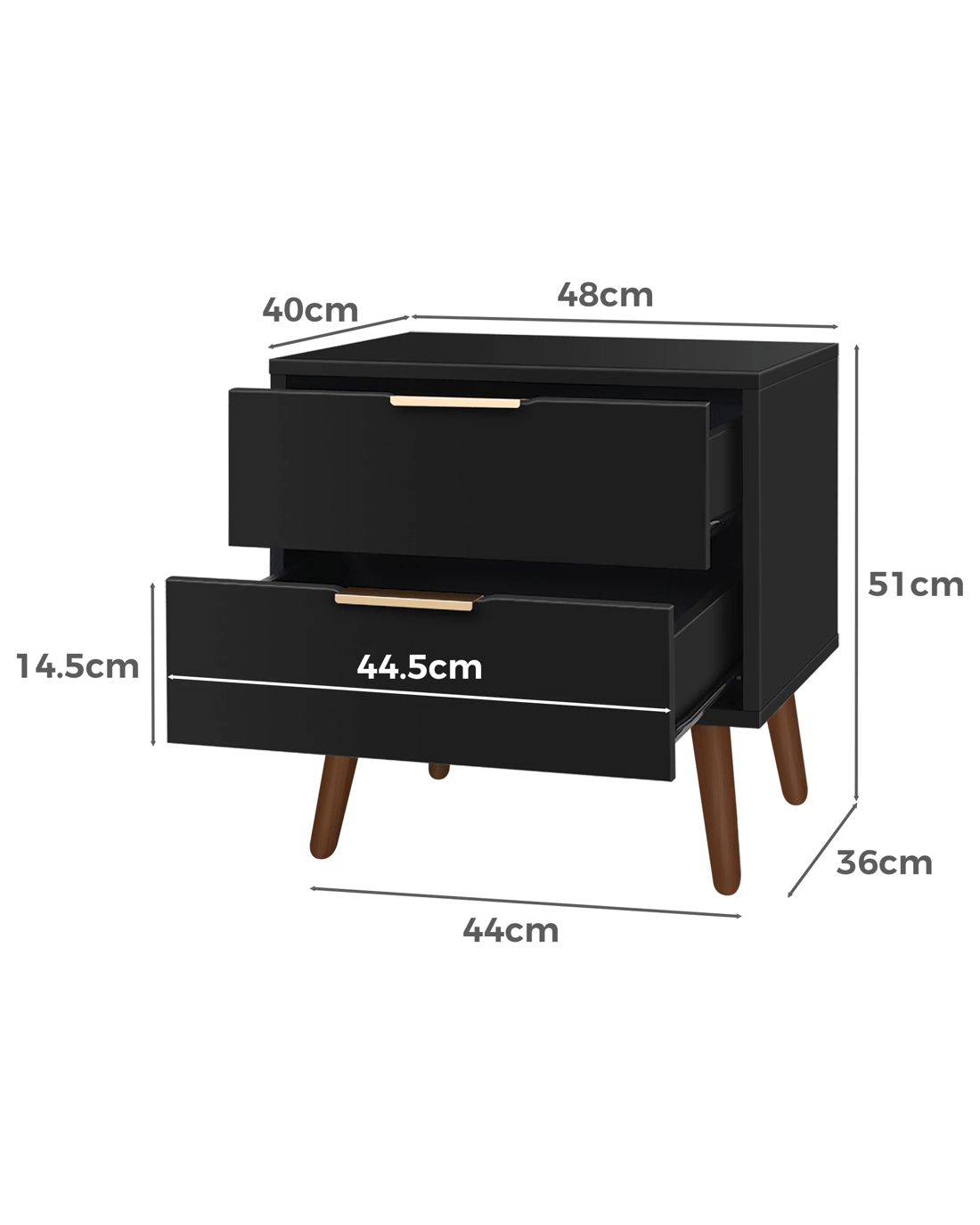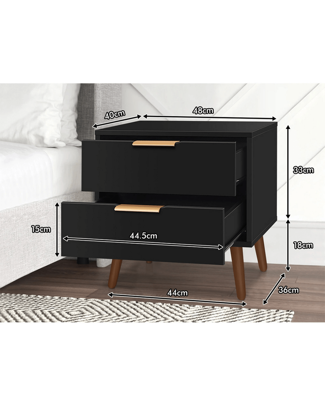 Inspired by extraordinary and authentic Scandinavian design, this bedside table can serve as a functional addition at the side of your bed. It provides a surface to place necessary items like a lamp, a laptop, a book, a glass of water, medicine or vitamin pills, or whatever else you may want to keep close by the bed. Not least, featuring 2 spacious drawers, it provides ample storage so that'se items you store away in the drawers won't gather dust.