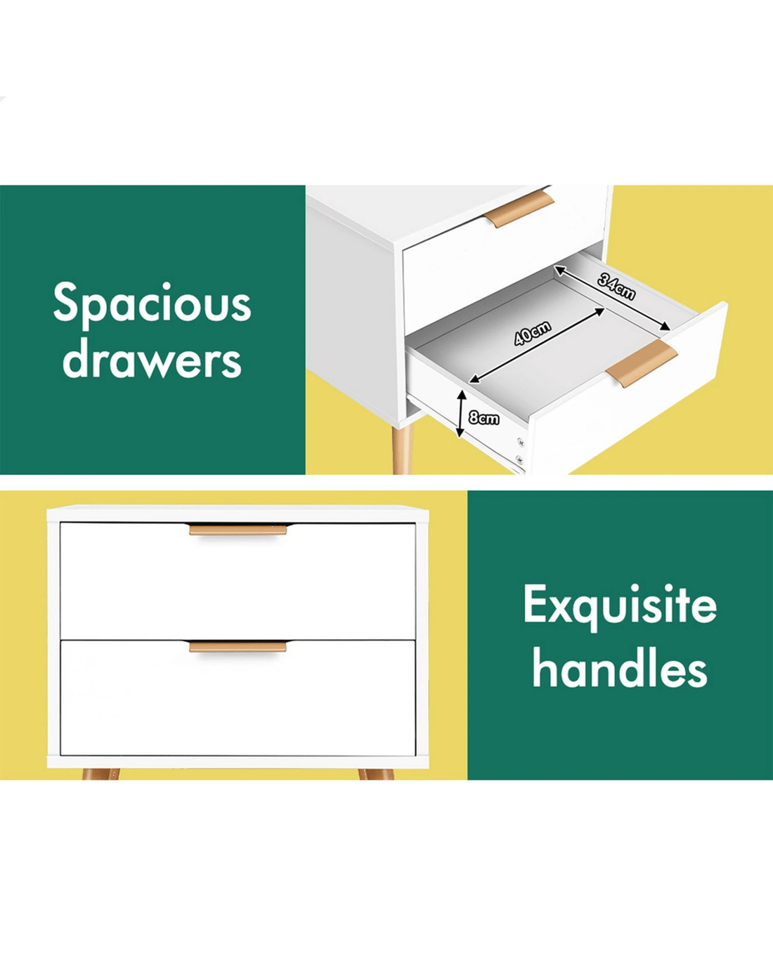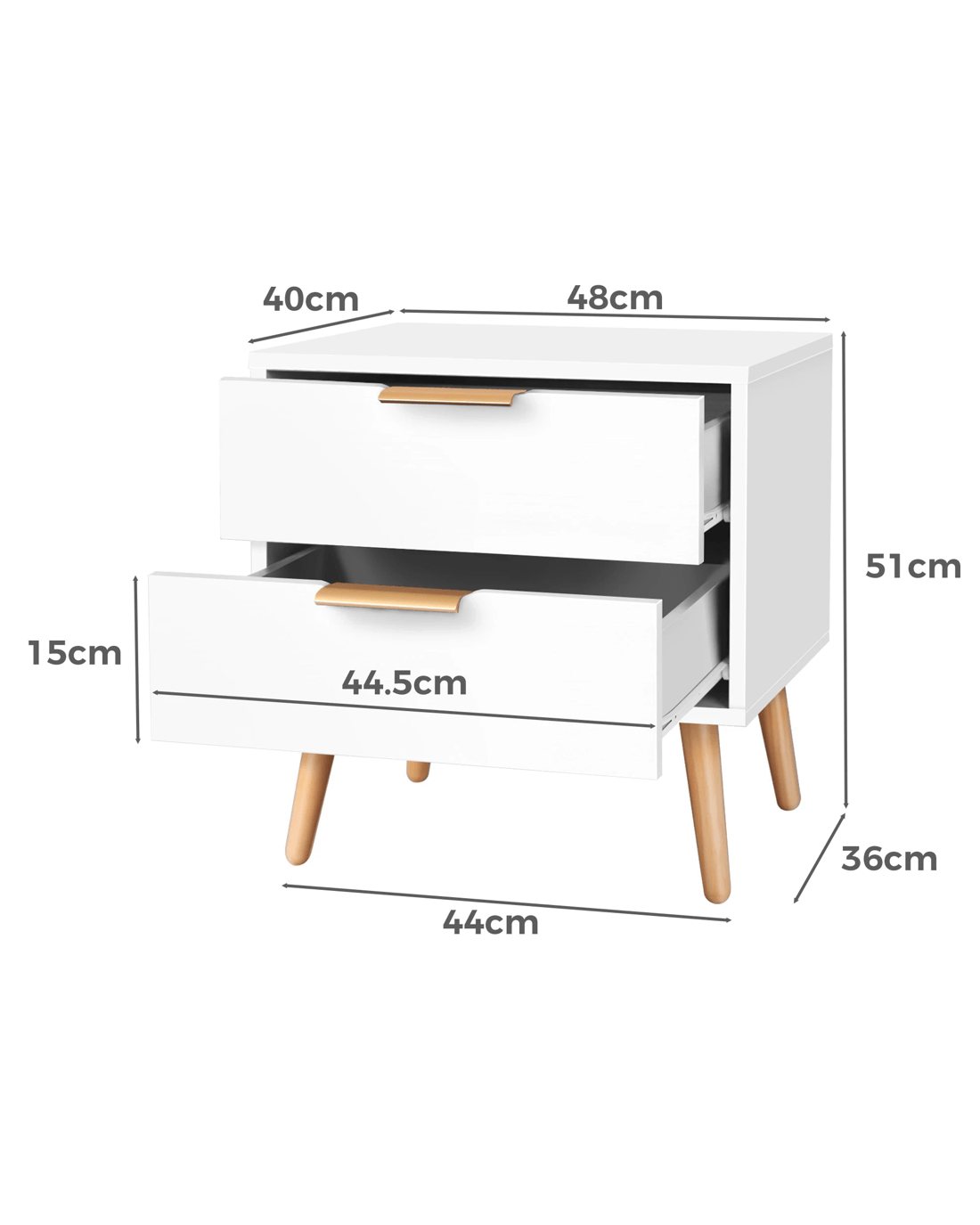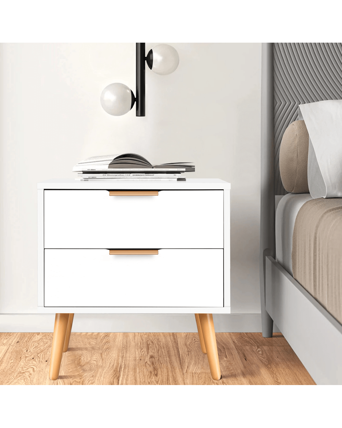 Inspired by extraordinary and authentic Scandinavian design, this bedside table can serve as a functional addition at the side of your bed. It provides a surface to place necessary items like a lamp, a laptop, a book, a glass of water, medicine or vitamin pills, or whatever else you may want to keep close by the bed. Not least, featuring 2 spacious drawers, it provides ample storage so that'se items you store away in the drawers won't gather dust.