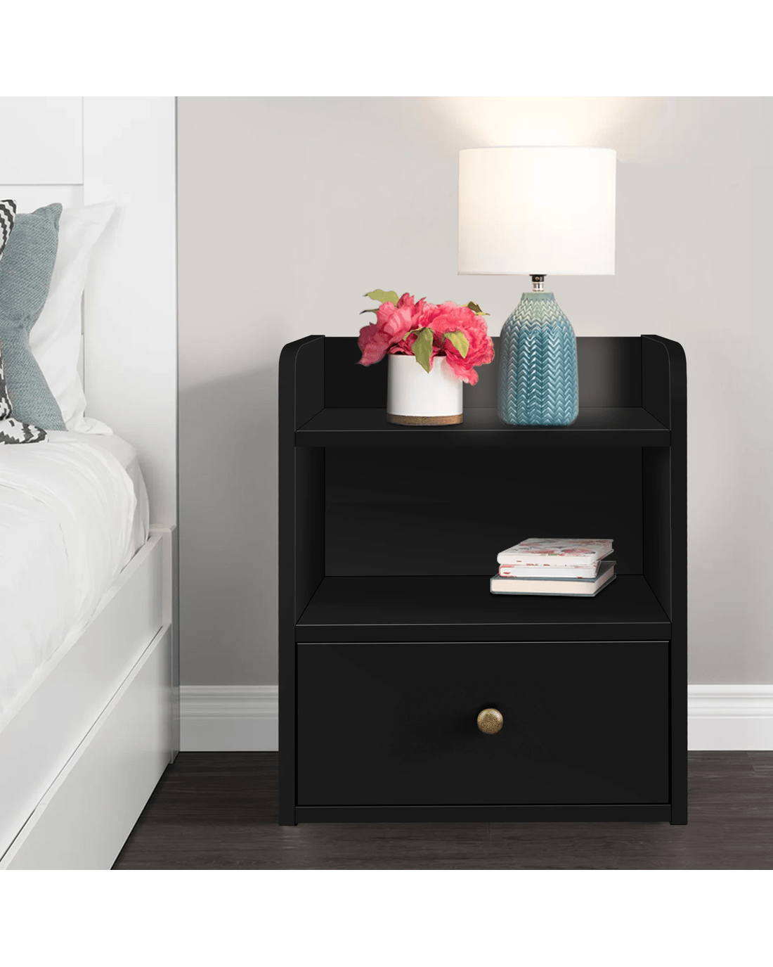 This bedside table can serve as a functional addition at the side of your bed. It provides a surface to place necessary items like a lamp, a laptop, a book, a glass of water, medicine or vitamin pills, or whatever else you may want to keep close by the bed. It also features 2 open shelves, which provides the perfect spot to slot your latest read, tablet or magazines. Not least, featuring a spacious drawer, it provides ample storage so that'se items you store away in the drawers won't gather dust.