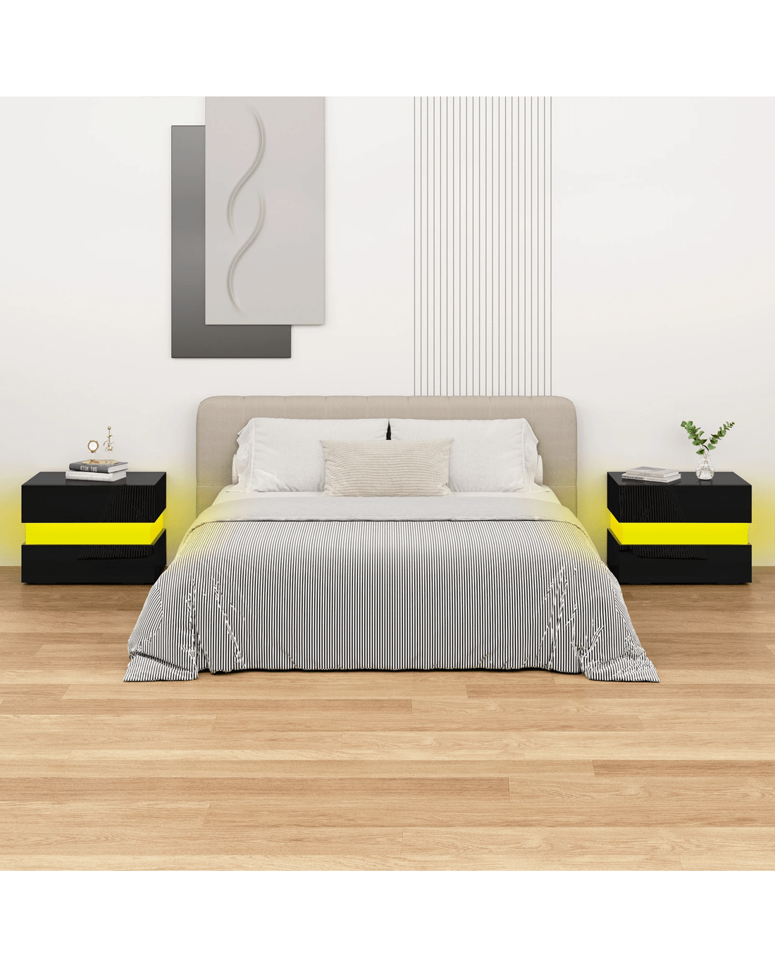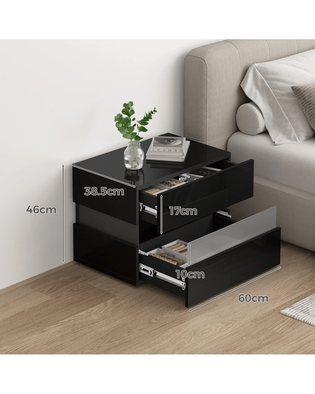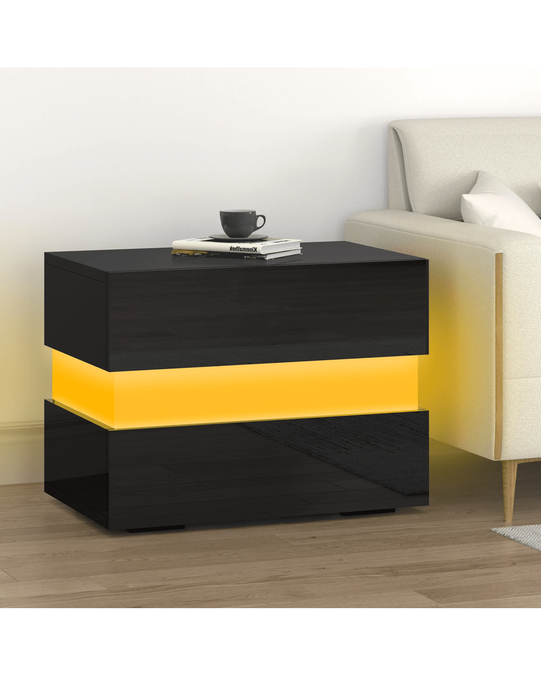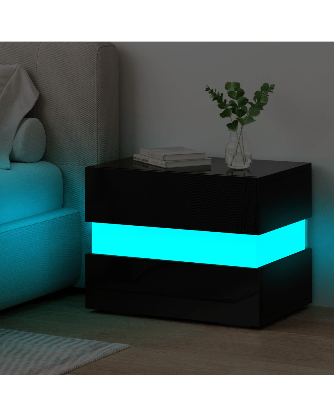 Alfordson Bedside Table RGB LED Nightstand 2 Drawers 4 Side High Gloss - Black