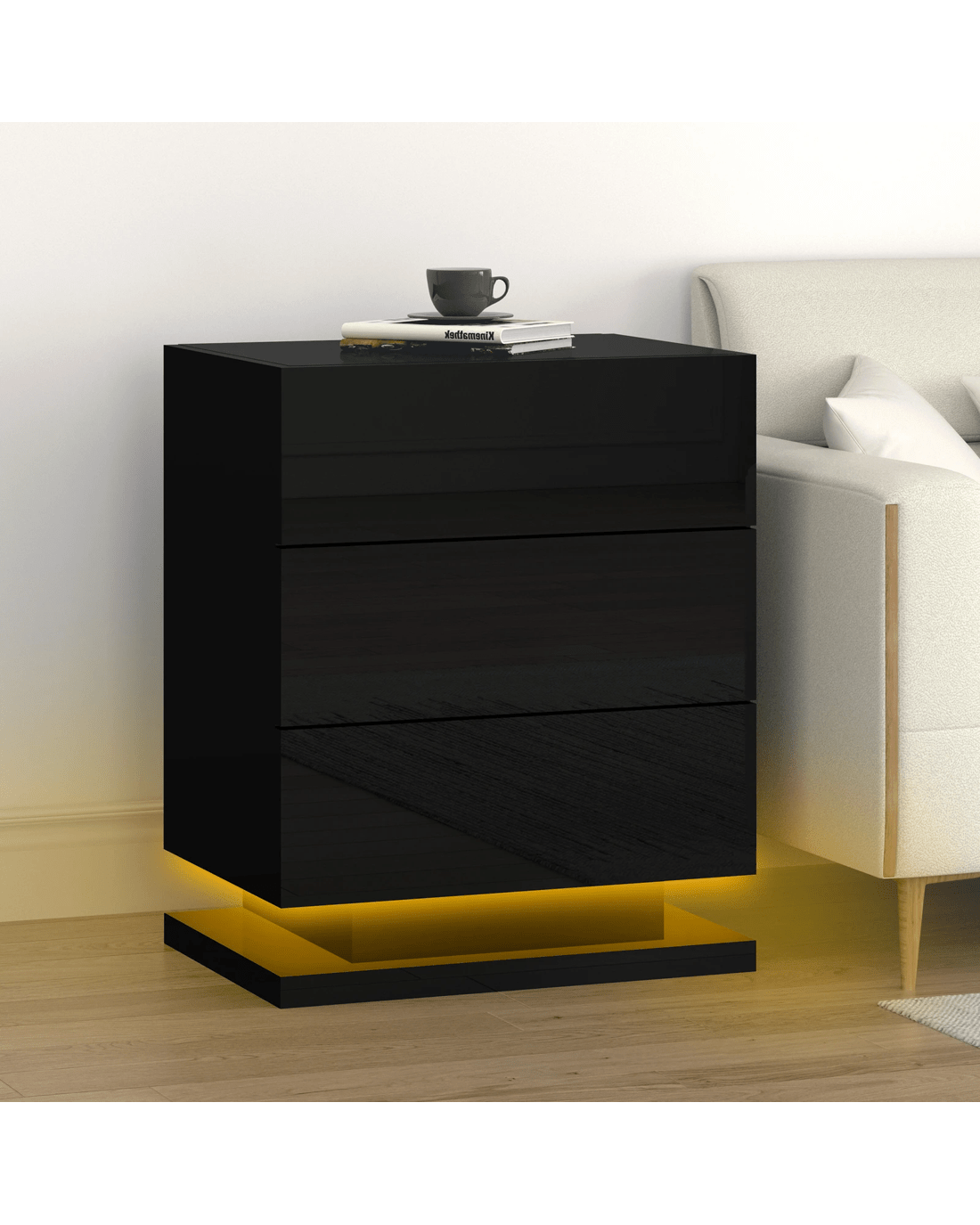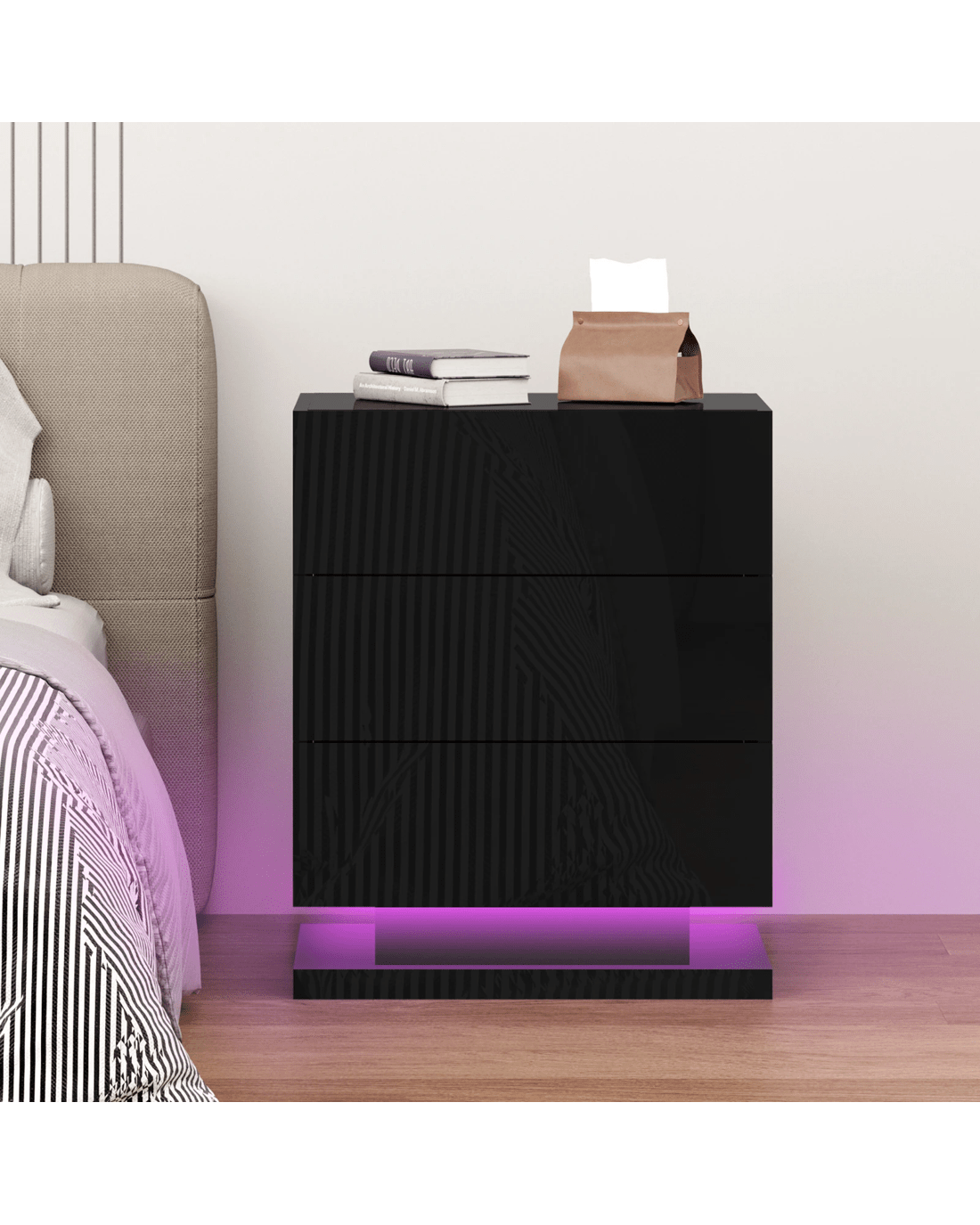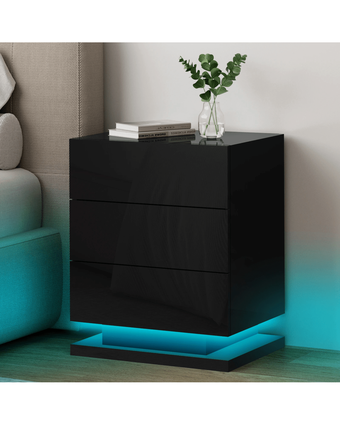 The ALFORDSON bedside table provides a surface to place necessary items like a lamp, a laptop, a book or whatever you may want to keep close by the bed. It features 3 deep drawers to provide ample storage so those items can be stored in the drawers. Practicalities aside, this bedside table is also a key decorative element in your room. Our bedside table has gorgeous high gloss on 4 sides (top, front, right and left). It helps to enhance the feeling of space with its light-reflecting properties. It comes with LED lighting and a remote control for turning light on/off or changing light colour. You will find this LED lighting especially practical in dark.