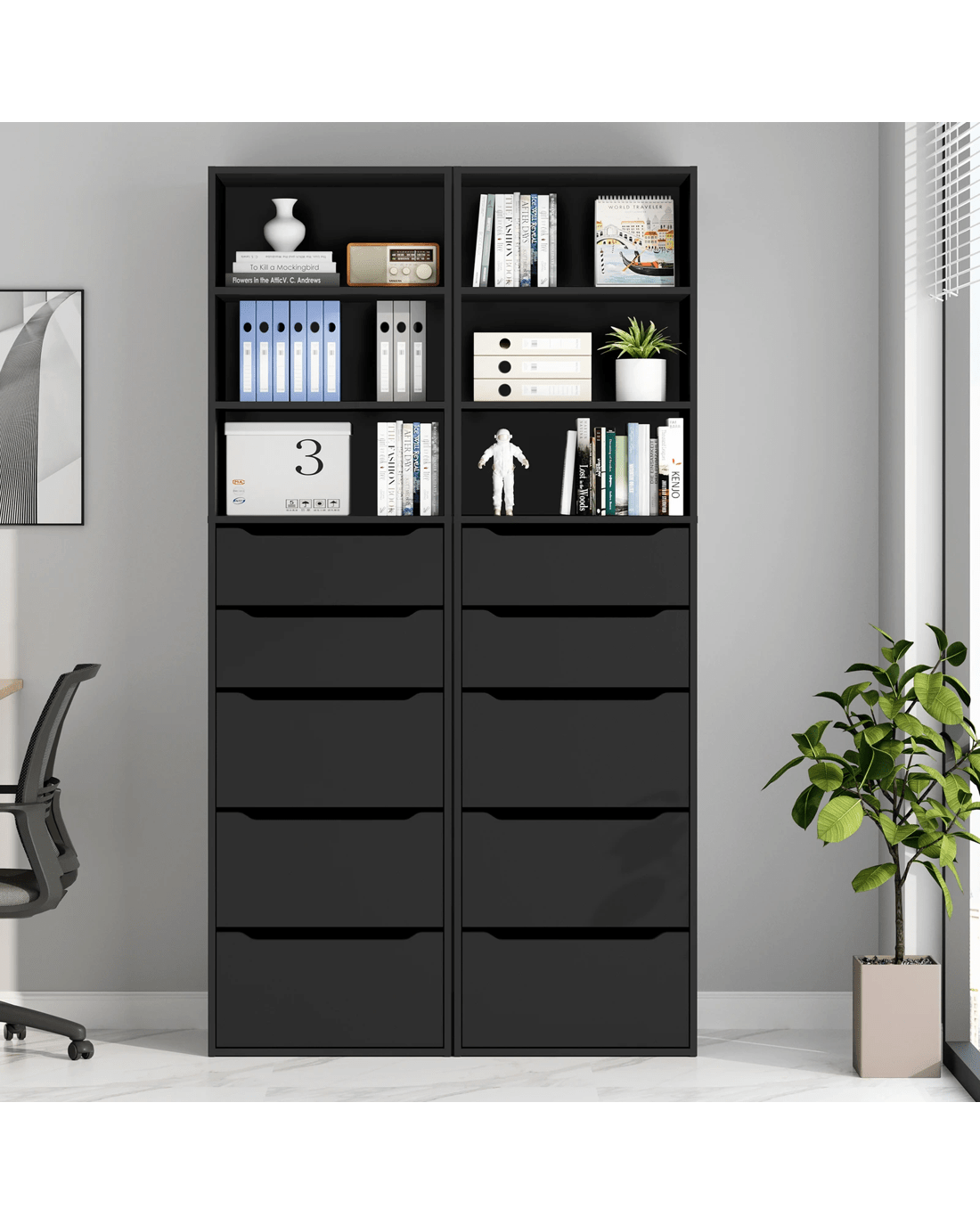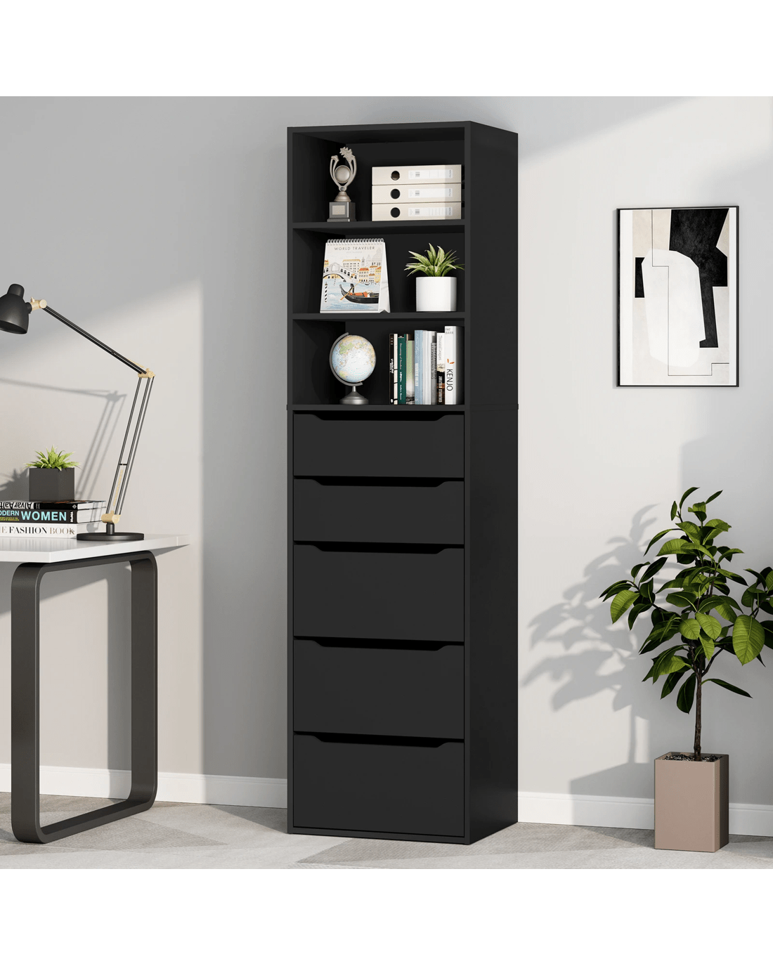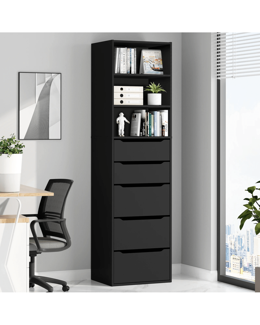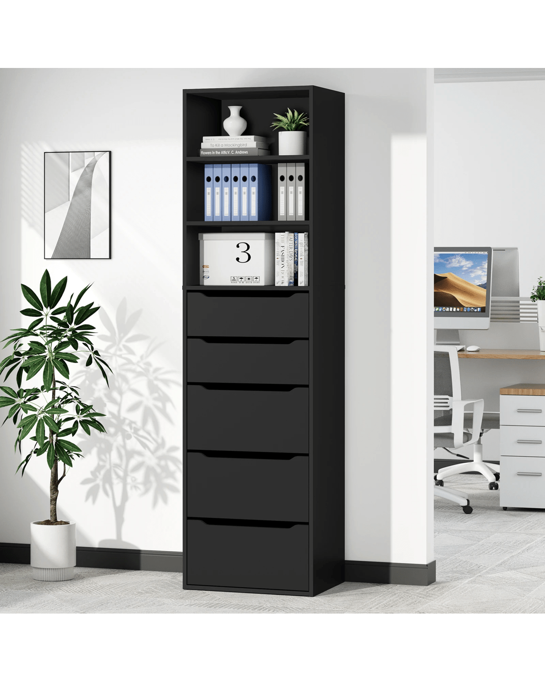 Abundant Storage - This well-designed office storage cabinet offers ample space with 3 open shelves and 5 drawers, keeping your workspace clutter-free and organized. The upper shelves provide quick access to frequently used files and items, ideal for those on the go, while the lower drawers are perfect for stashing confidential documents, stationery and other essentials.