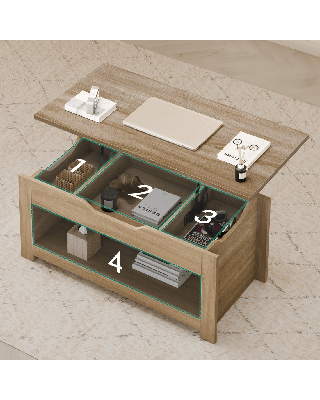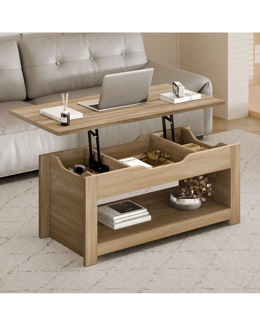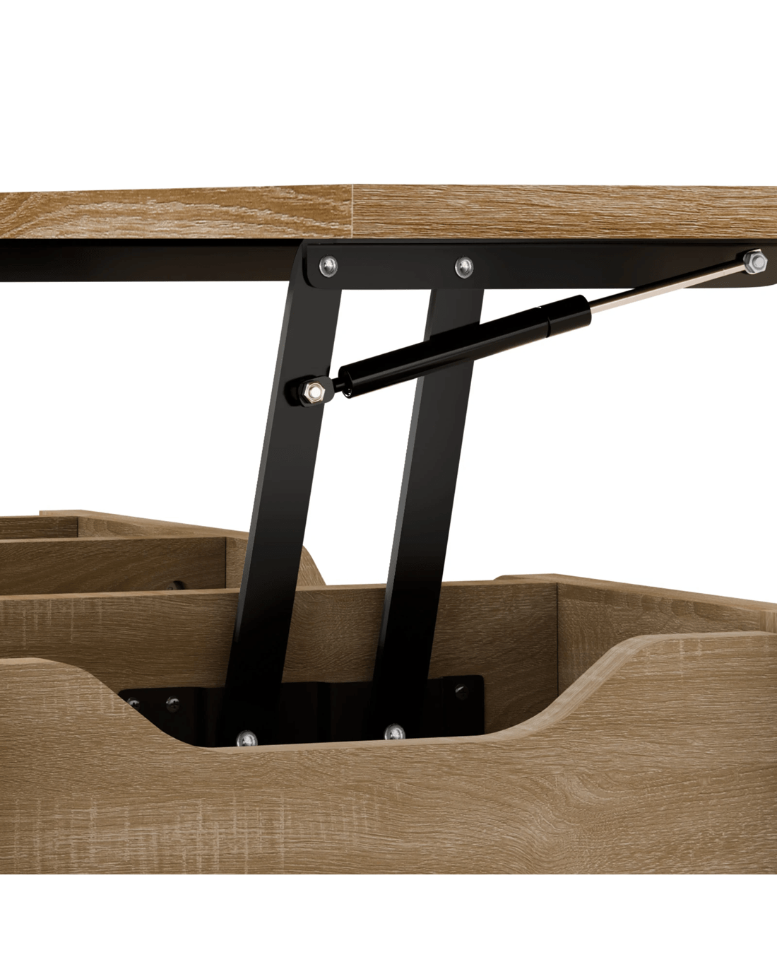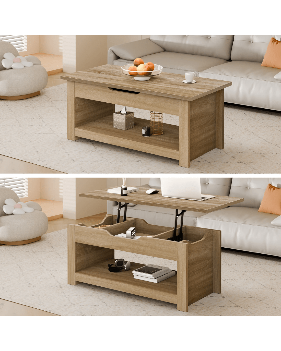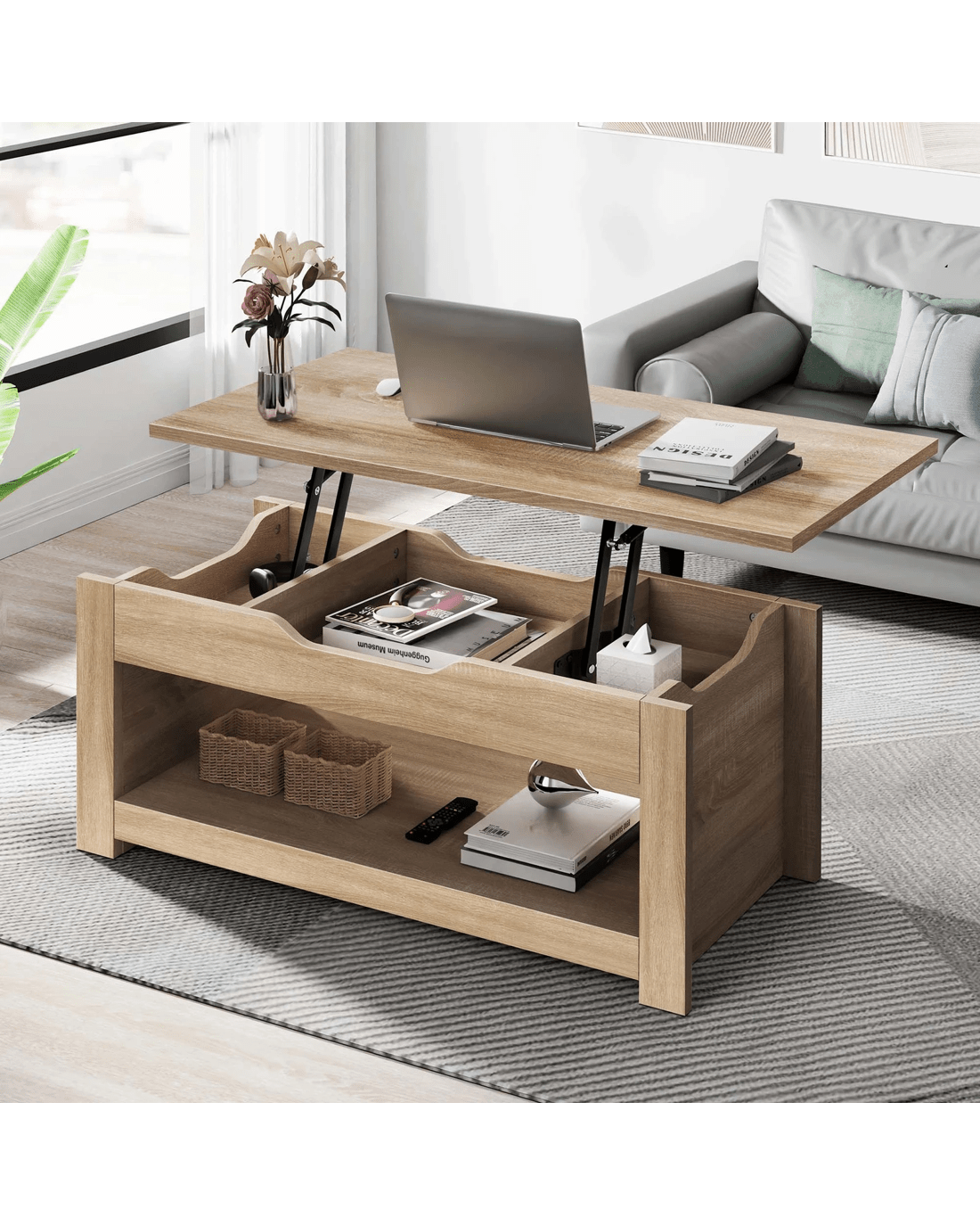 Along with enhancing the aesthetic of the space, this coffee table provides ample storage option for daily essentials. The wide tabletop is just the right place for laptop, remotes and a cup of coffee. Under the lift-top, 3 hidden compartments offer a discreet way to store items like magazines, books, or devices, while the generous open shelf underneath acts as additional storage for items easily accessible.