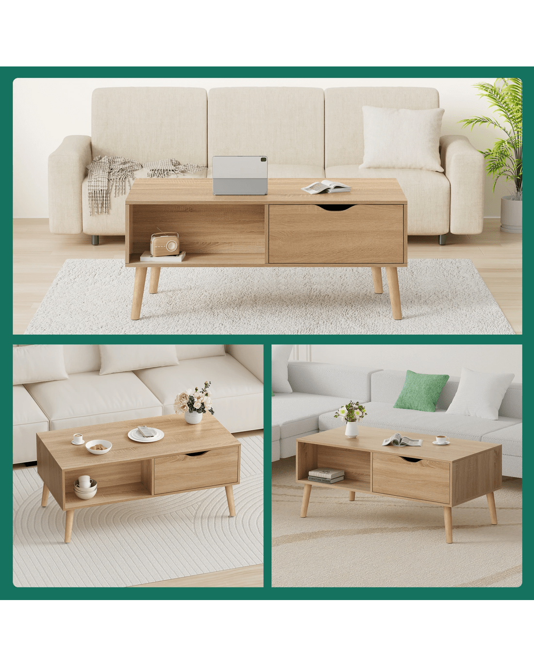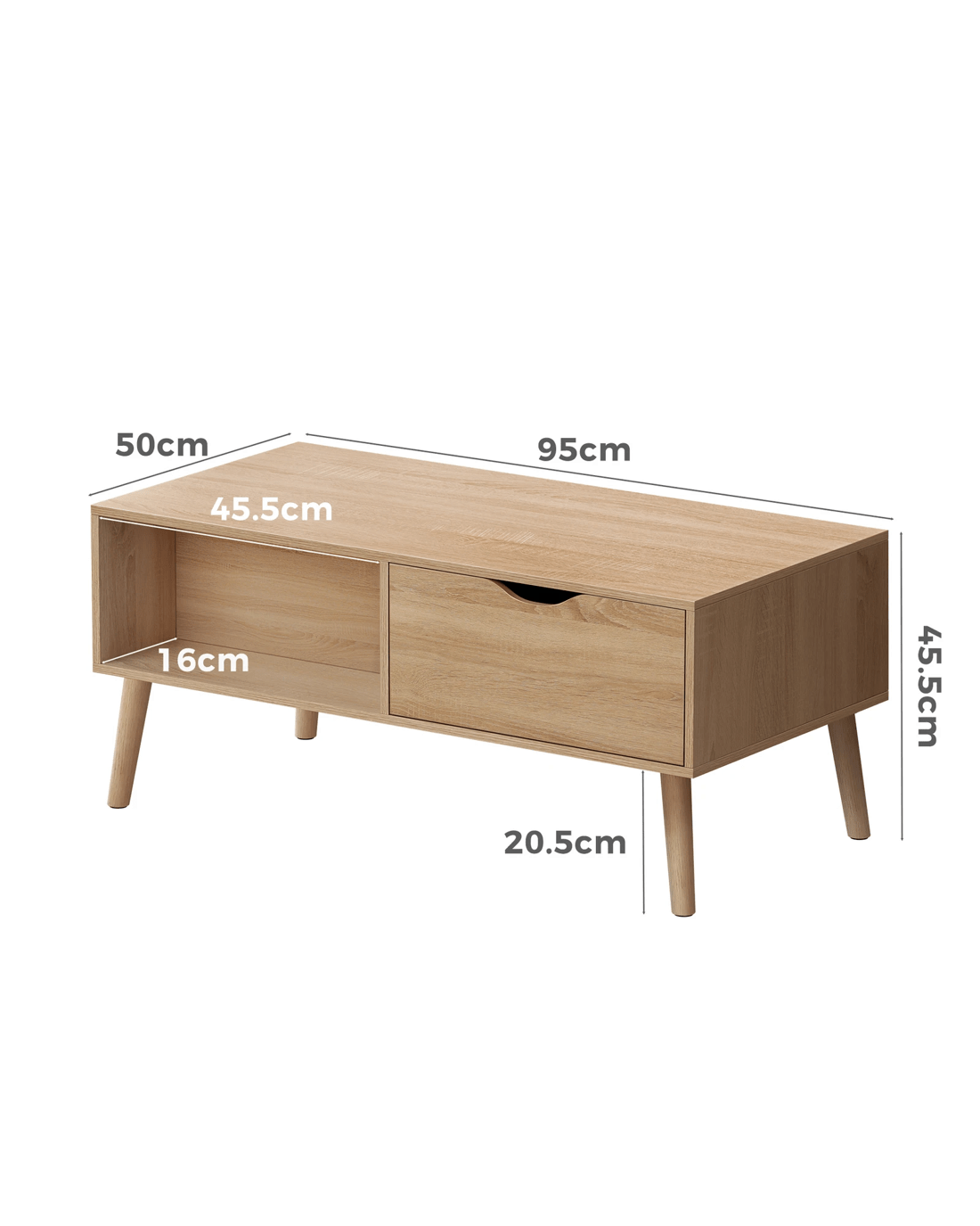Crafted from superior E1 grade and 12mm thick particle board, our coffee table is designed to be highly durable. Unlike some other sellers, we have no compromise on materials used. Well made with melamine finish, it is waterproof, anti-scratched and easy to maintain and clean. Supported by sturdy wooden legs with non-slip foot pads, this coffee table can hold up to 50kg capacity, ensuring strong stability and durability.