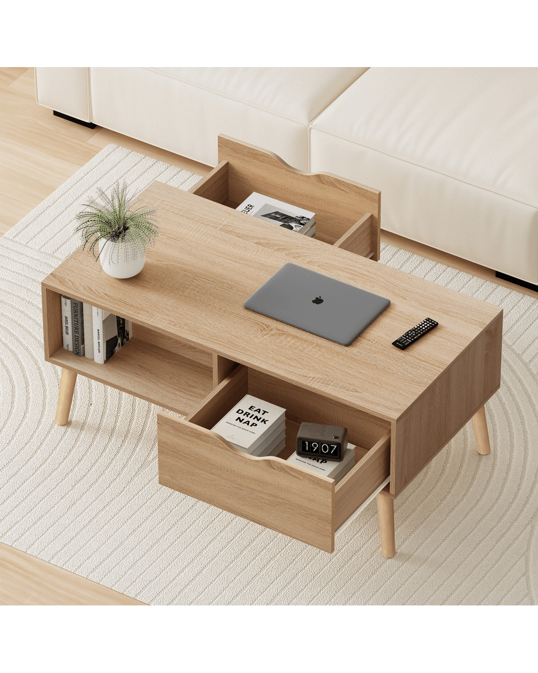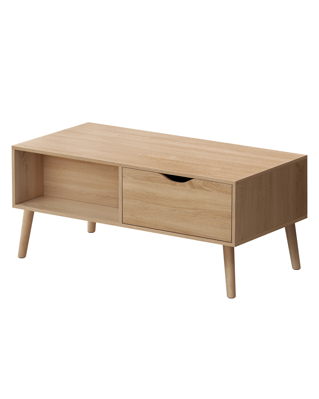 Along with enhancing the aesthetic of the space, this coffee table provides ample storage option for daily essentials. The wide tabletop is just the right place for tissue box, drinks, remote controls and home decor. Featuring 2 ample drawers and 2 open shelves on both front and back sides, it offers a discreet way to store items like magazines, books or devices, while the shelves are additional storage for items easily accessible.