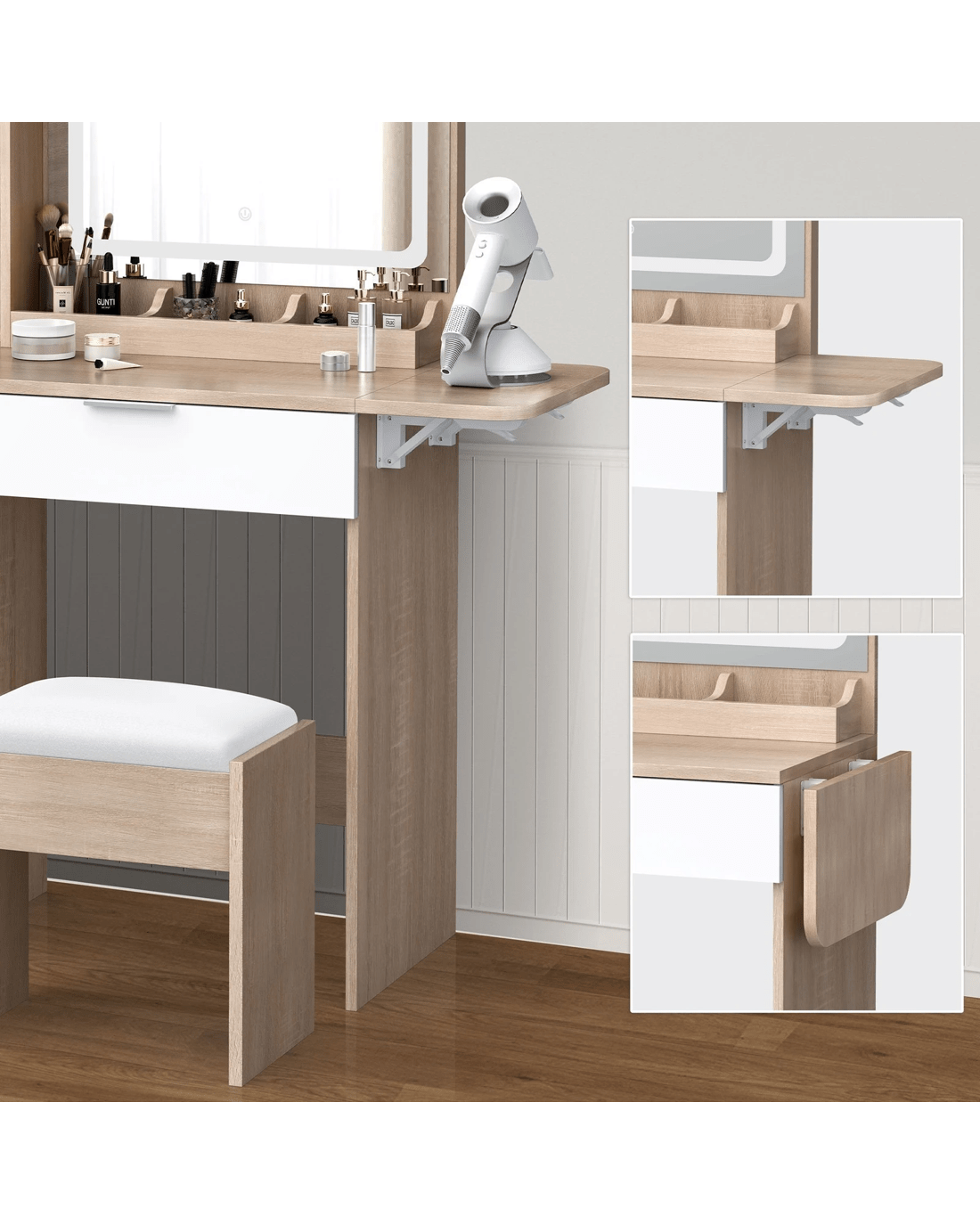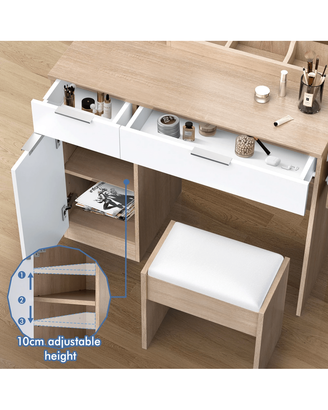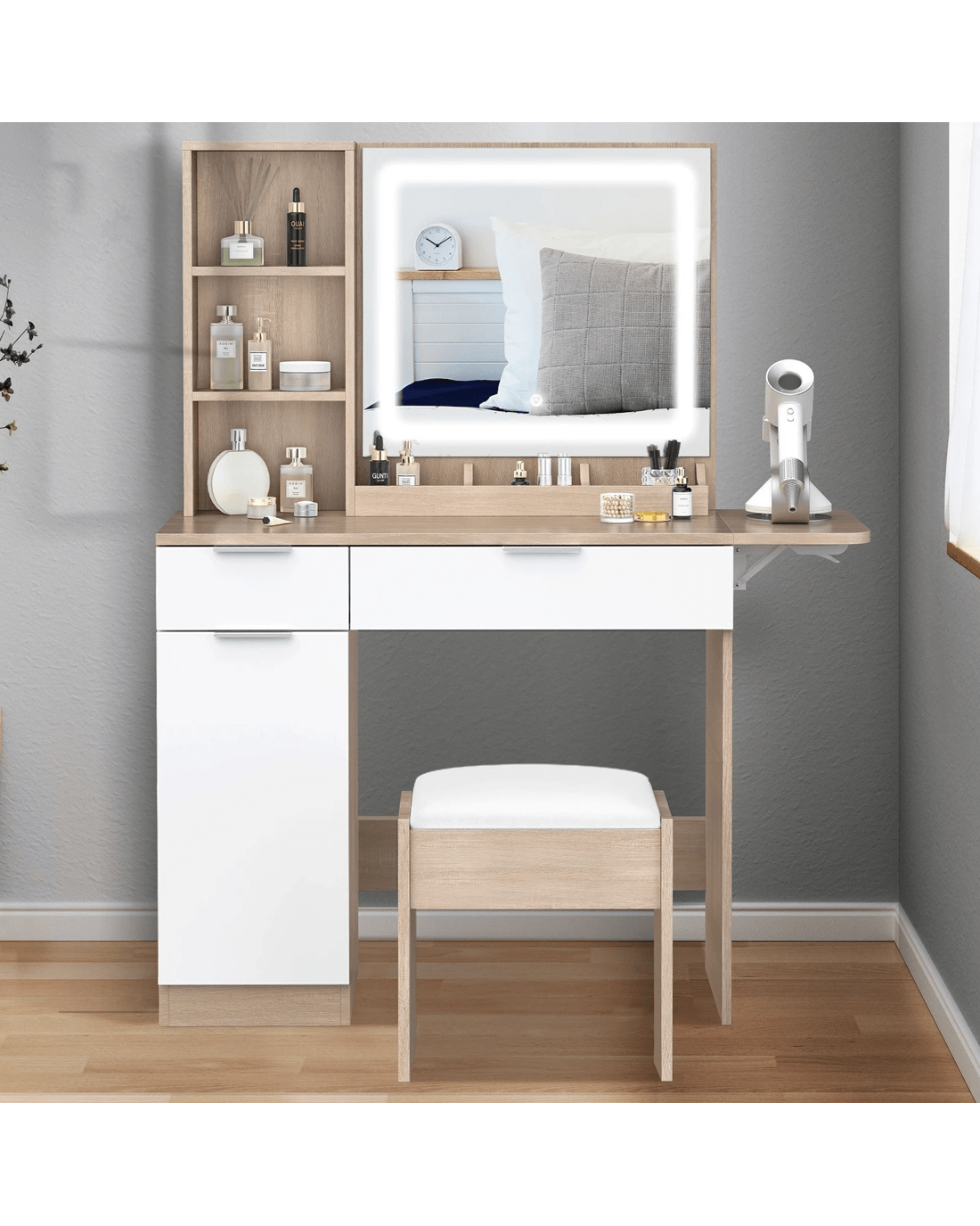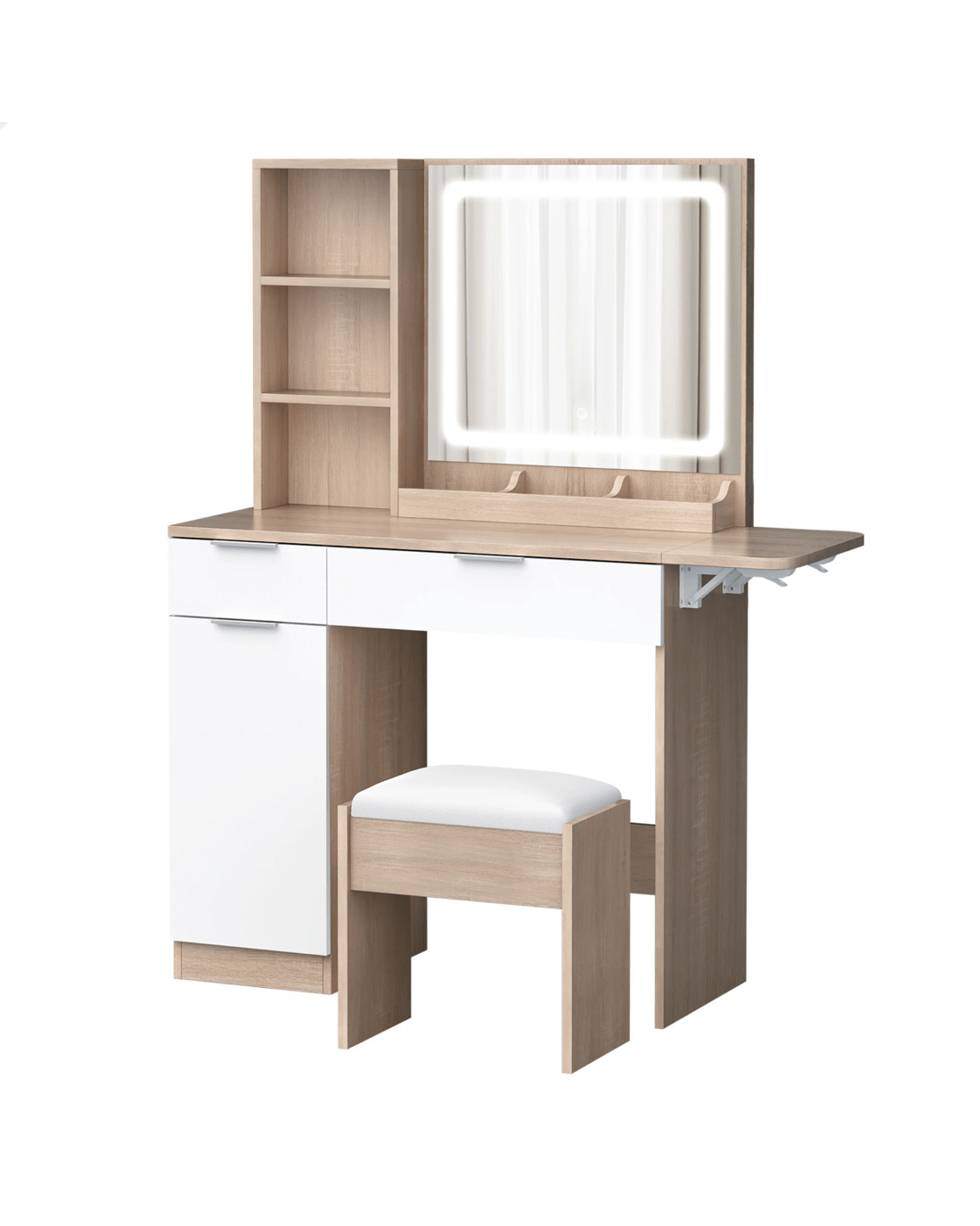 Keep your items organized - This dressing table features 2 drawers, 6 shelves in different sizes and a side cabinet for various storage options. For items you want to access easily, like make-up products, lotions, or perfumes, you can simply put them on desktop of table. For other items, like jewellery, you can store them away in drawers and cabinet so they won't gather dust. With remarkable convenience, there is a drop-leaf countertop which is easily extended for placing your hair-dryer or folded up when not in Use - p;providing flexibility in your beauty routine.
