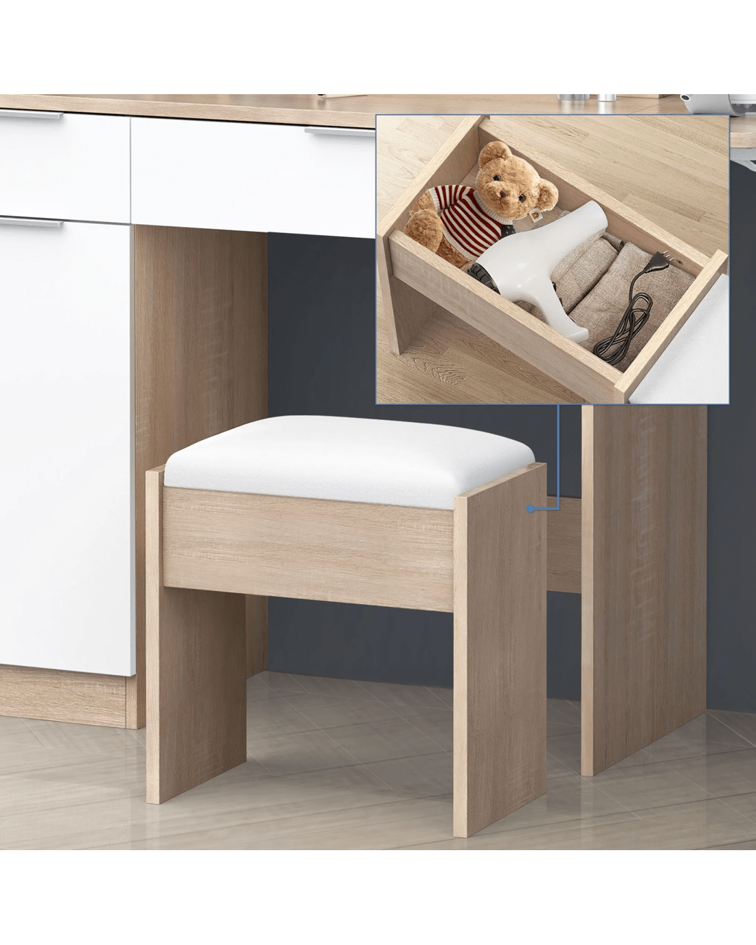 Comes with matching chair - The matching upholstered stool will provide you with a comfortable sitting position while applying make-up. Furthermore, the chair comes with lift-up lid for easy storage, which is a perfect spot for your blanket or any daily necessities.