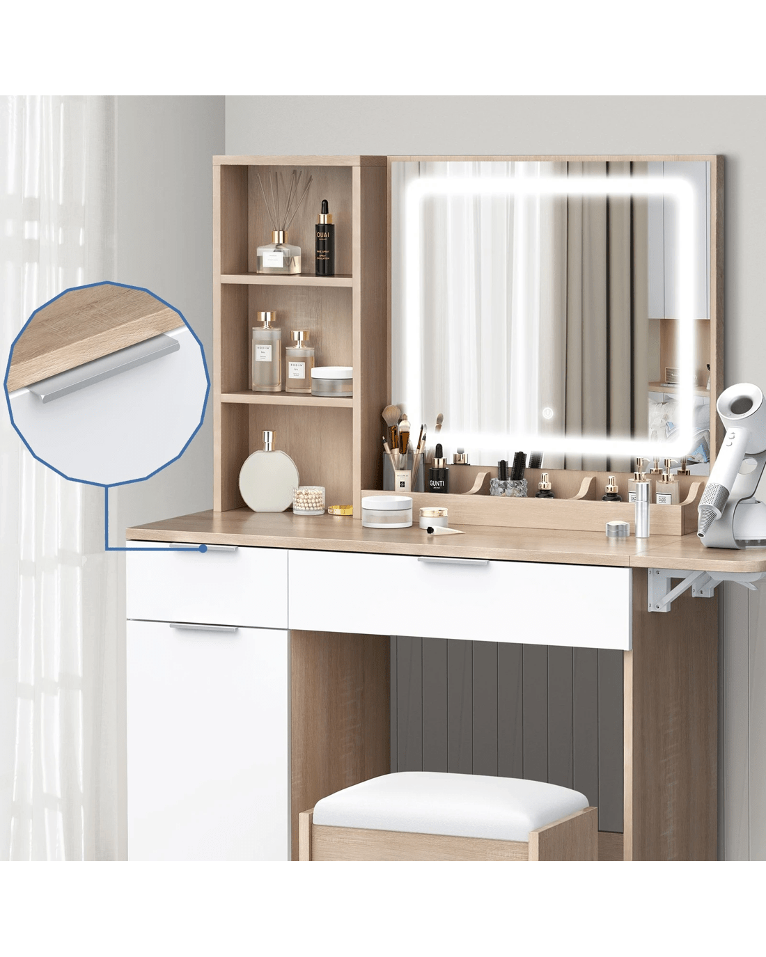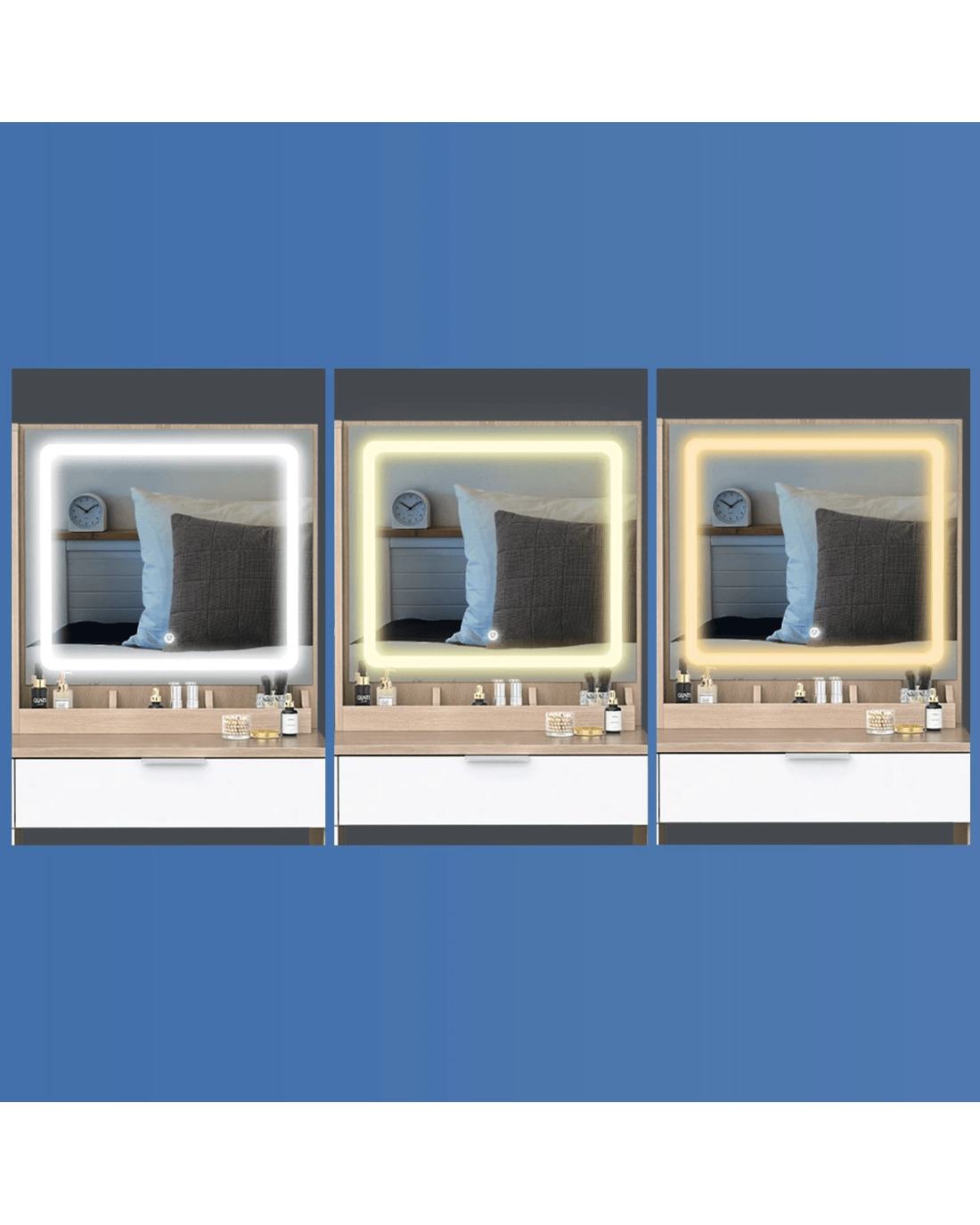 Customizable lighting - Good lighting is important to achieve your perfect glam look. The dressing table features 3 LED light colours - neutral white, warm white, and daylight white and the brightness of each colour can be adjusted in 10 levels, providing adequate light to complete your make-up.