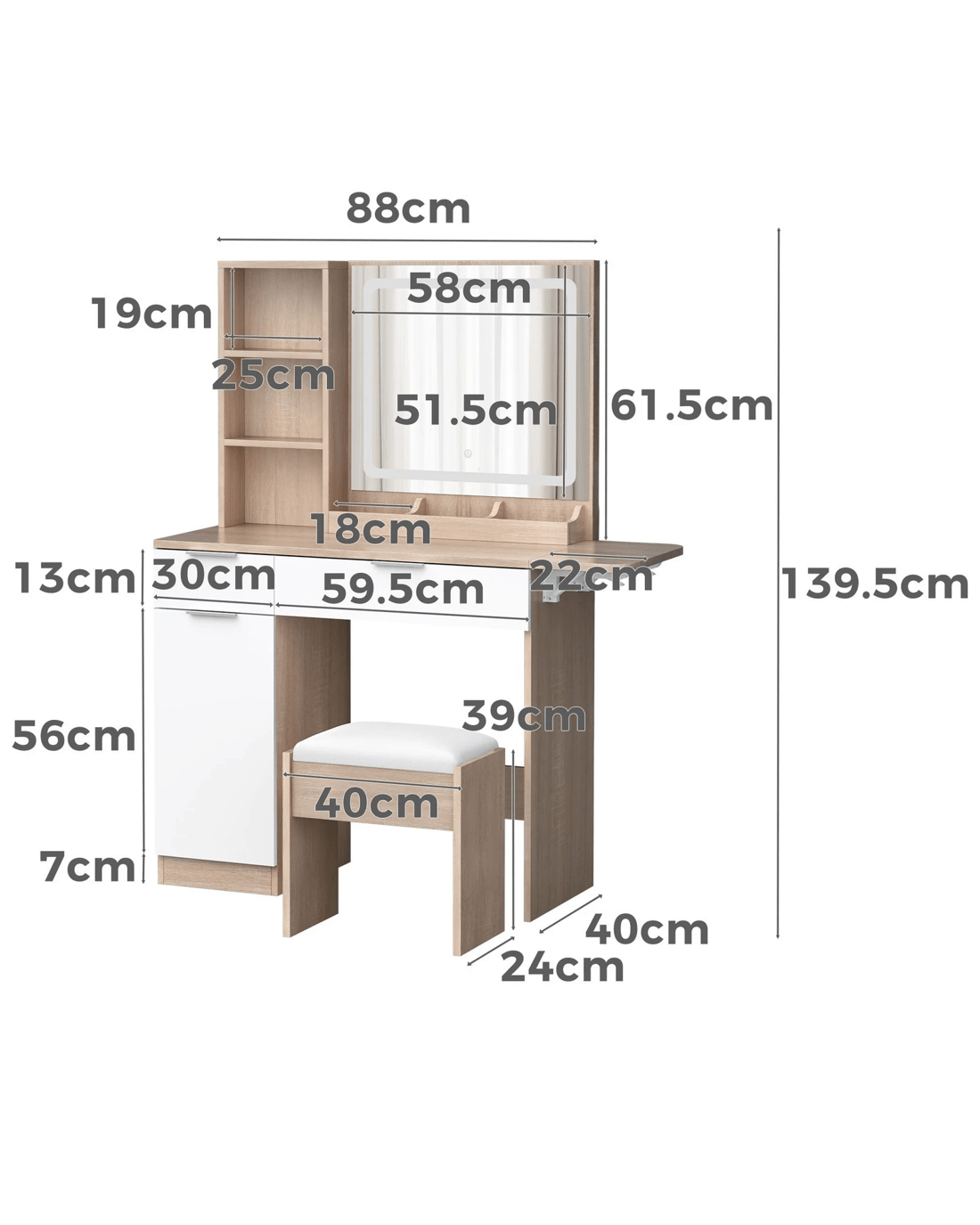 Alfordson Dressing Table Stool Set LED Vanity Desk Makeup Mirror Drawers - Oak