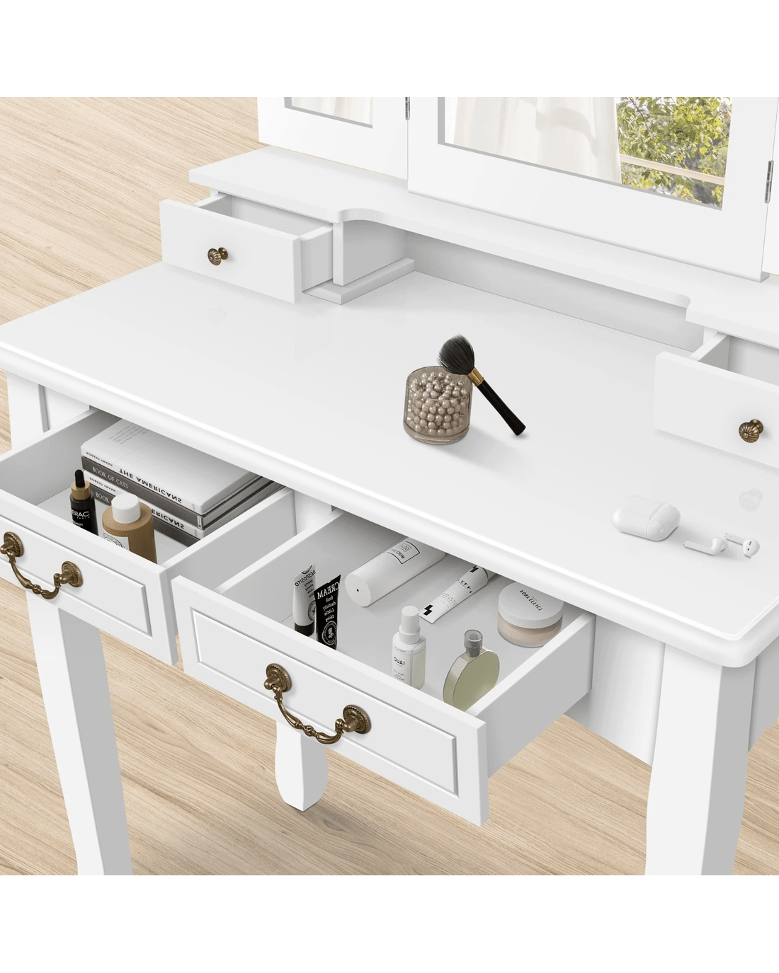 Keep your items organized - It features 4 drawers in different sizes and open shelf for various storage options. For items you want to access easily, like make-up products, lotions, or perfumes, you can simply put them on desktop of table. For other items, like jewellery, you can store them away in drawers so they won't gather dust.